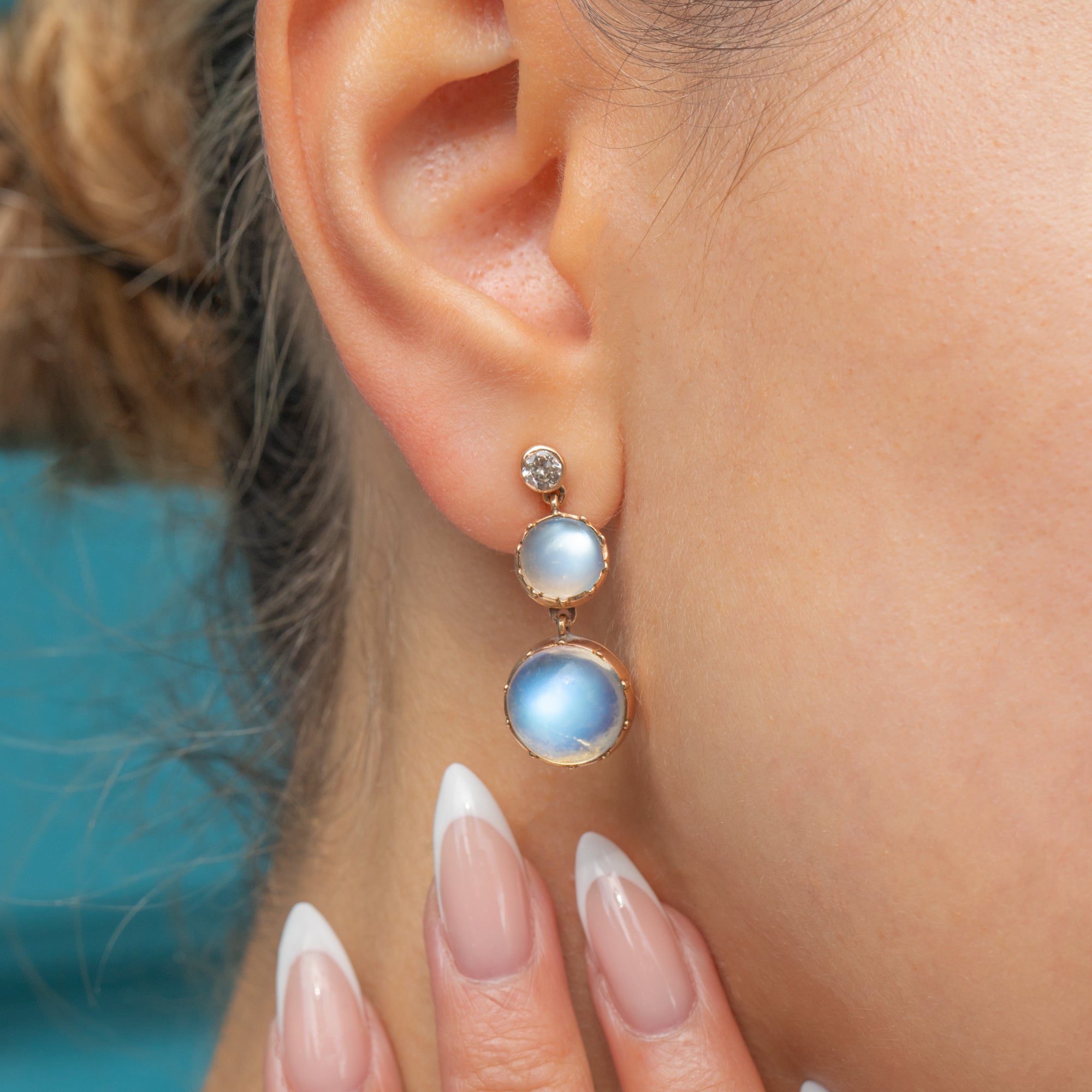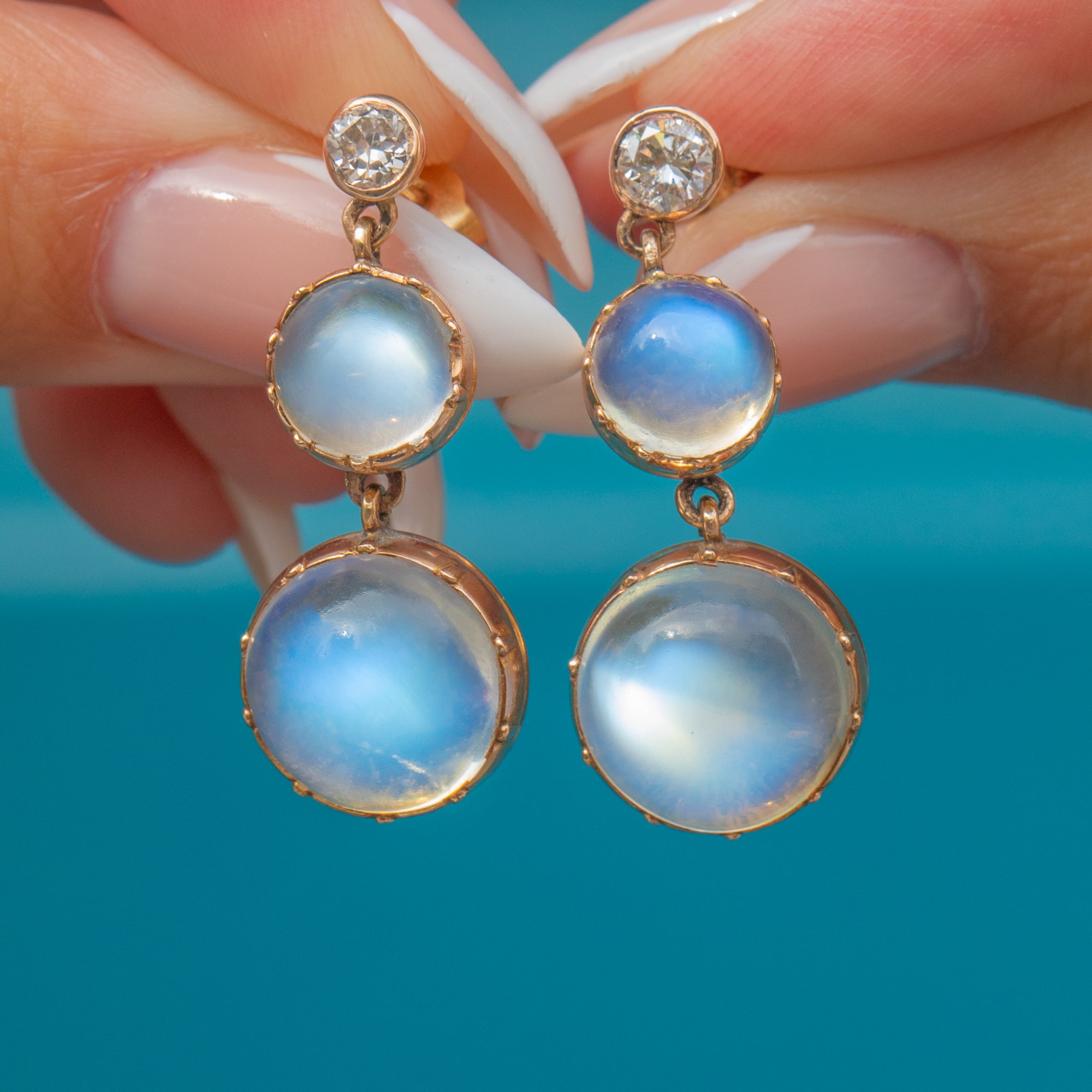 A luminous pair of Victorian drop earrings, each set with glowing Moonstones and accented by sparkling Old European Cut Diamonds. The Moonstones display a magical blue adularescence, glowing from within as the light shifts across their high-domed cabochons. Their ethereal beauty is perfectly offset by the crisp sparkle of the Diamonds above.