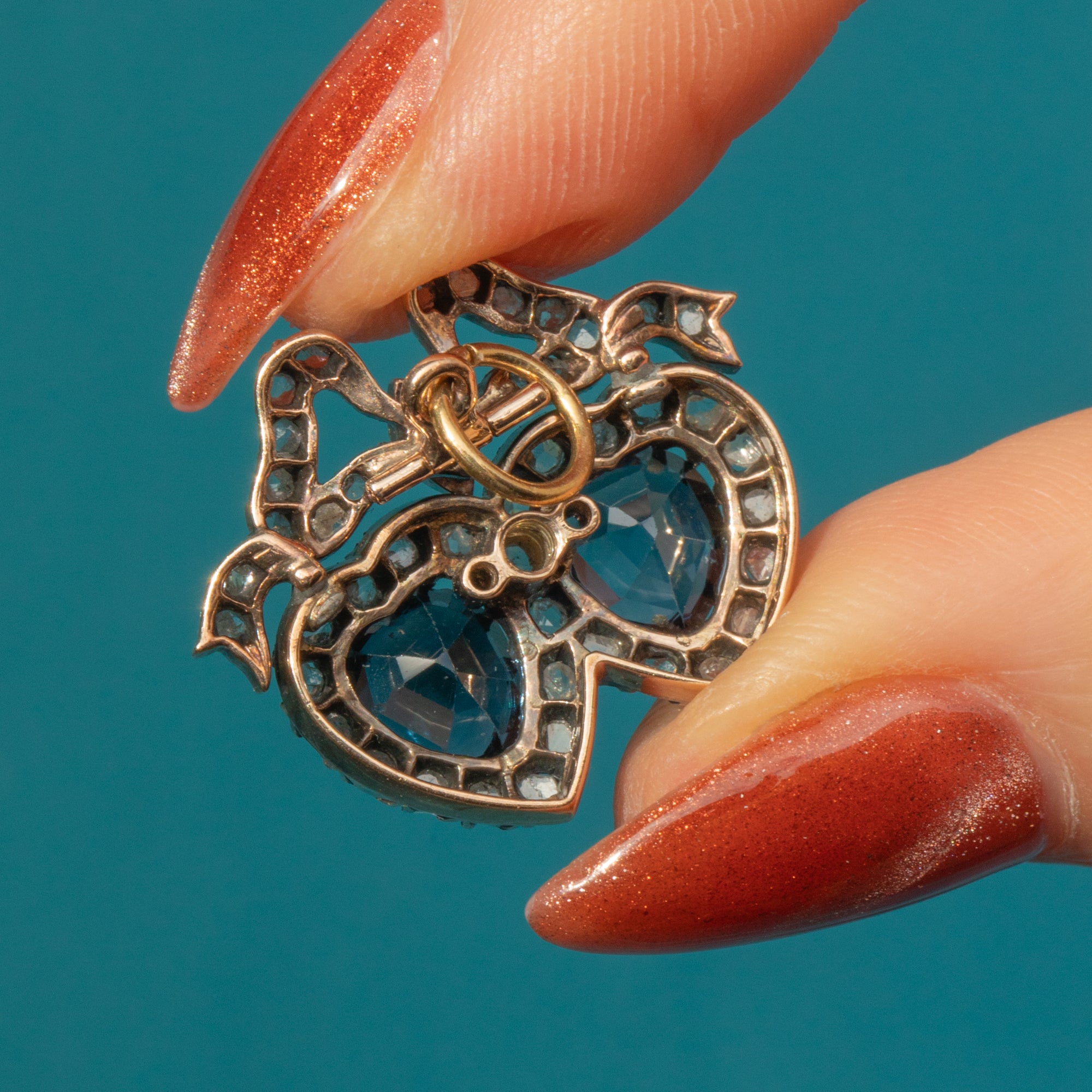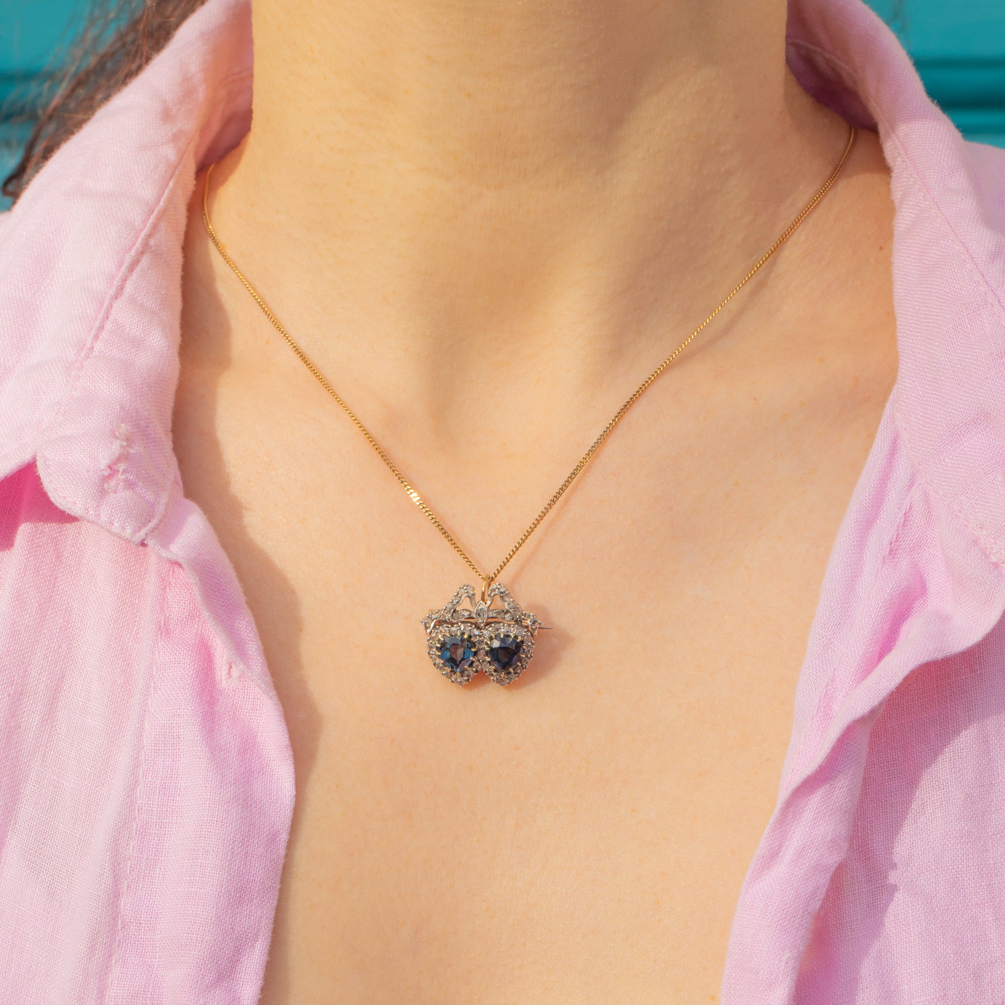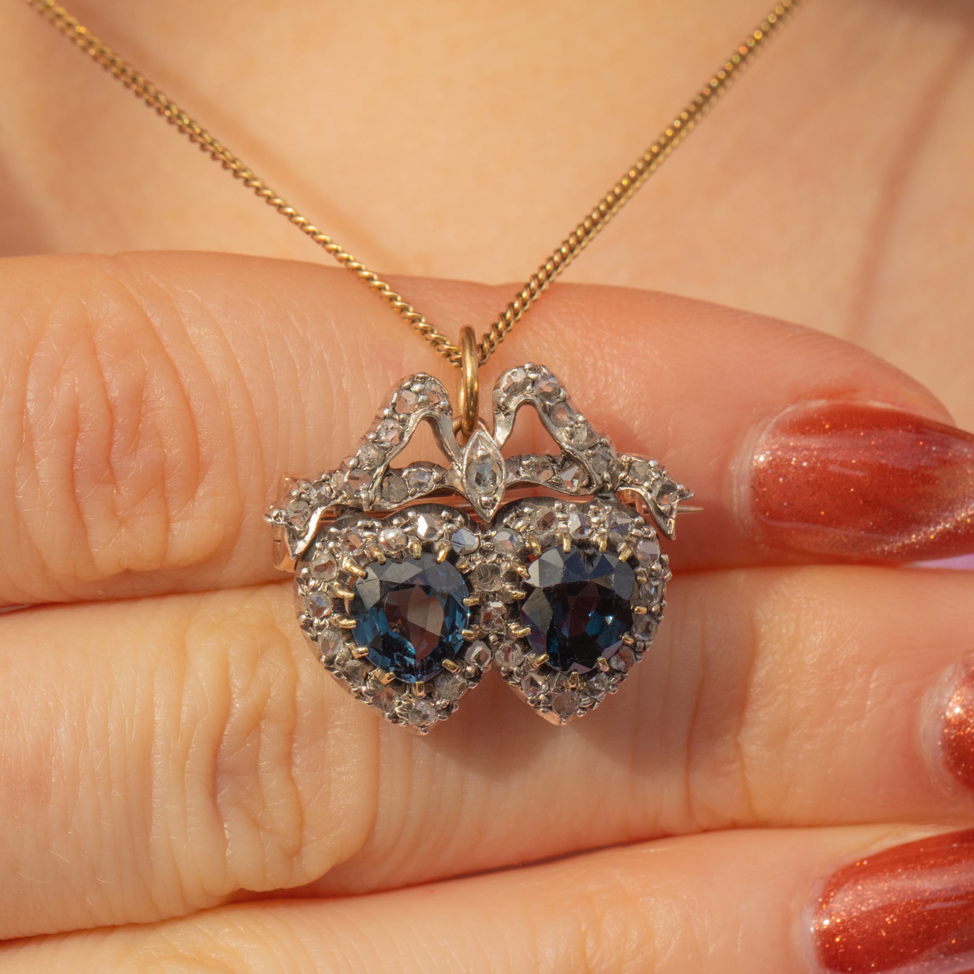 VERY GOOD-EXCELLENT. This Victorian 15ct Gold Natural Sapphire & Diamond double heart pendant is in wonderful condition, with all gemstones securely set and the Gold and Silver retaining their original beauty. The Natural Sapphires each have a tiny fleabite, only visible under magnification, but this does not detract from their rich blue hue or overall brilliance. The rose-cut Diamonds remain bright, and the removable brooch fitting functions perfectly, making this a well-preserved and truly stunning piece of antique jewellery!