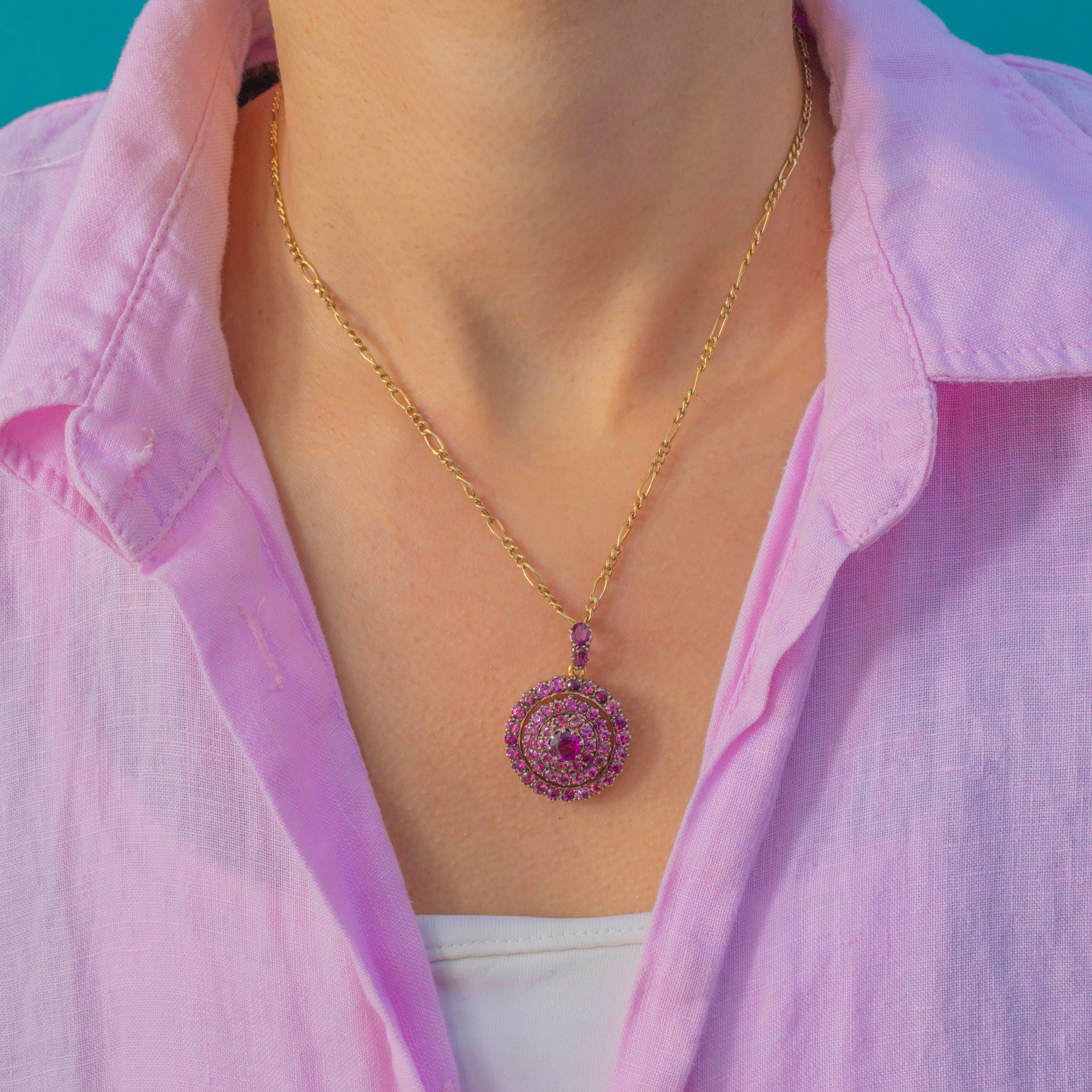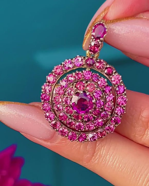 This striking Victorian target pendant, crafted in 15ct Gold with contrasting white Gold settings, is set with vibrant pink Tourmalines arranged in a beautiful circular formation. The saturated colour and crisp symmetry make it a wonderfully eye-catching mid-19th-century jewel.