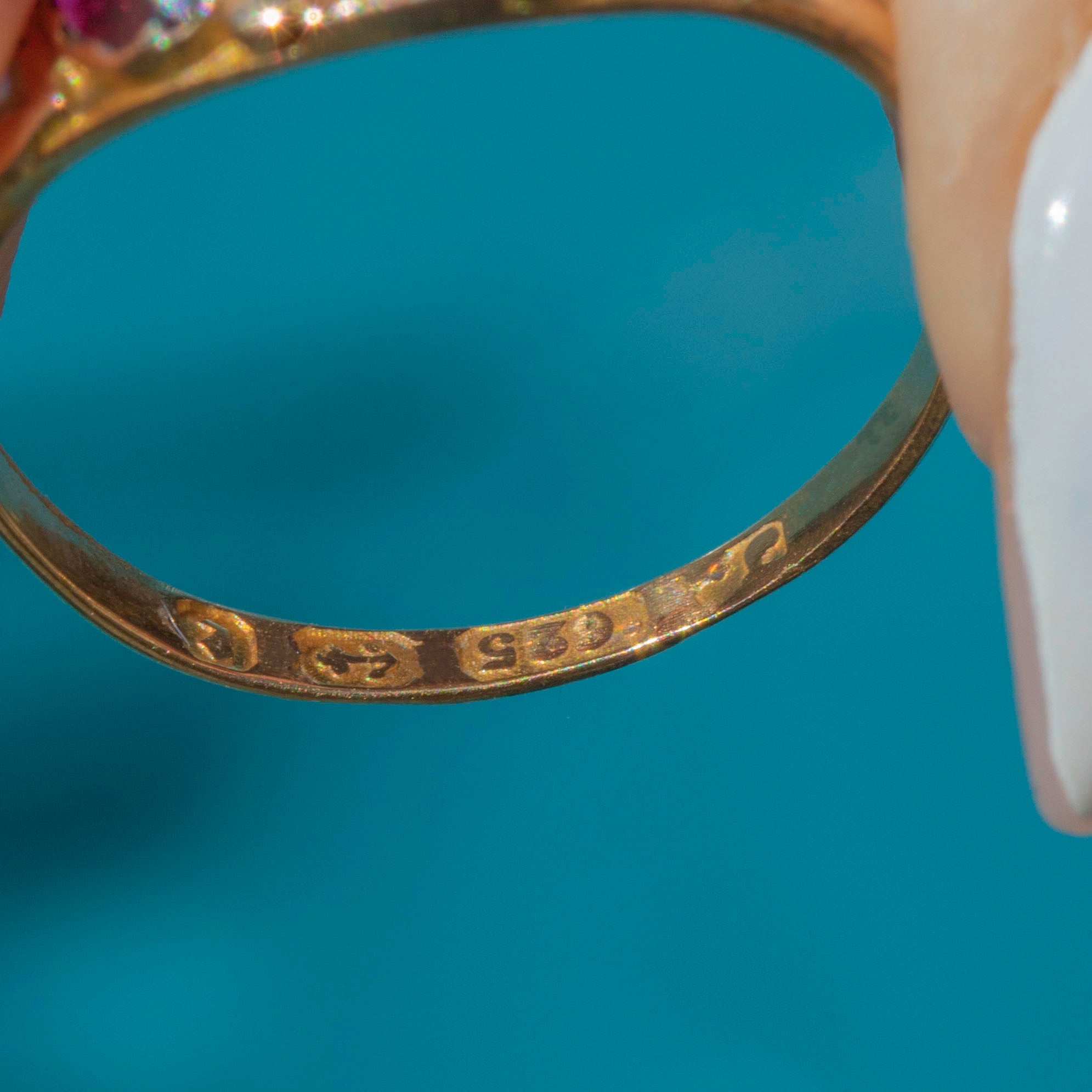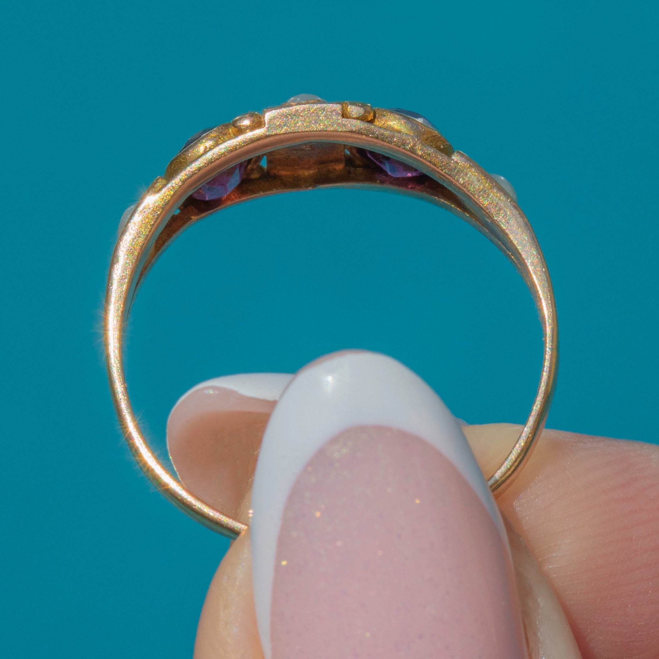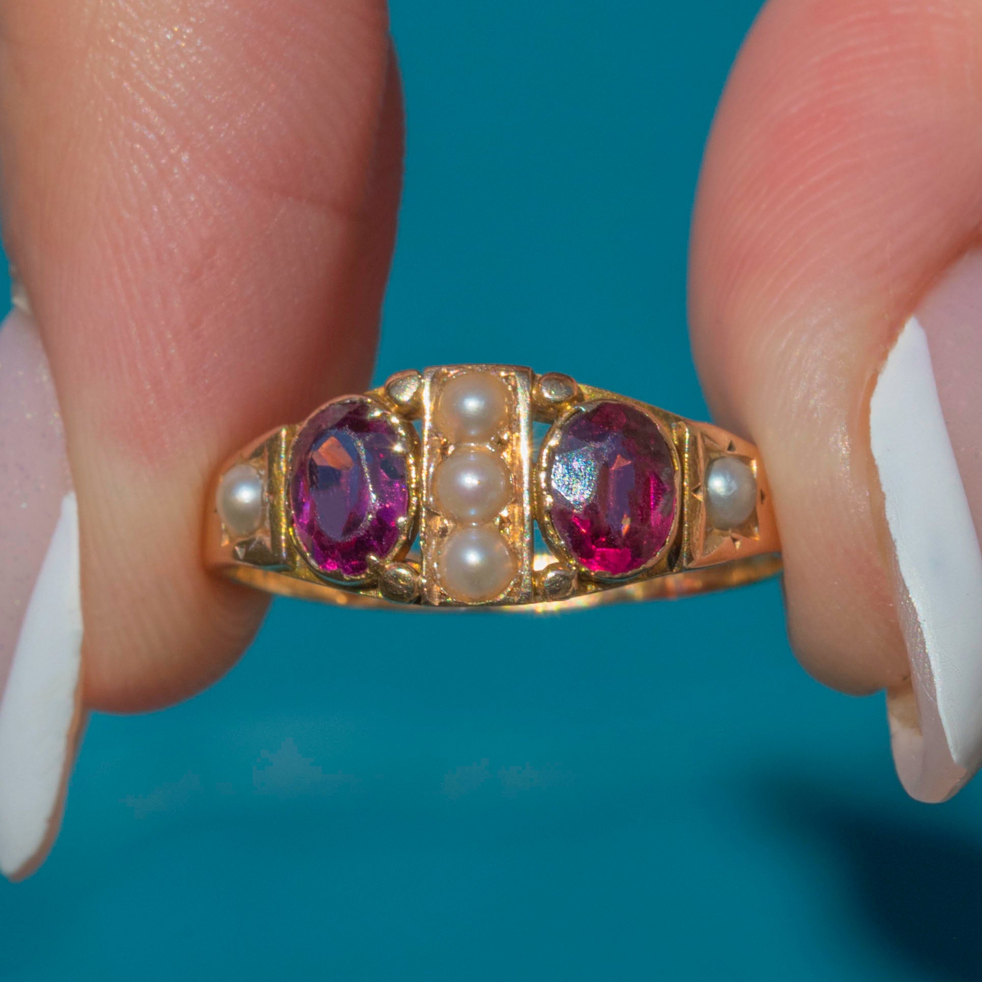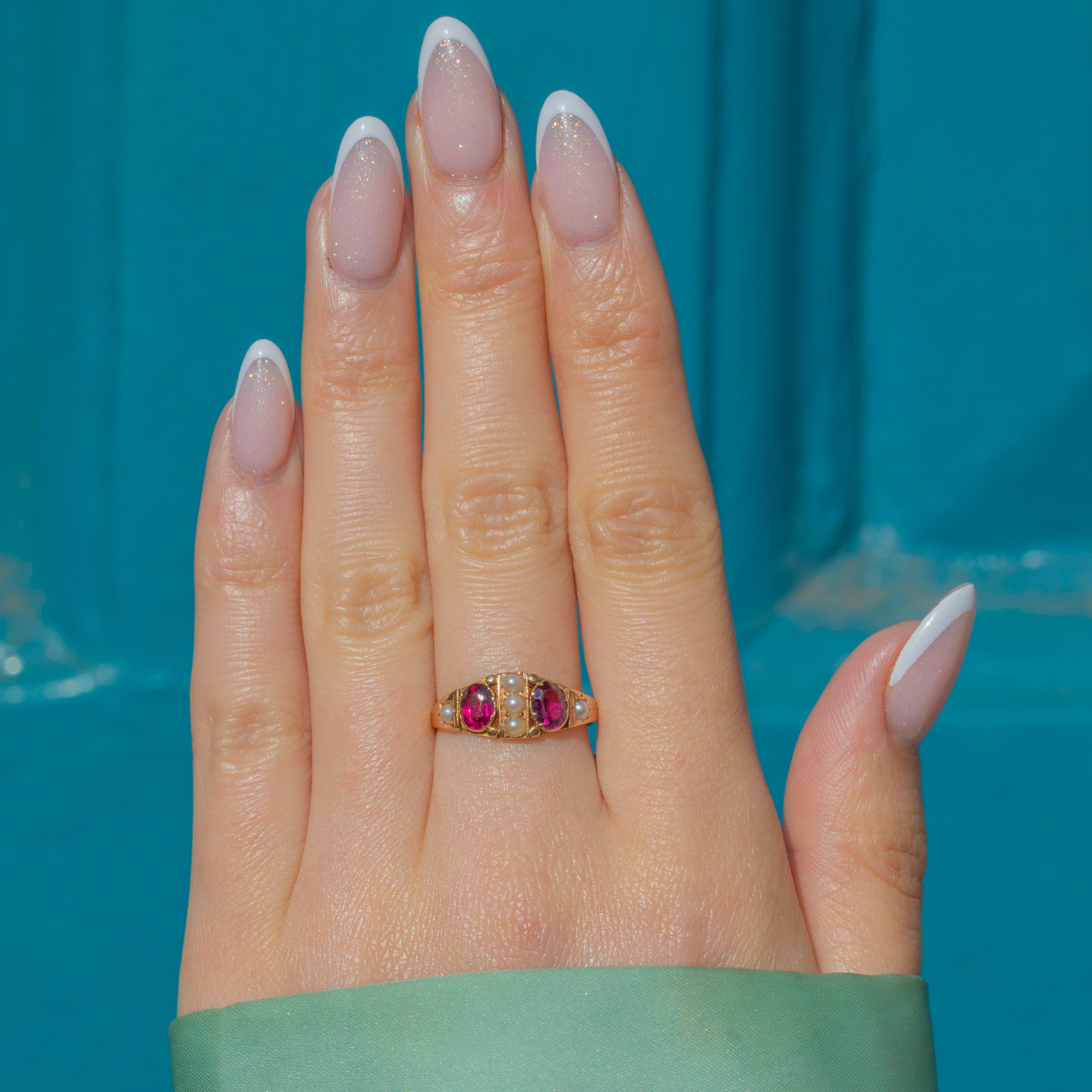 VERY GOOD: This Victorian 15ct Gold Rhodolite Garnet Pearl ring is in very good condition. The Gold is brightly saturated and the gemstones are all securely set. There is some mild age-related wear throughout, and a resize mark on the band, but this is only noticeable under close inspection and does not detract from the beauty of the piece. The ring has kept its form well and the hallmarks are fully legible, allowing us to accurately date this striking Victorian ring to 1879!
