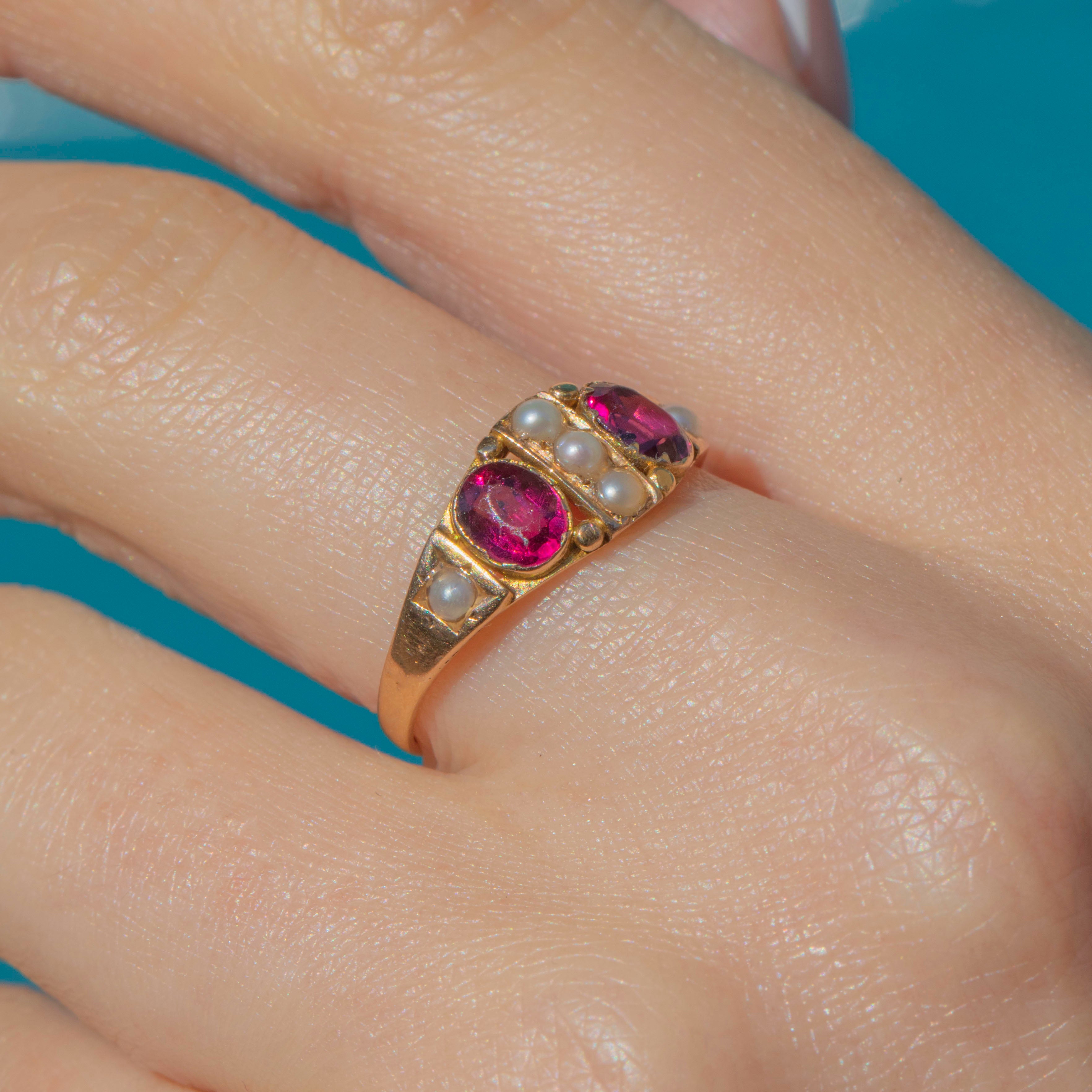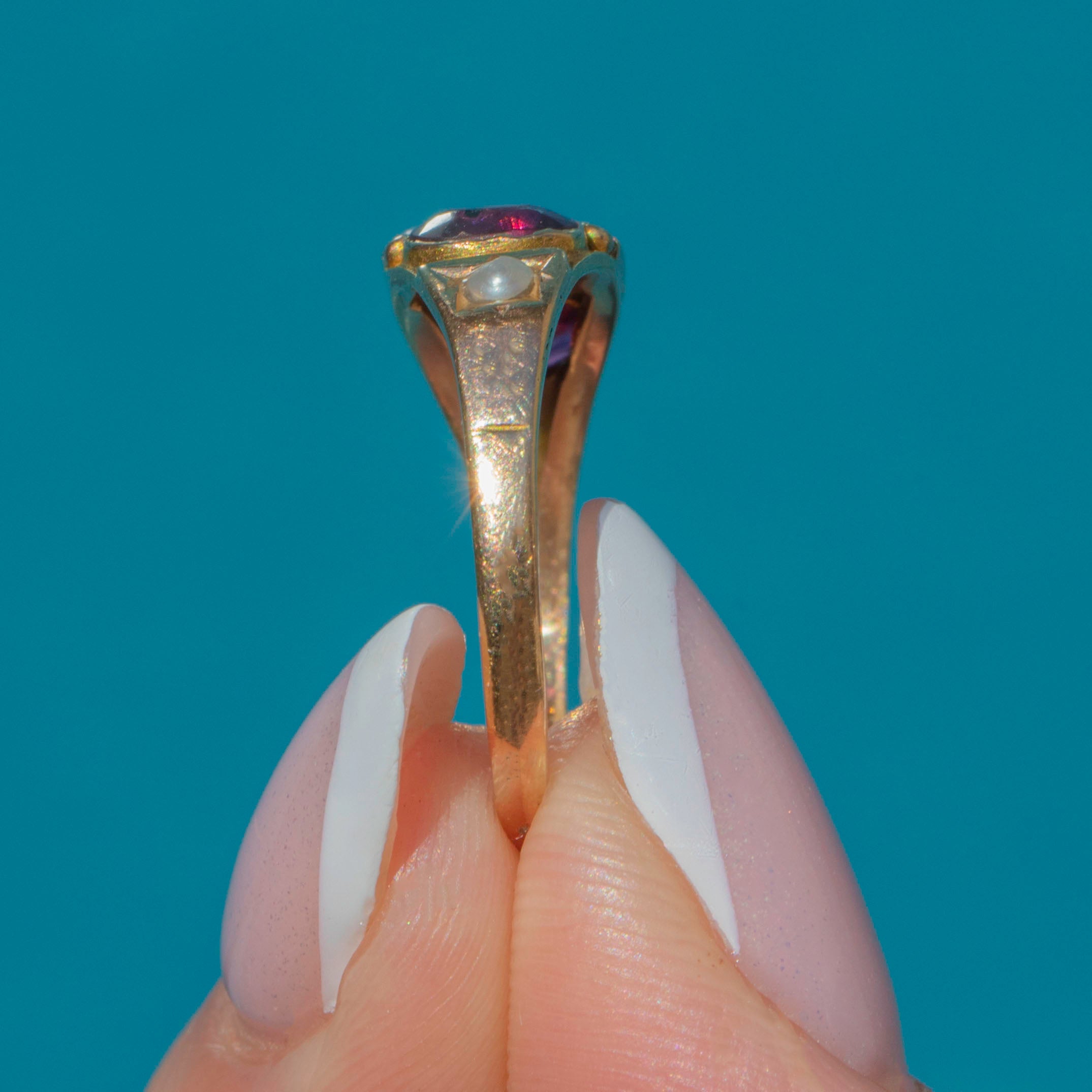 Victorian 15ct Gold Rhodolite Garnet Pearl Ring c.1879