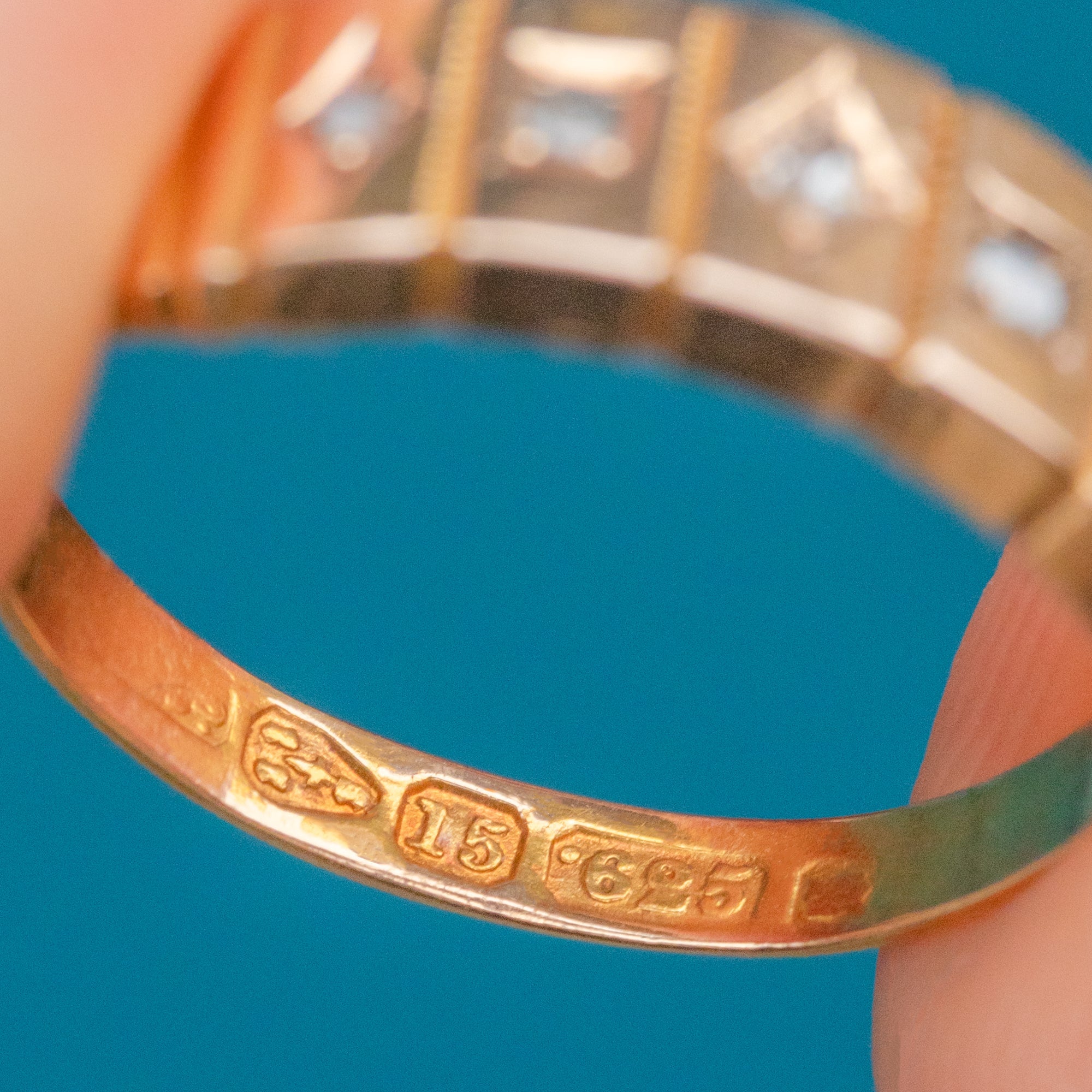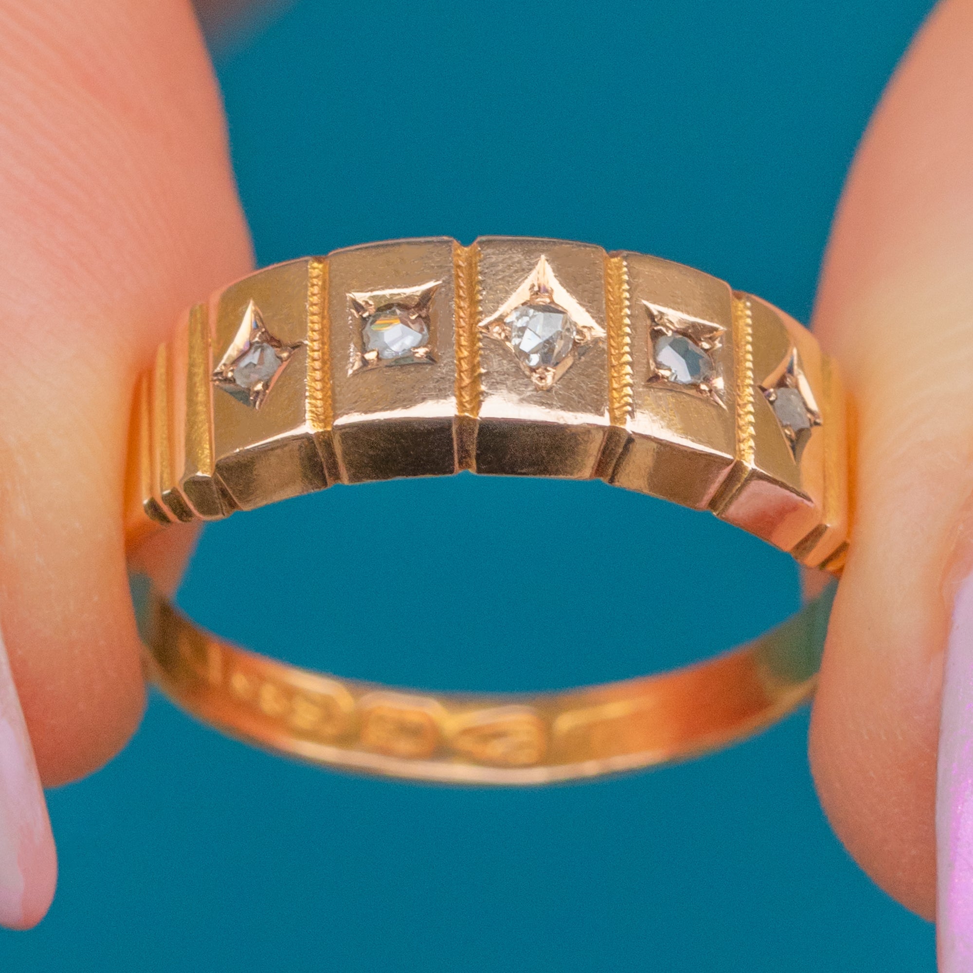 EXCELLENT: The Diamonds are bright, well-matched and securely set. The Gold retains a rich antique hue with only minimal surface wear. Hallmarks are slightly worn but still partially legible — a beautifully preserved Victorian ring.