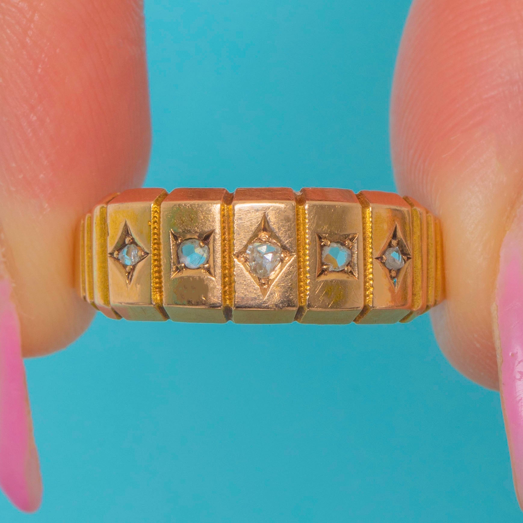 A charming Victorian “Gypsy” ring crafted in glowing 15ct Gold, set with twinkling rose-cut Diamonds that graduate gently across the front. The softly domed band and star-set Diamonds create a beautiful play of light, with a classic design that remains effortlessly wearable today.