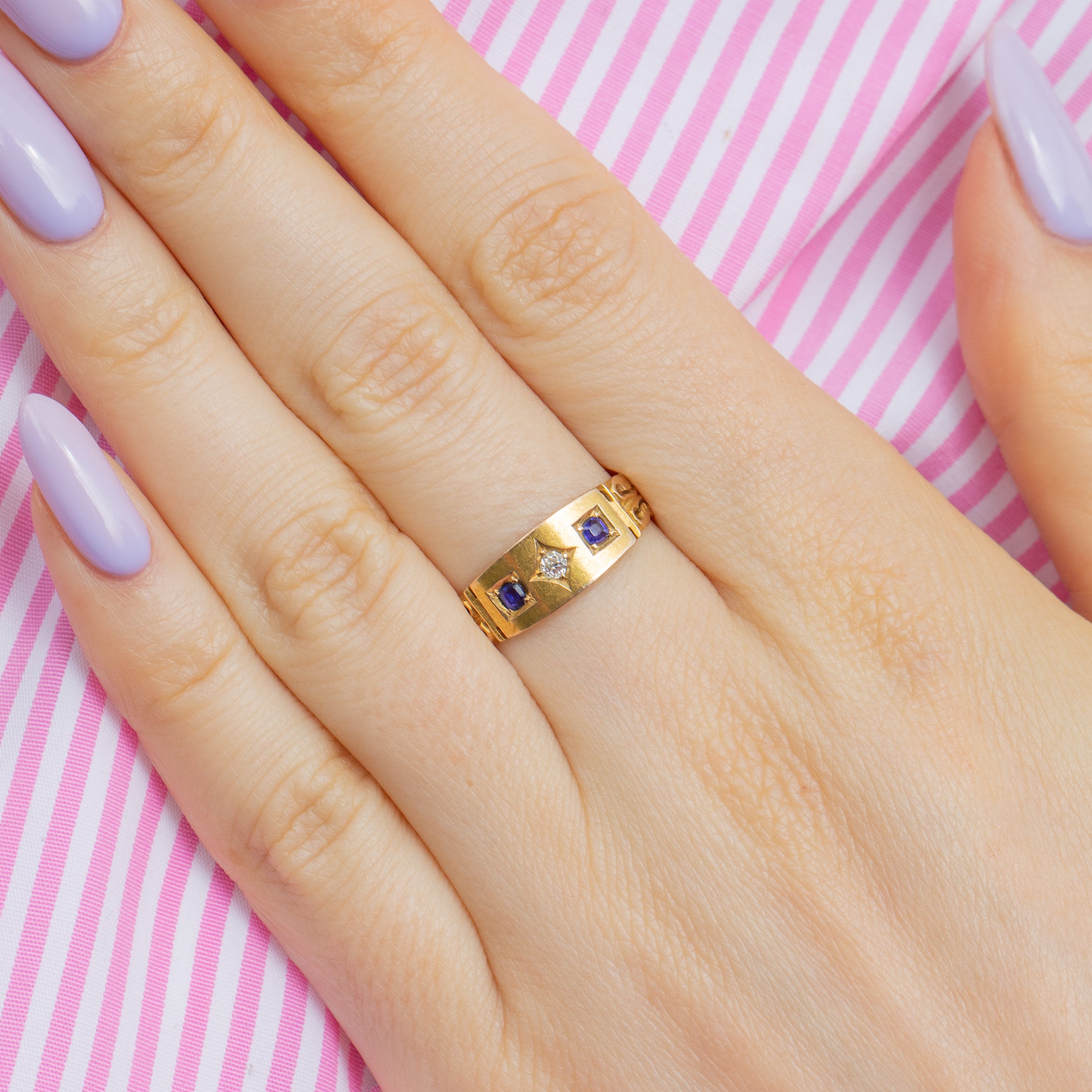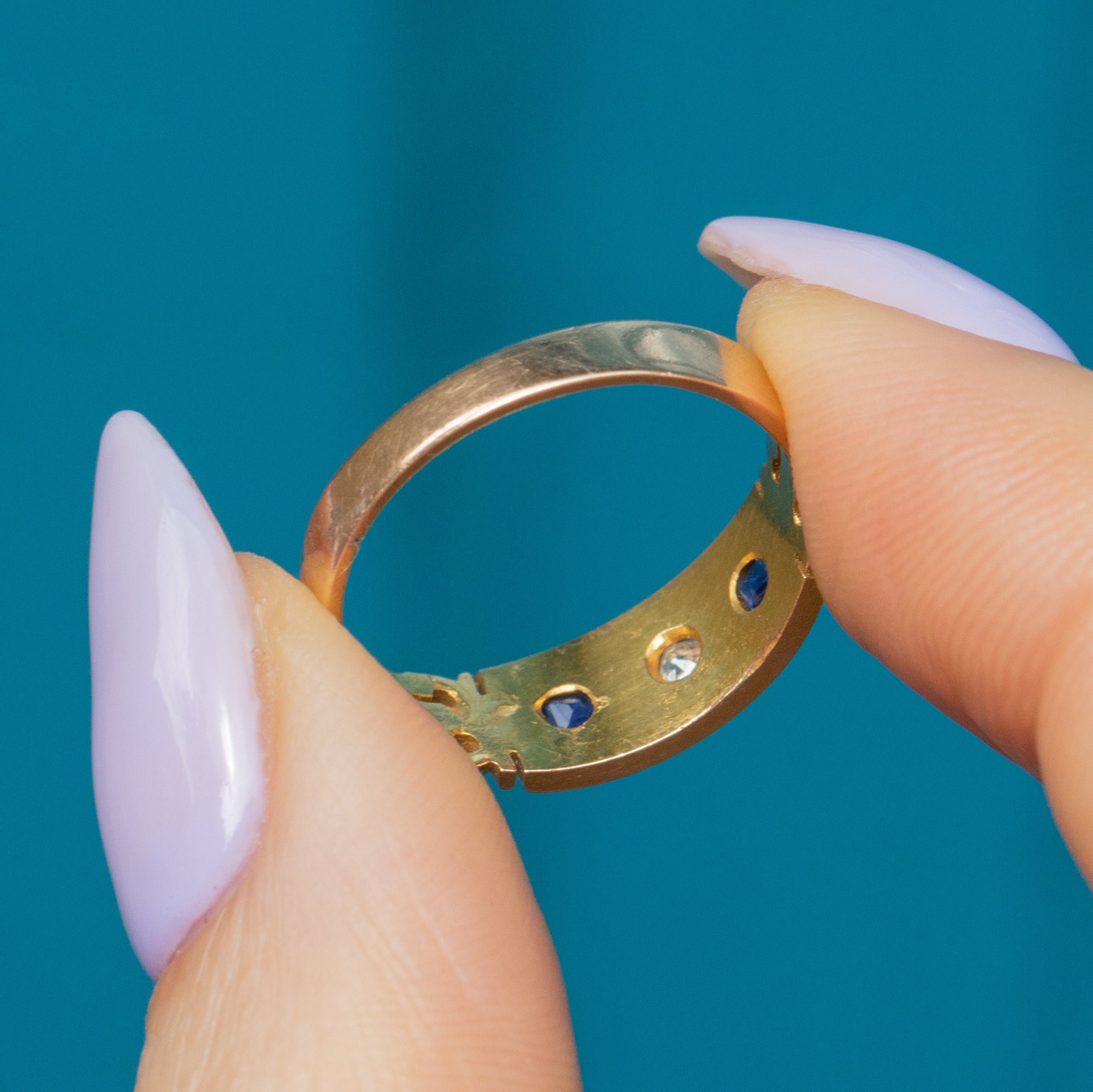 EXCELLENT. This antique 15ct Gold Sapphire Diamond Gypsy ring is in excellent condition. This piece has a lovely selection of antique gemstones, all held securely in their flush settings and the band has retained its shape remarkably well over the past century. The 15ct Gold is buttery throughout with lovely antique hallmarks inside the band making her a coveted addition to your collection!