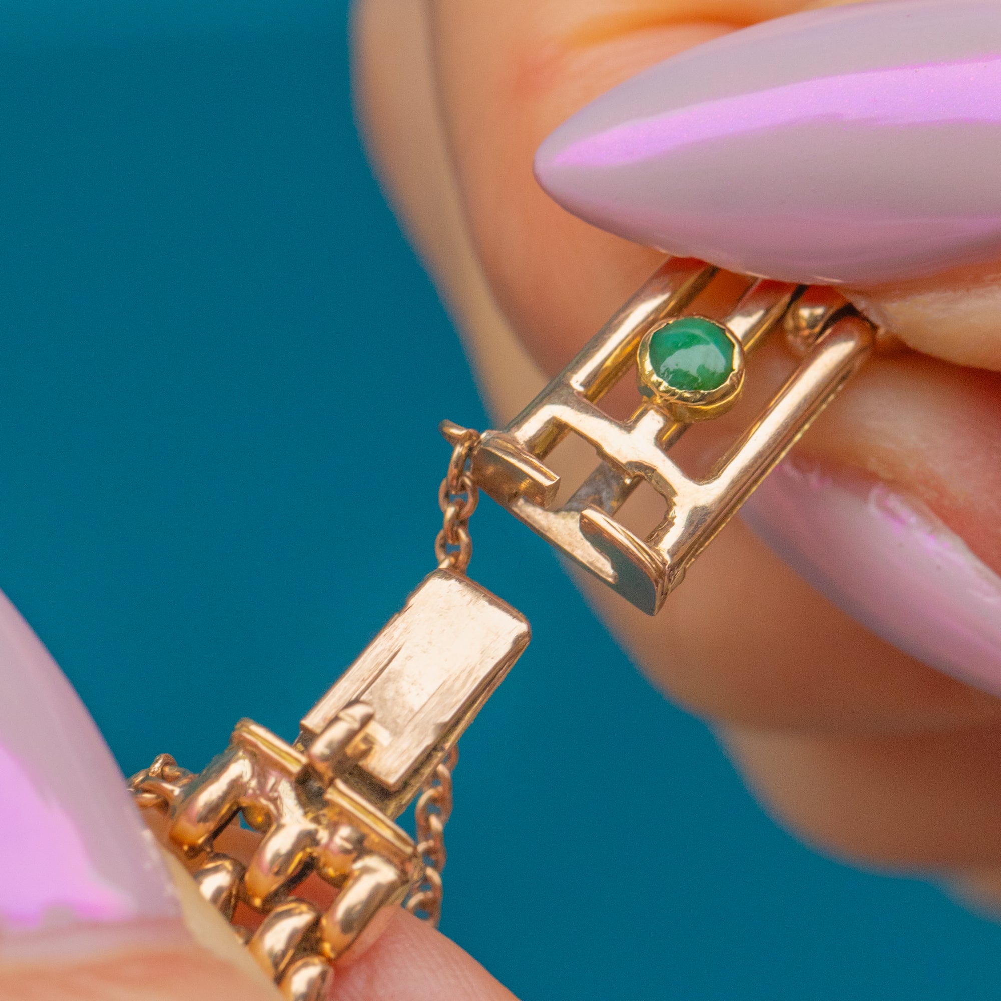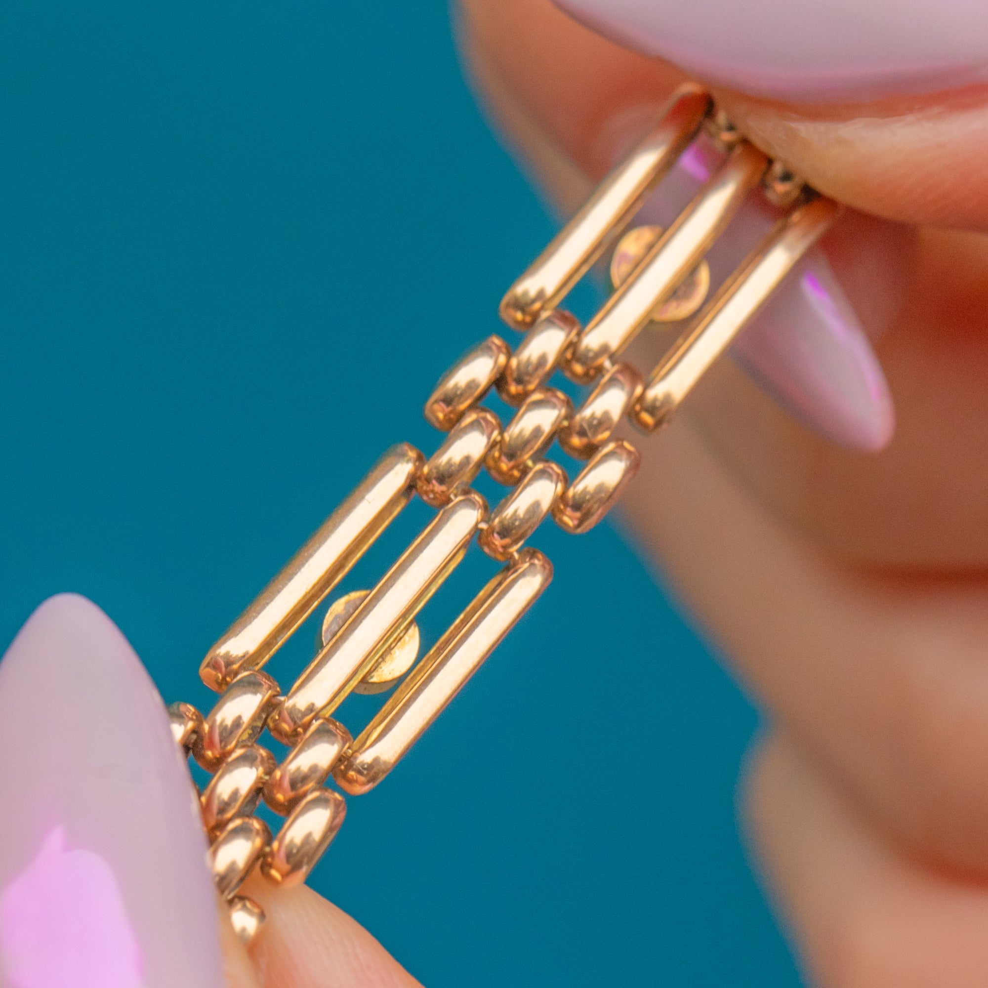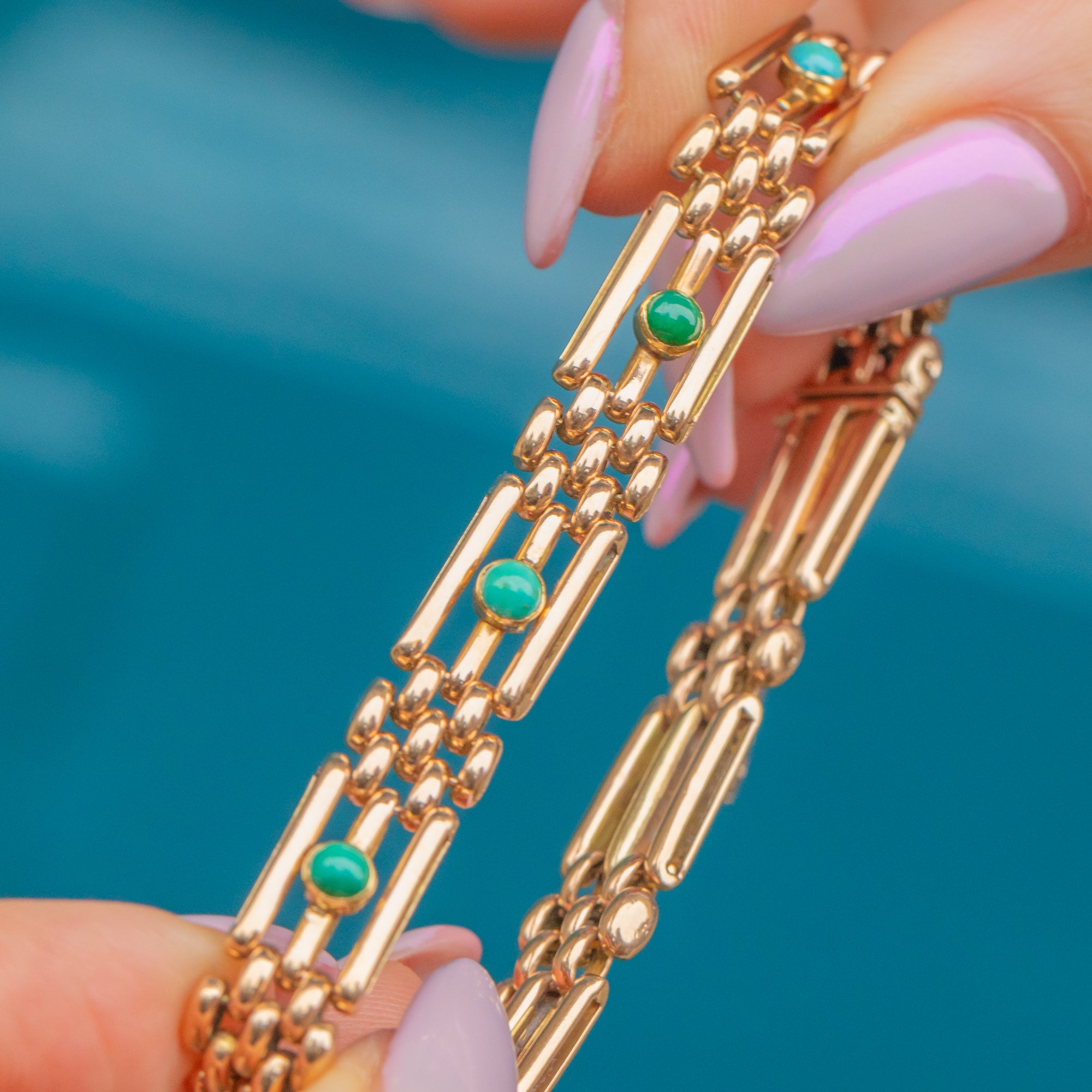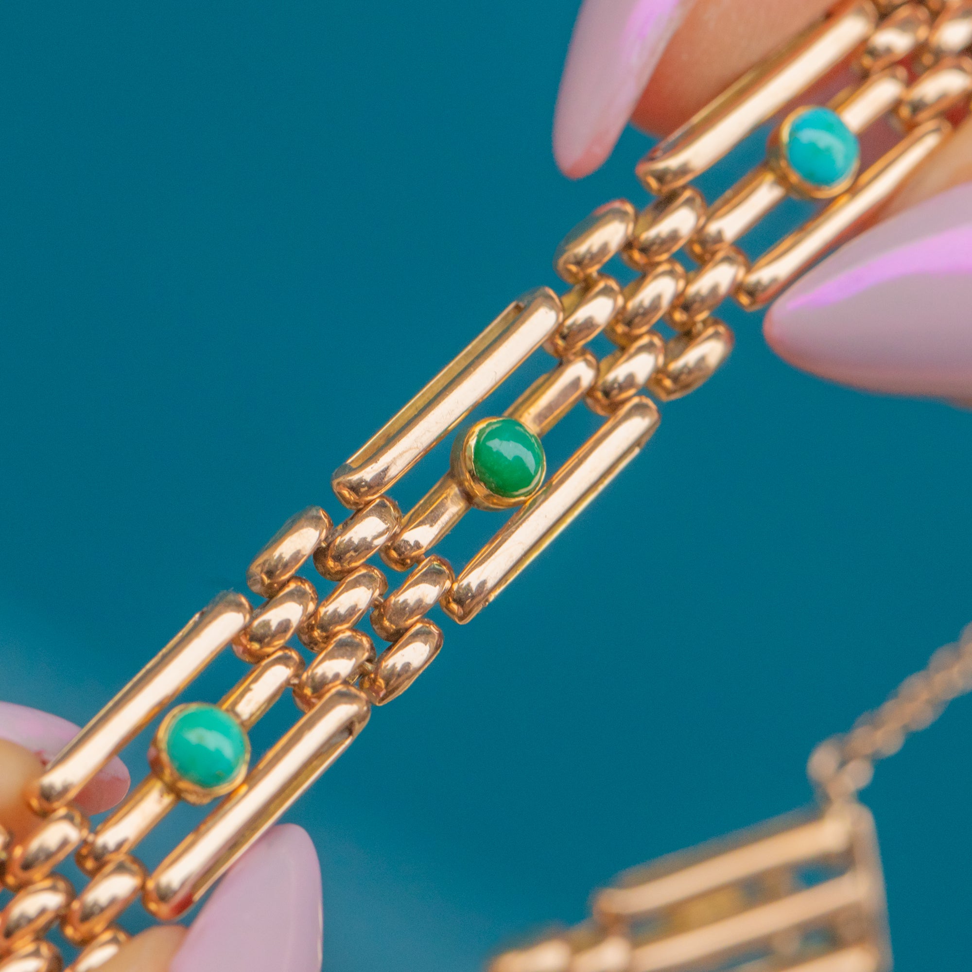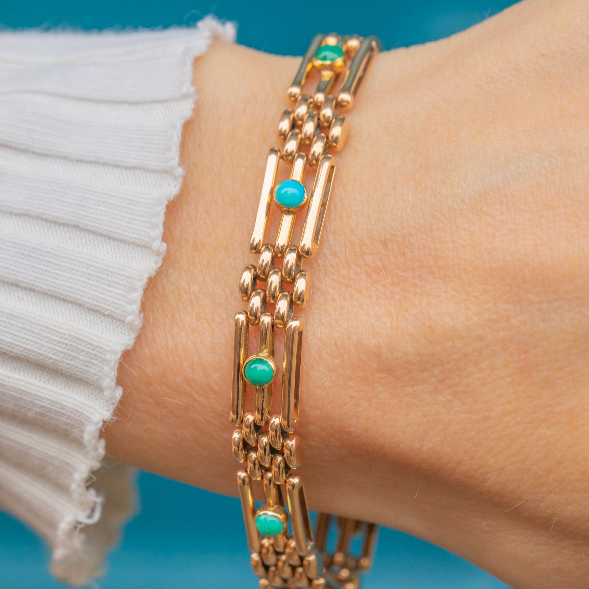 This impressive traditional Victorian gate bracelet is crafted in rich 15ct Gold and set with vibrant natural Turquoise cabochons. The stones graduate beautifully in colour from bright sky blue to soft sea green, adding a lively and organic charm to the design. Each chunky link is intricately made, creating a substantial, luxurious feel on the wrist.