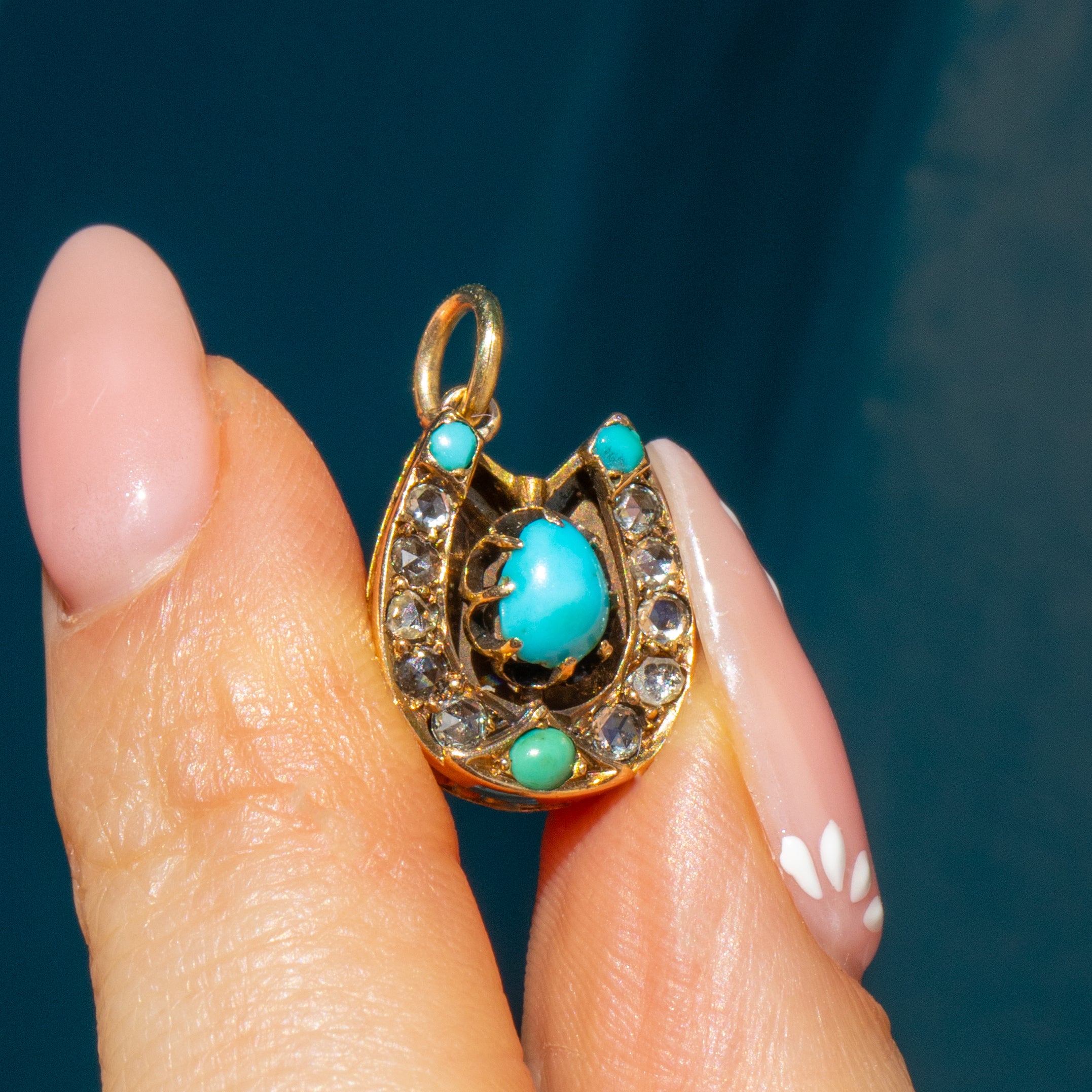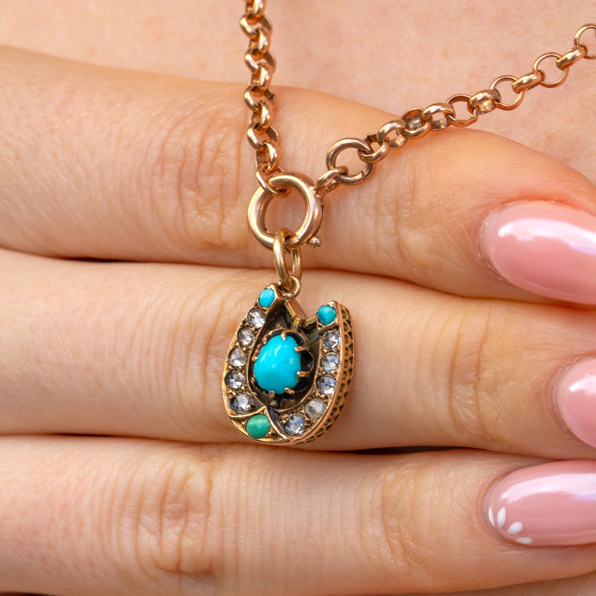 VERY GOOD-EXCELLENT. This Victorian 15ct Gold Turquoise Diamond horseshoe pendant is offered in wonderful condition. The gemstones are all securely set and free from any signs of wear. The 15ct Gold has a striking rosy hue and the details have remained structurally intact. Complete with a soldered jump ring, you can wear this antique lucky charm with utmost confidence!