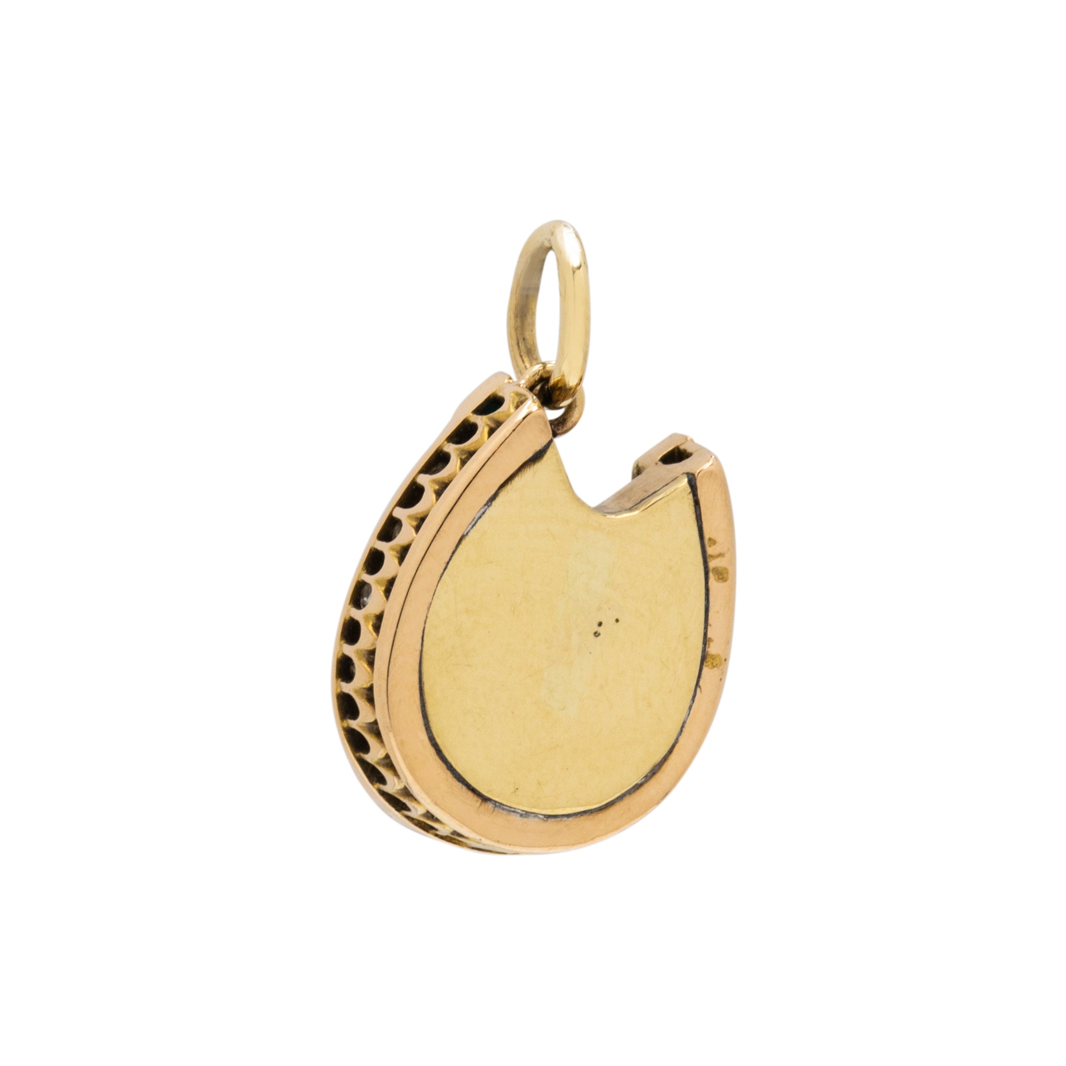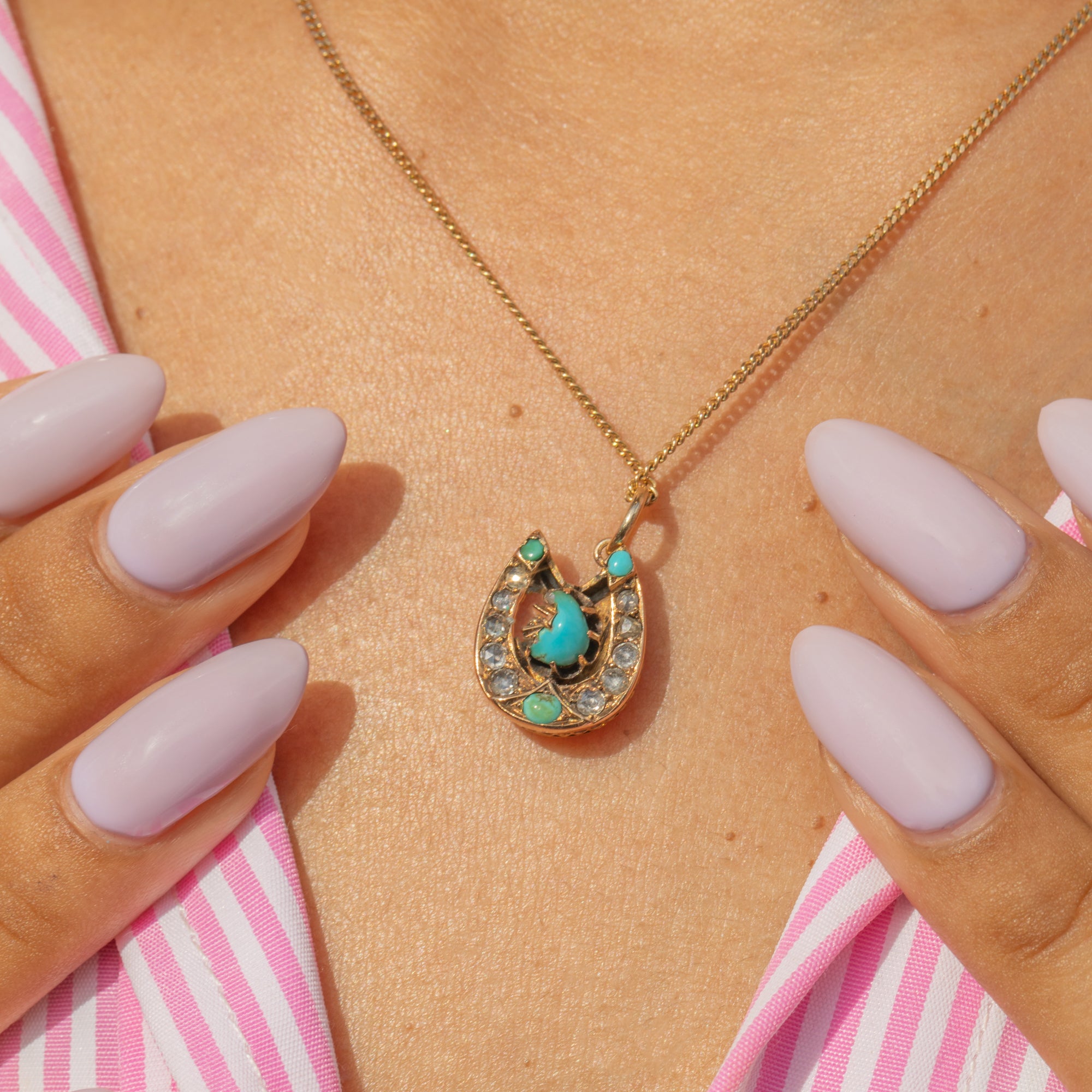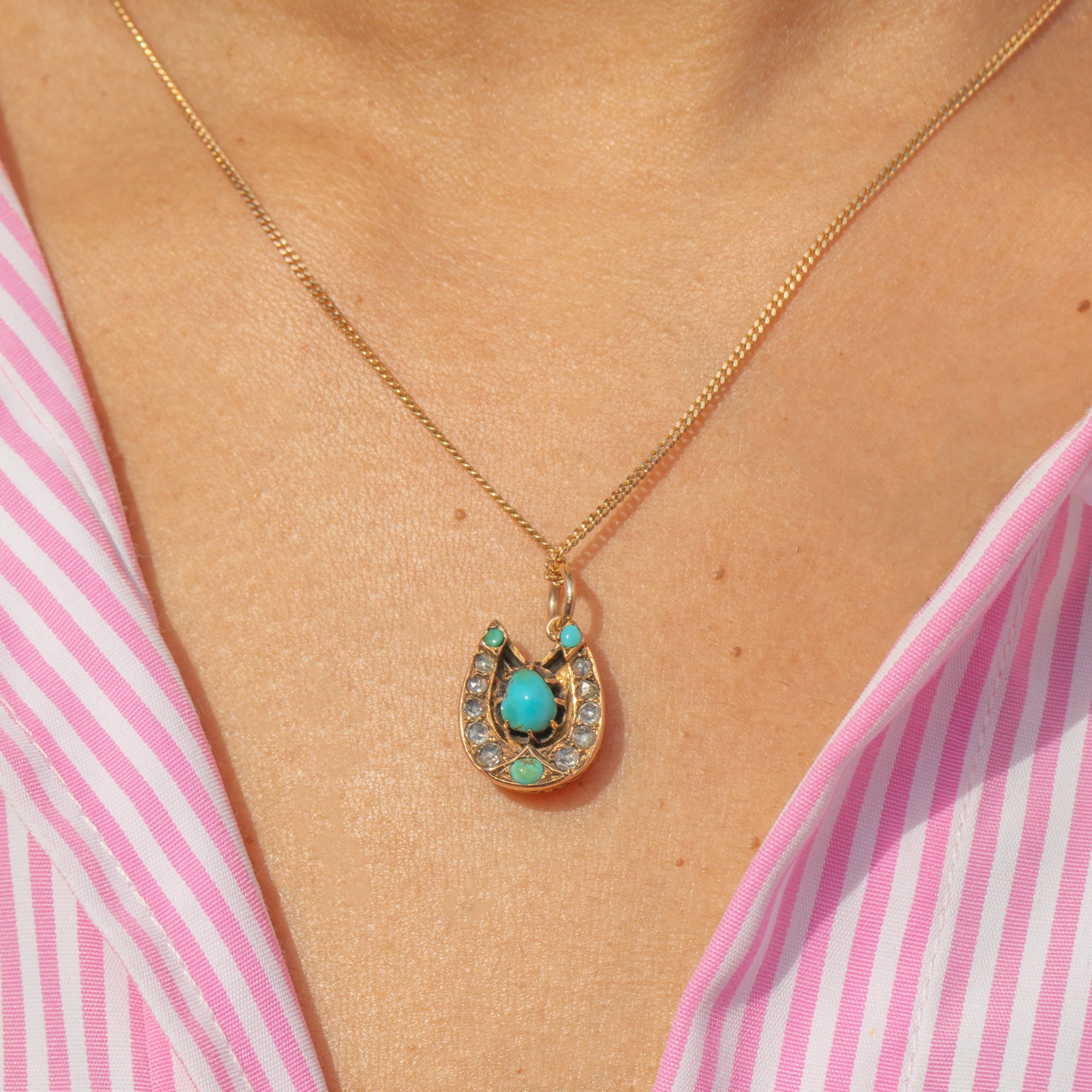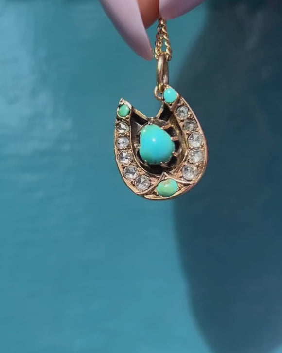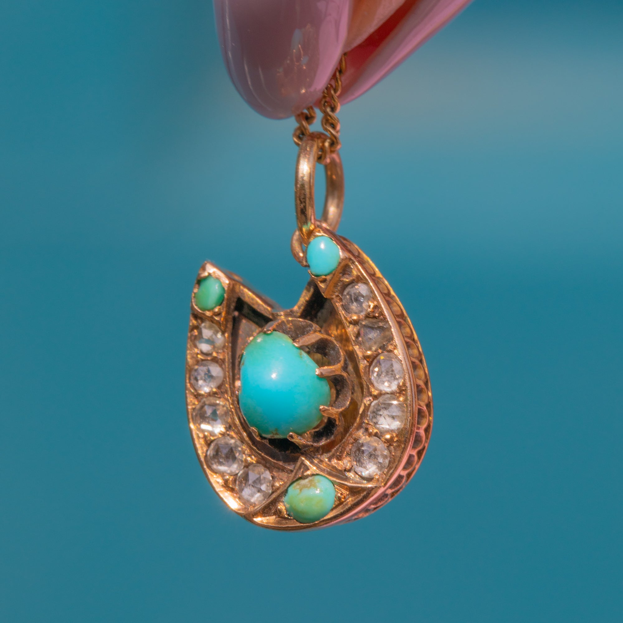 VERY GOOD-EXCELLENT. This Victorian 15ct Gold Turquoise Diamond horseshoe pendant is offered in wonderful condition. All of the gemstones are securely set and free from any signs of wear. The back of the pendant has a minor ding and some surface wear, however, it's not noticeable when worn. On the underside of the pendant, you can see the Turquoise matrix which is a lovely insight into its magical origins. The 15ct Gold has a striking rosy hue and the details have all remained structurally intact. Complete with a soldered jump ring, you can wear this antique lucky charm with utmost confidence!
