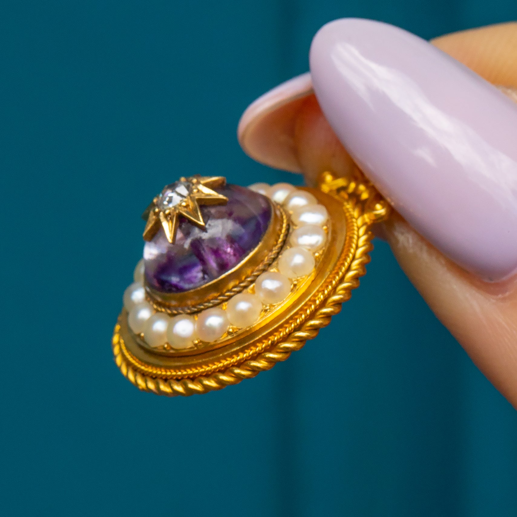 MATERIALS: Tests as 18ct Gold throughout, Amethyst (foiled), antique Diamond, natural Pearls.