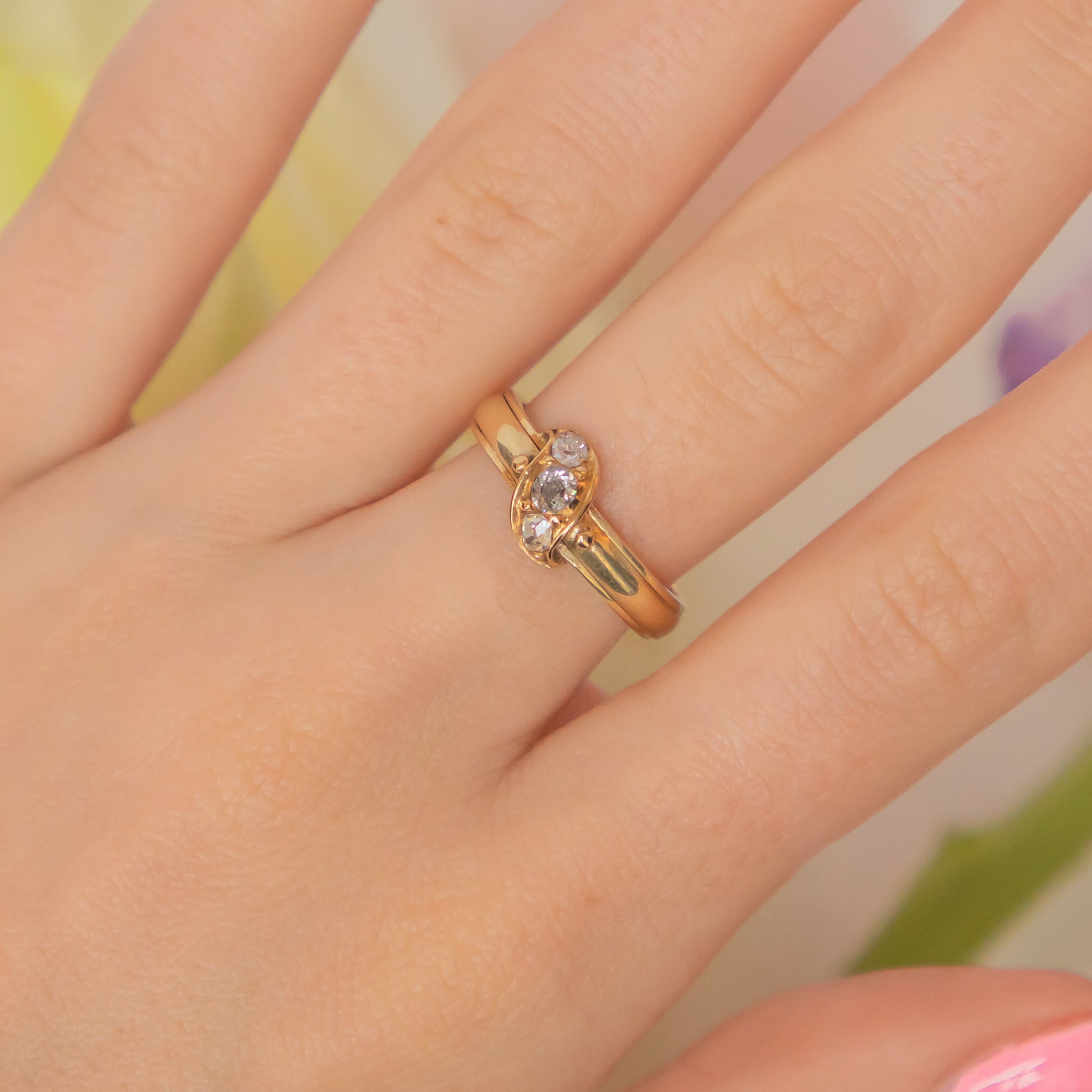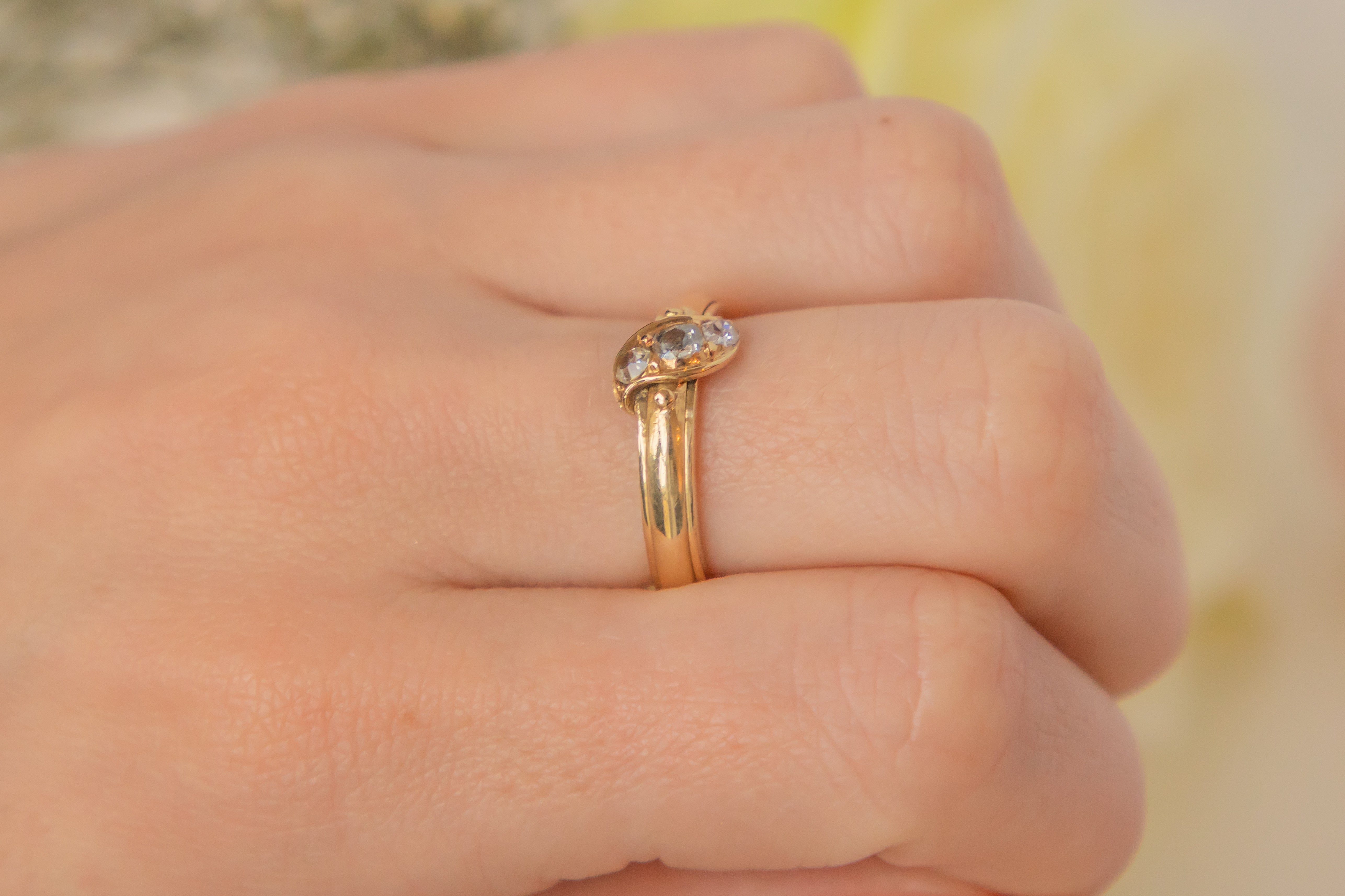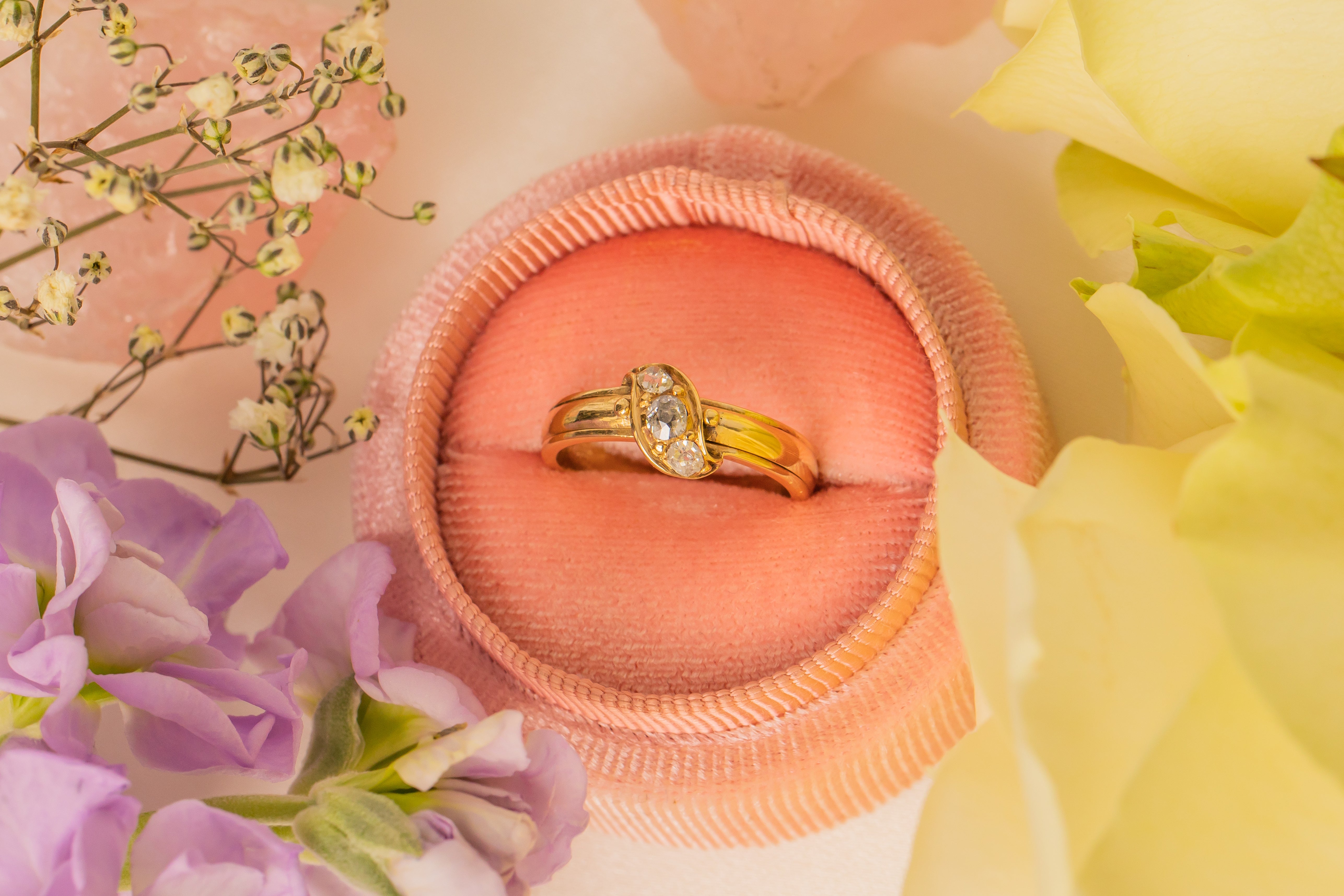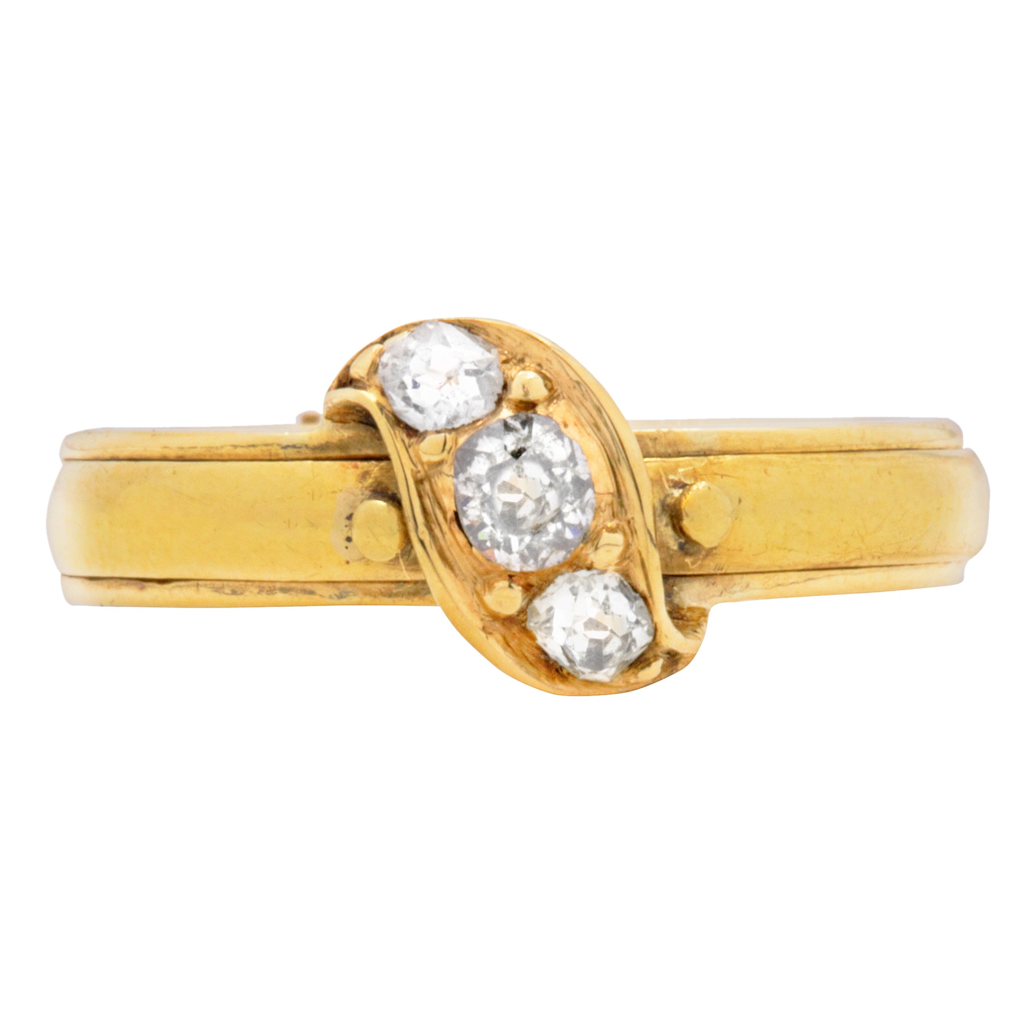 This Victorian Diamond ring has more to it than meets the eye, with two secret compartments storing intricately woven hair- a common quality found within mourning jewellery! Delicately pull on the dainty beads of Gold on either side of her Diamonds to reveal her hidden treasure.