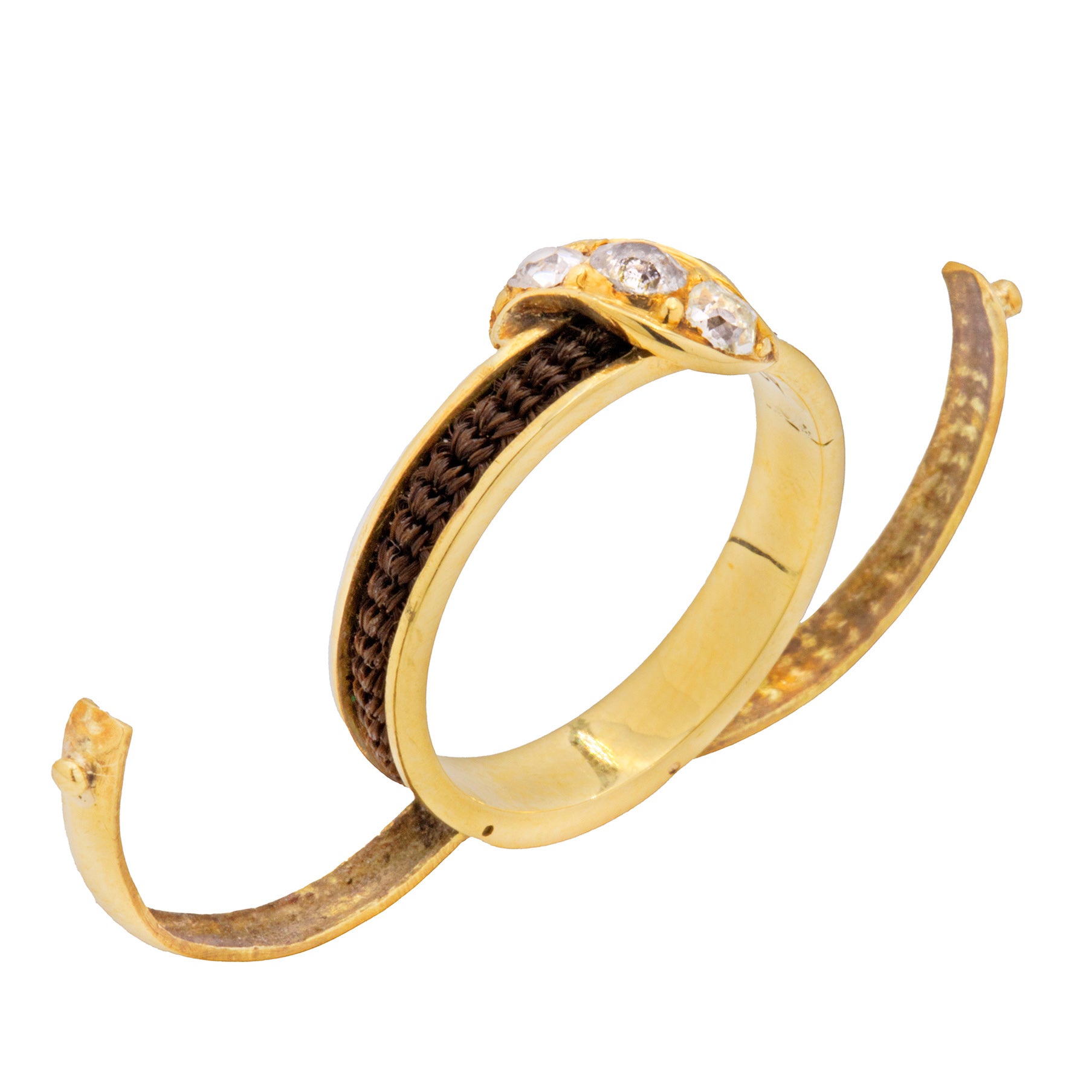 MATERIALS: Tests as 18ct Gold throughout, Old Mine-Cut Diamond (0.18ct), woven hair.