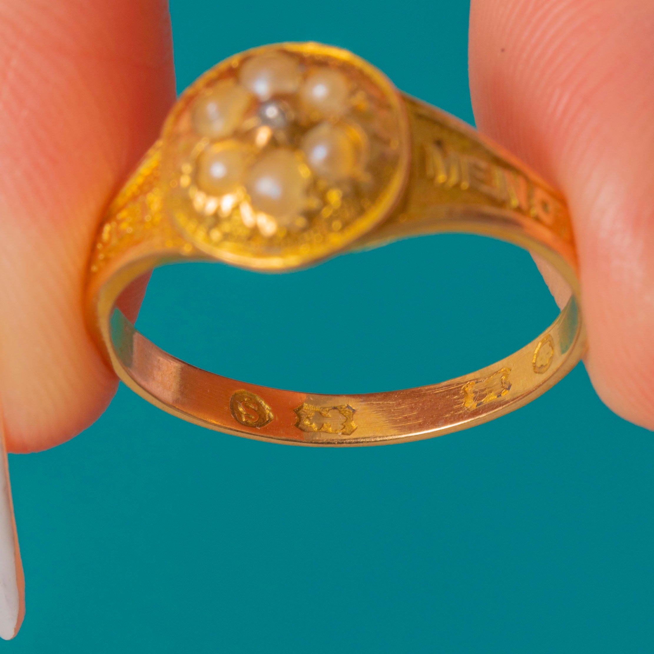 In her centre sits a dainty flower cluster, formed of six lustrous Pearls surrounding a central scintillating Diamond. The ring face is flanked by inscribed shoulders reading 'FORGET ME NOT', a unique feature adding allure and Victorian charm to this antique ring.