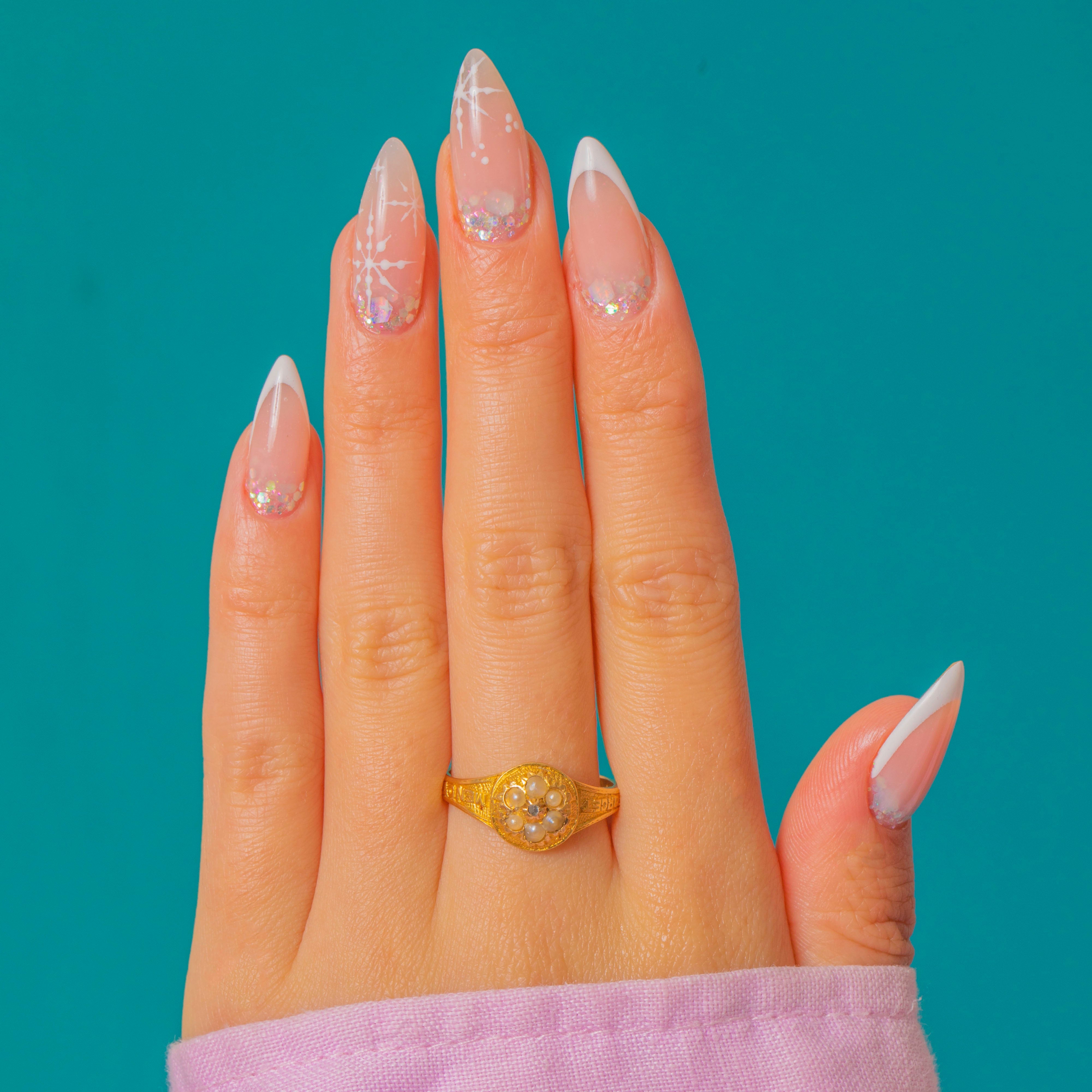 Victorian 18ct Gold Engraved Forget-Me-Not Pearl Diamond Ring, c.1867