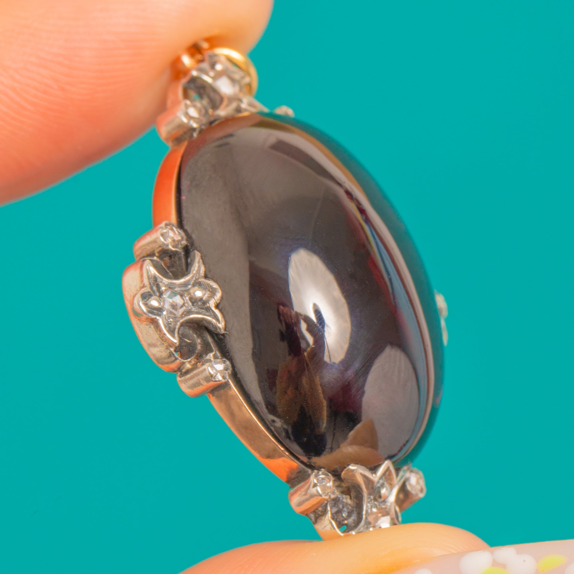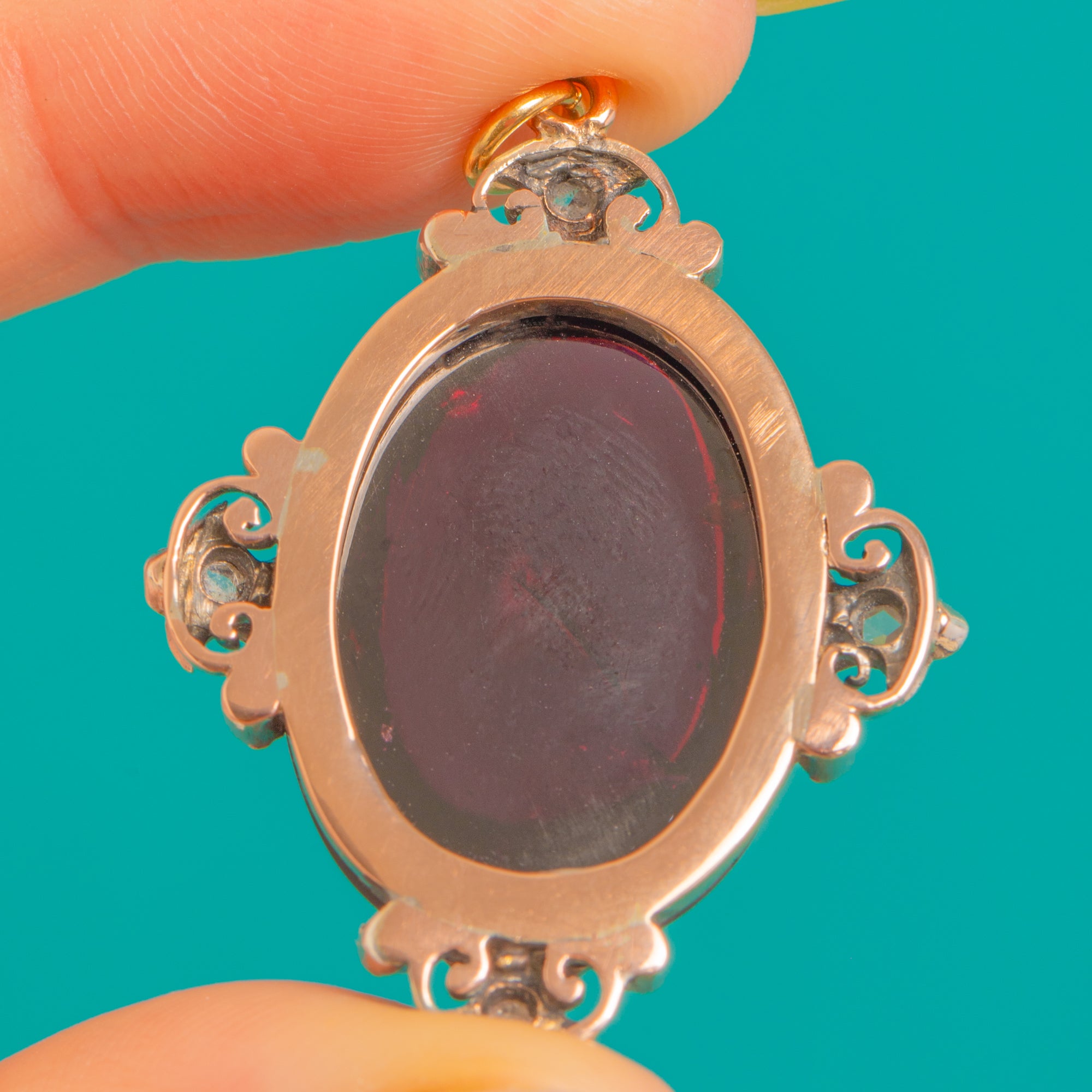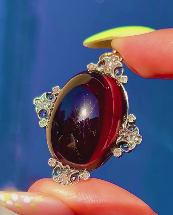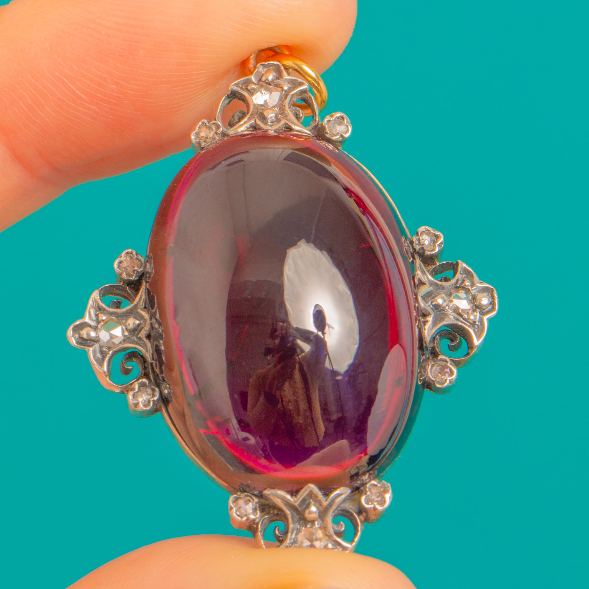 Ein prachtvoller Victorian Anhänger, dessen Mittelpunkt ein hochgewölbter Granat-Cabochon von beeindruckender Präsenz bildet, der in einem tiefen Purpurrot leuchtet. Die opulente Fassung aus 18ct Gold wird durch Fassungen aus Sterlingsilber akzentuiert, die jeweils mit antiken Diamanten im Rosenschliff besetzt sind und einen zarten, funkelnden Halo schaffen. Aufwendige florale und Rollwerk-Enden rahmen den Stein ein und verleihen dem Schmuckstück seine romantische, theatralische Ausstrahlung.