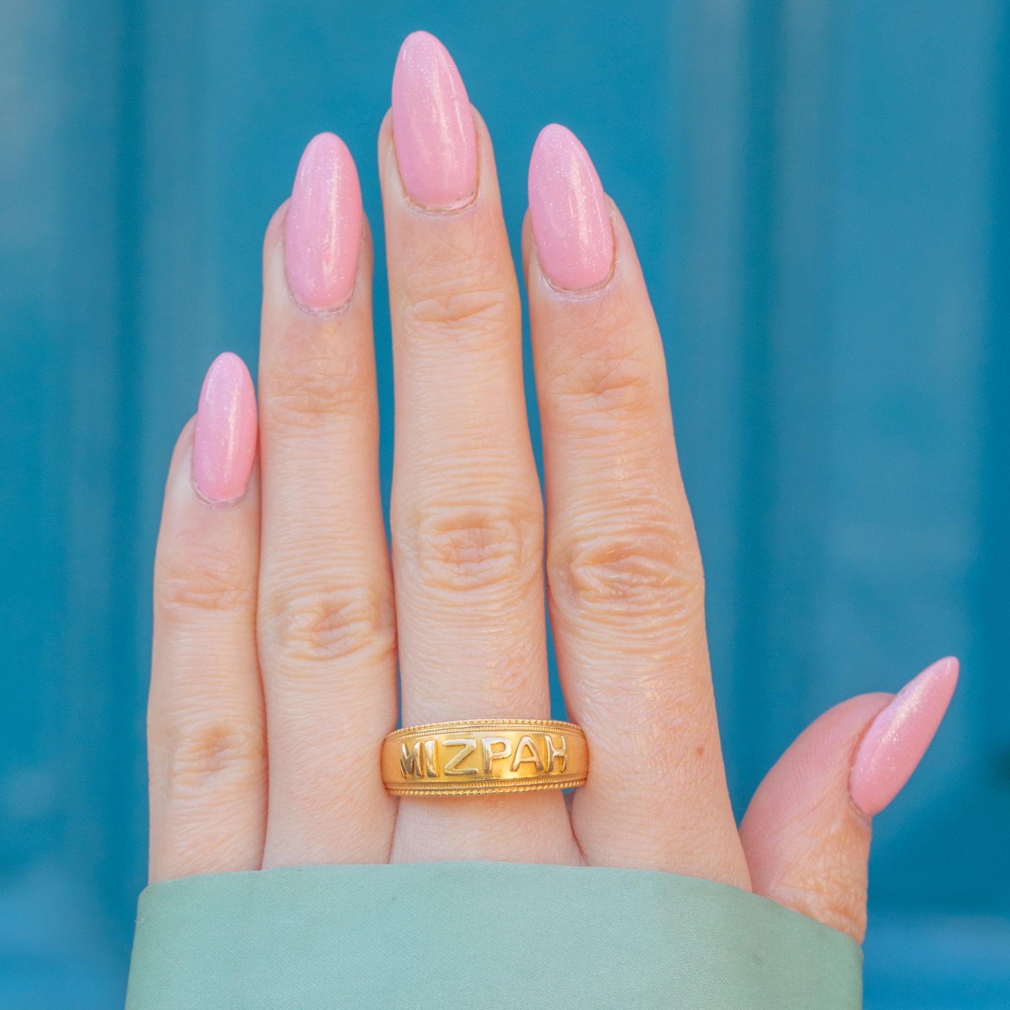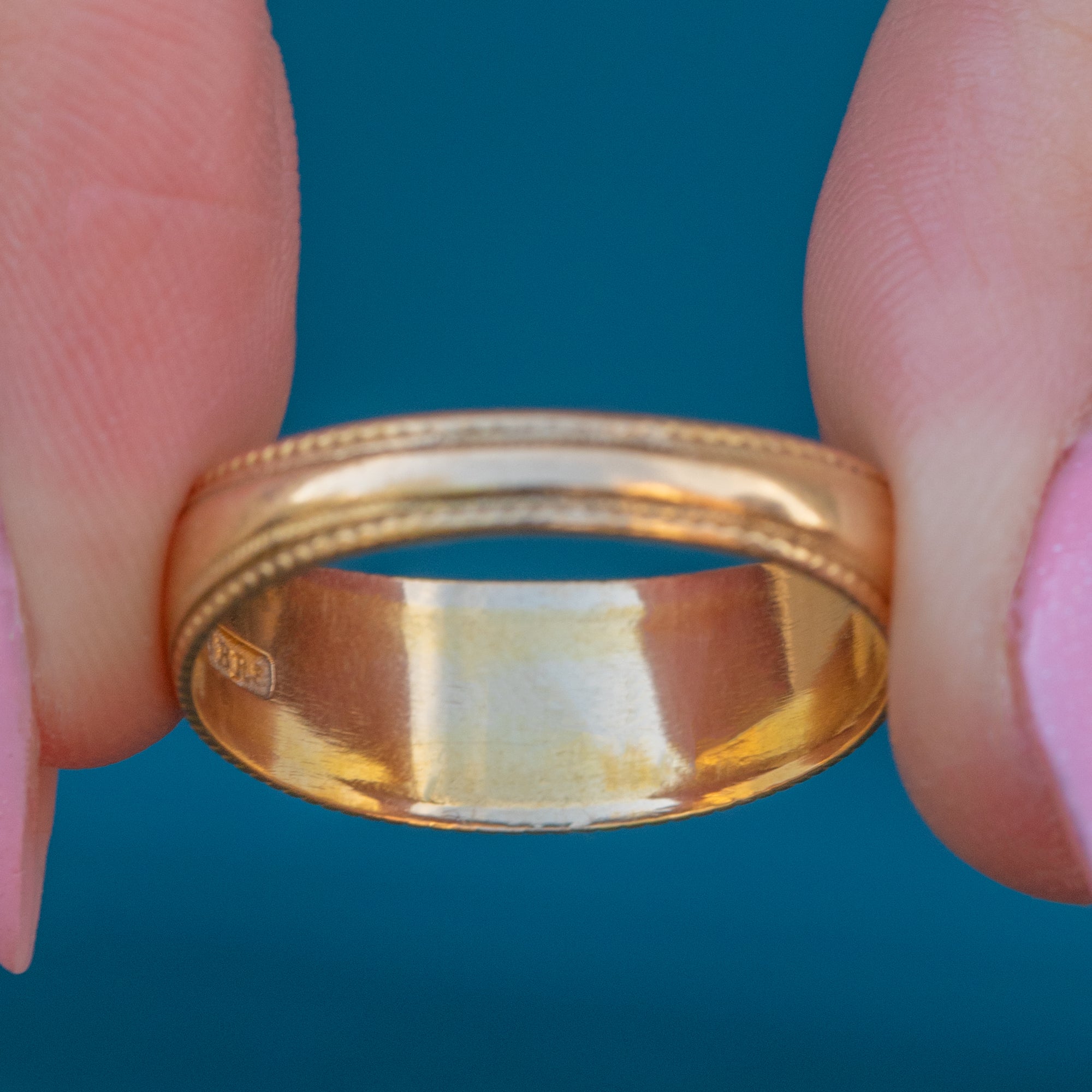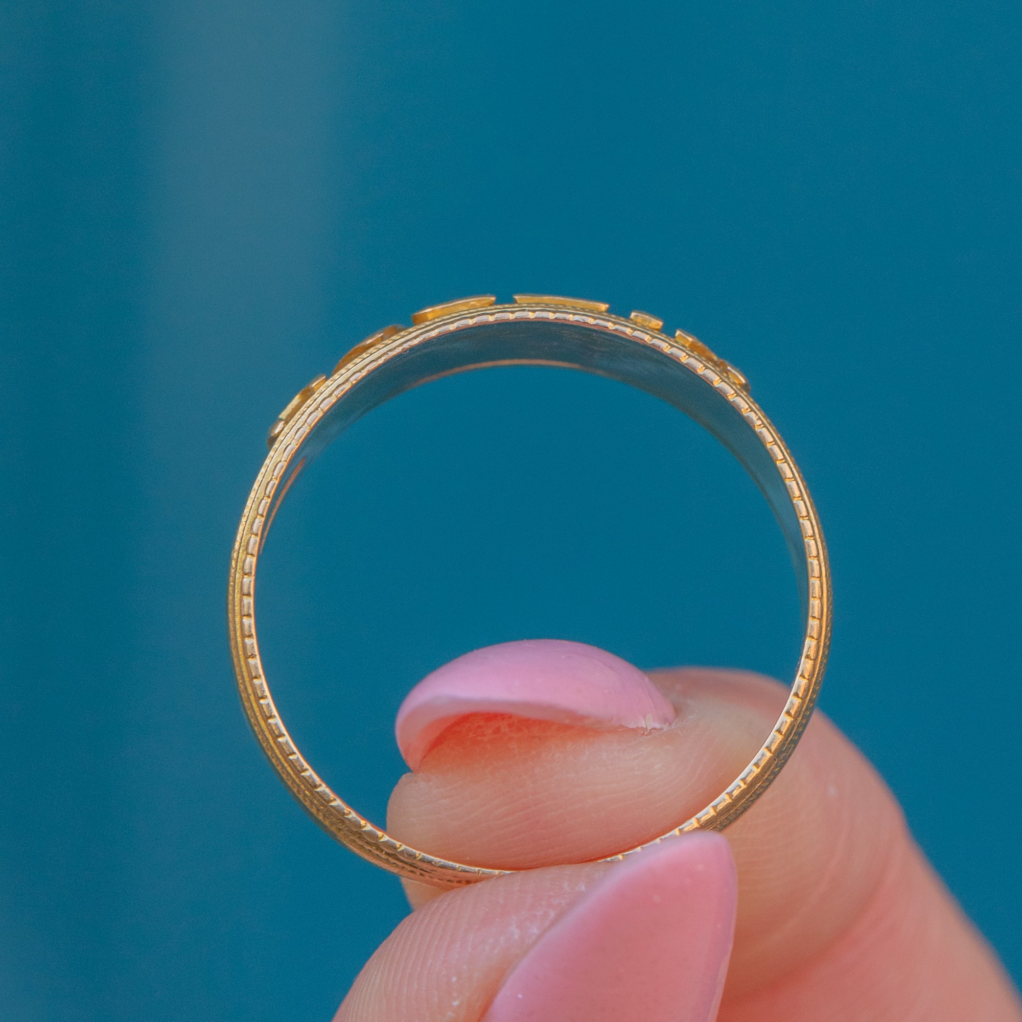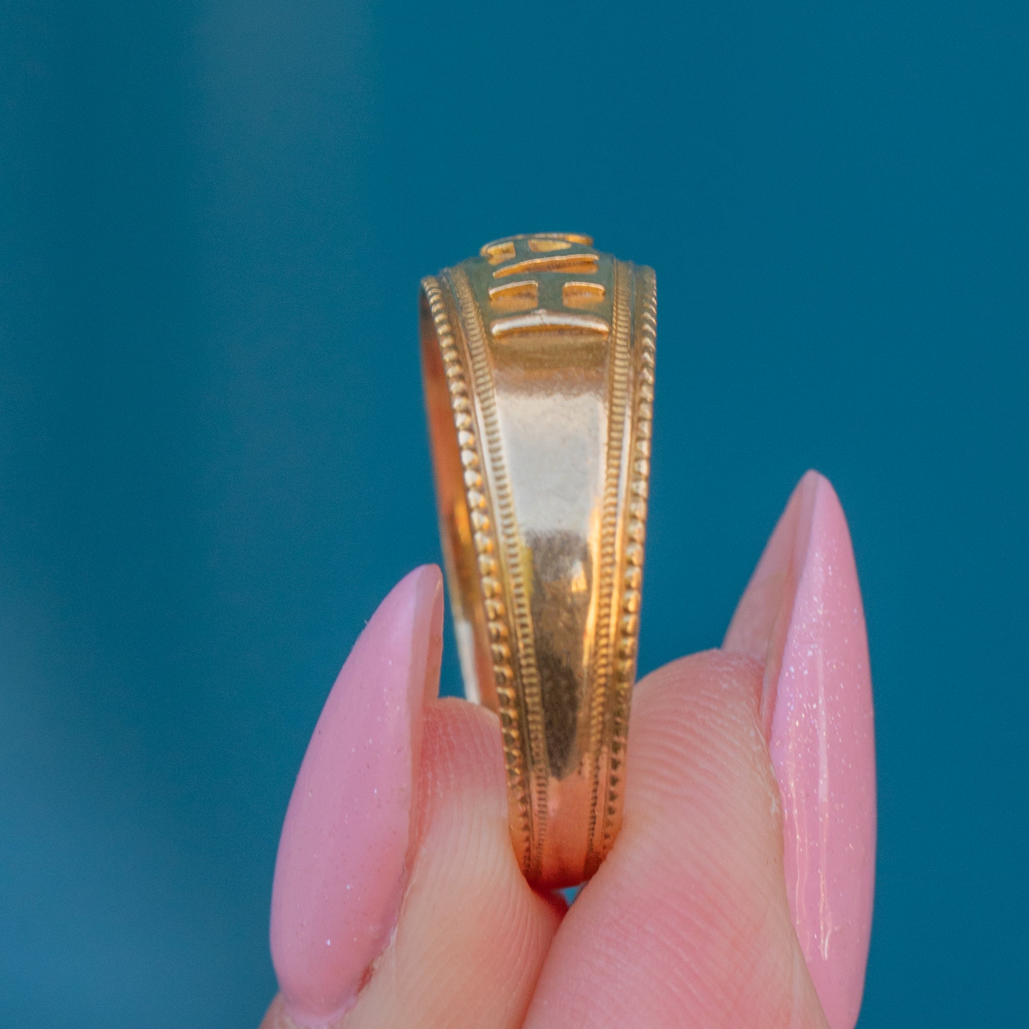 Warm saturated Gold wraps itself around your finger, displaying the bold lettering enhanced by a lovely textured background, and has a full set of English hallmarks dating to 1889 inside.