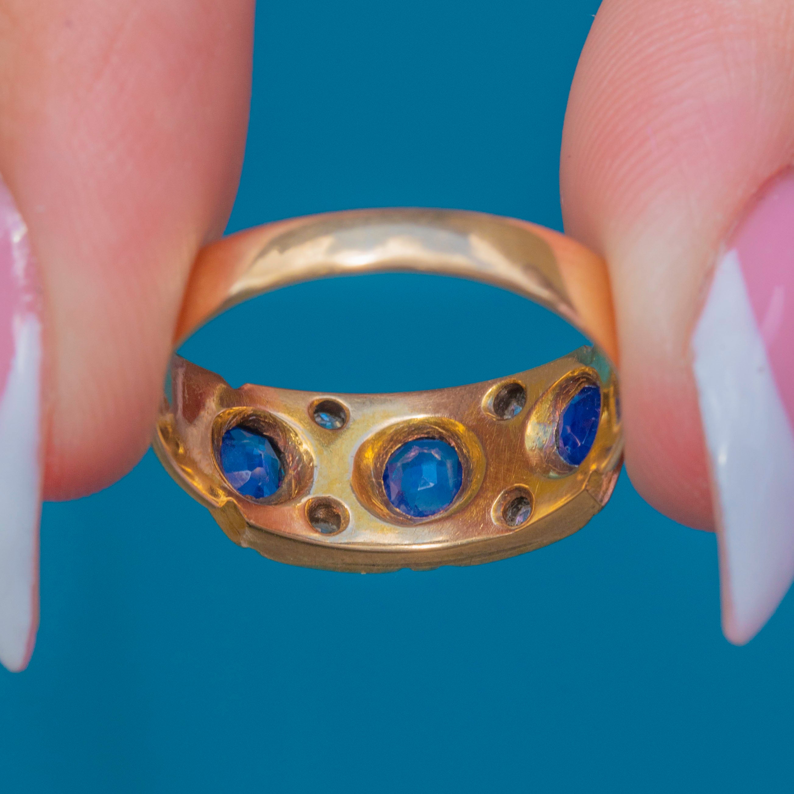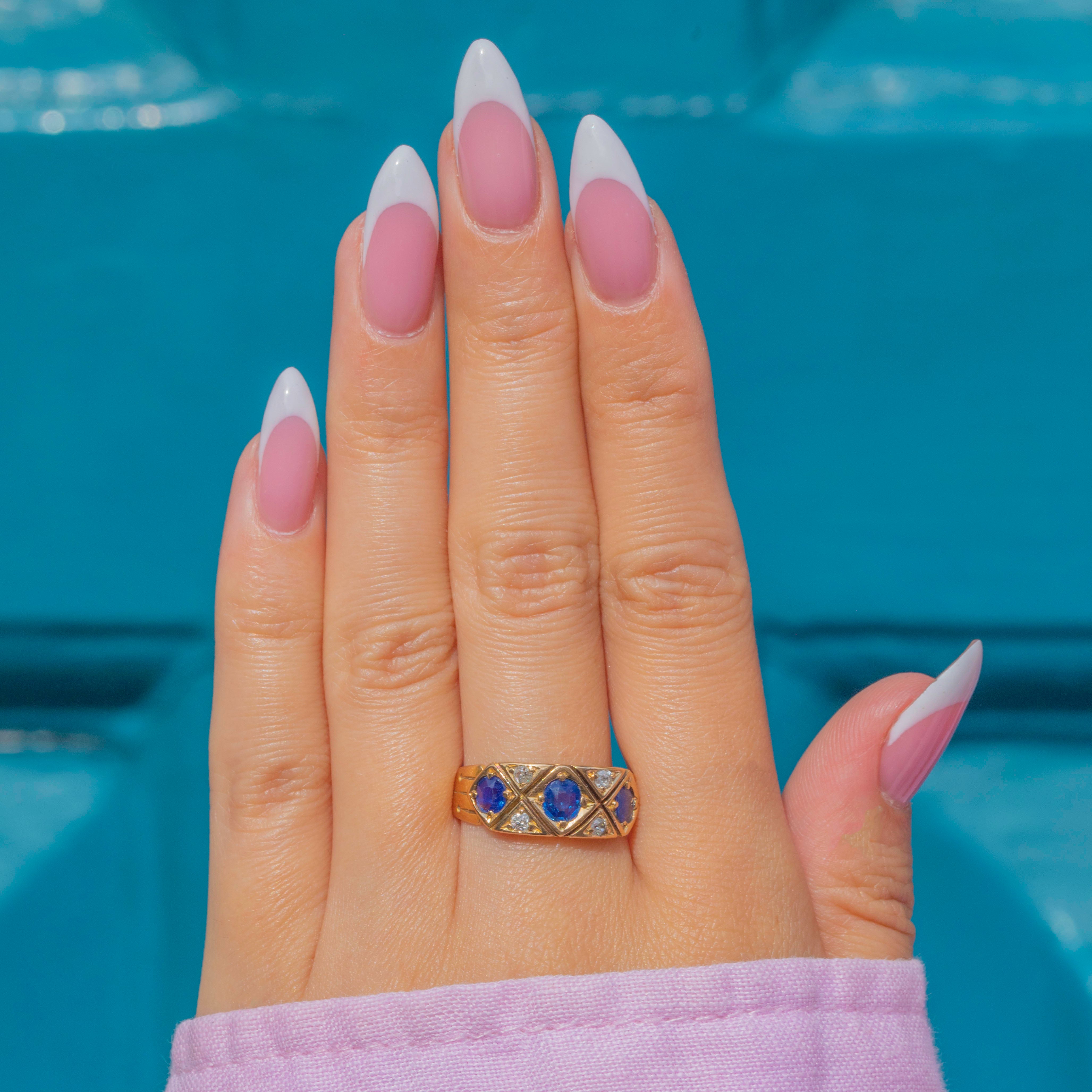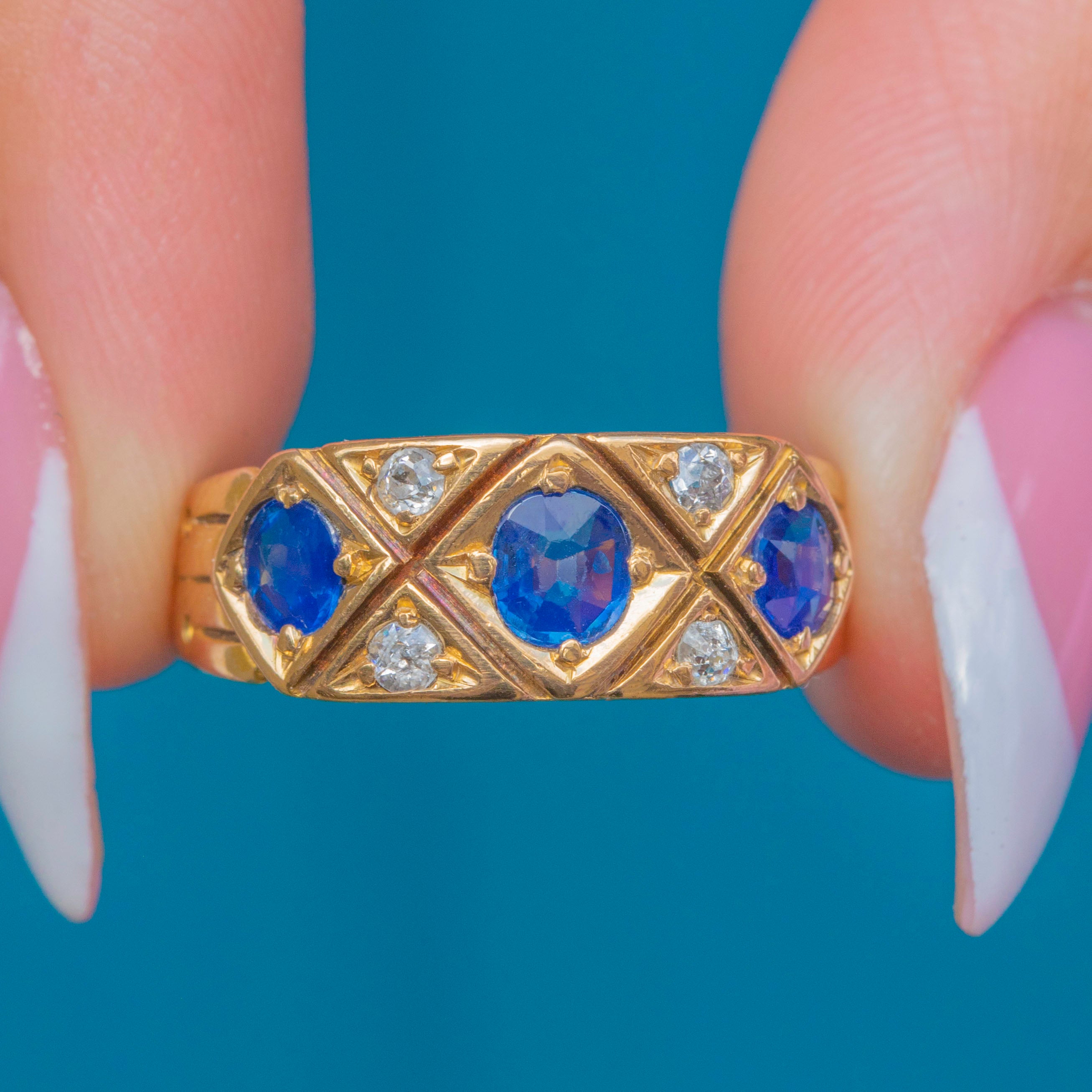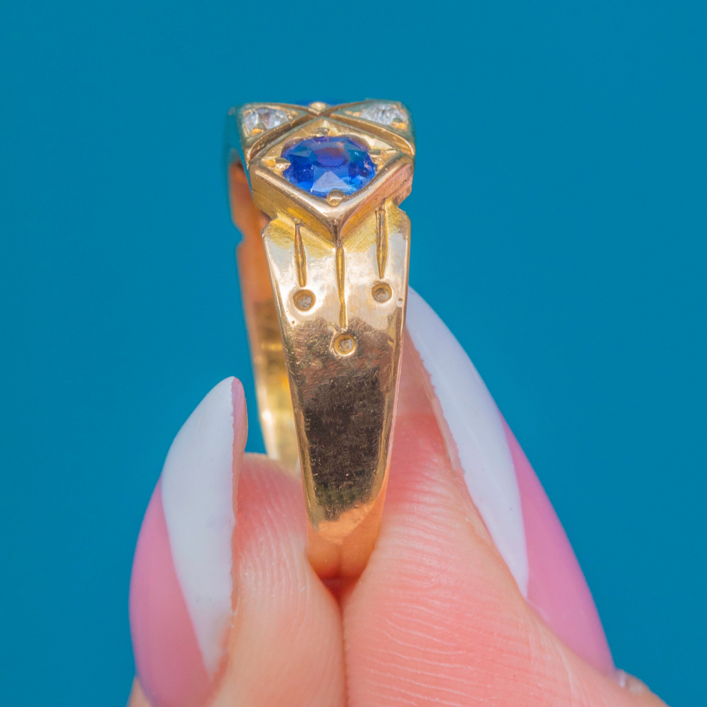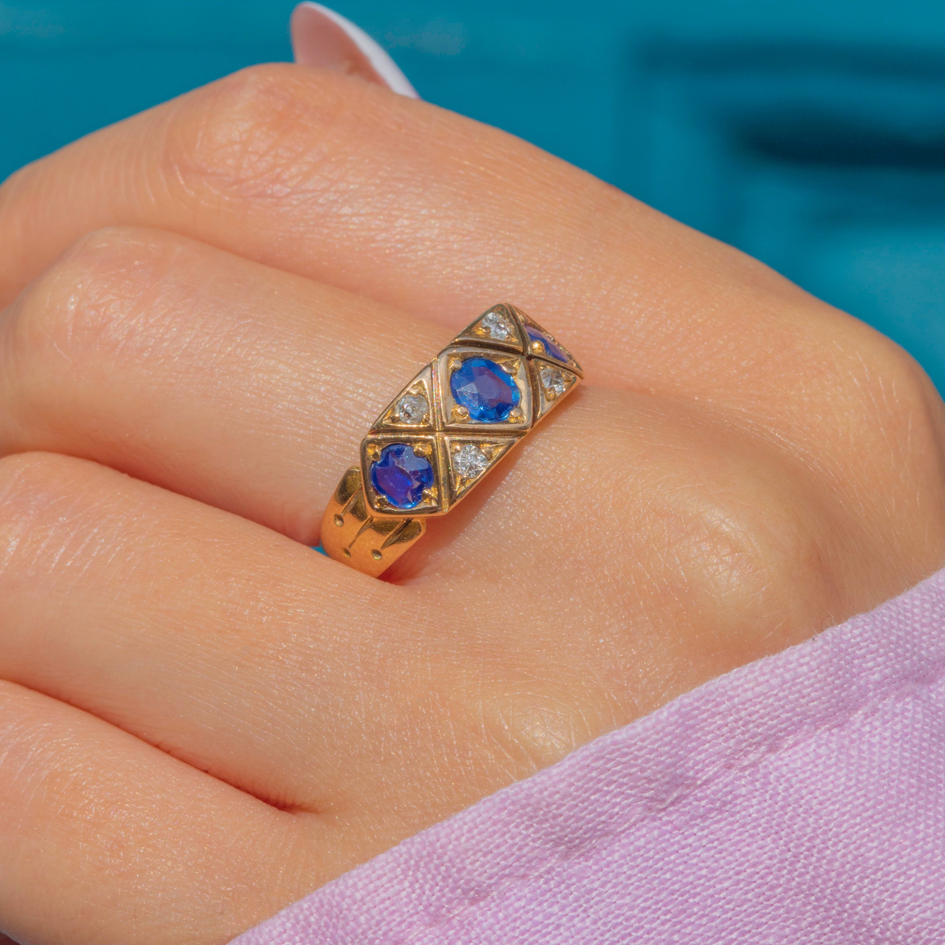 Victorian 18ct Gold Natural Sapphire Diamond Chequerboard Ring