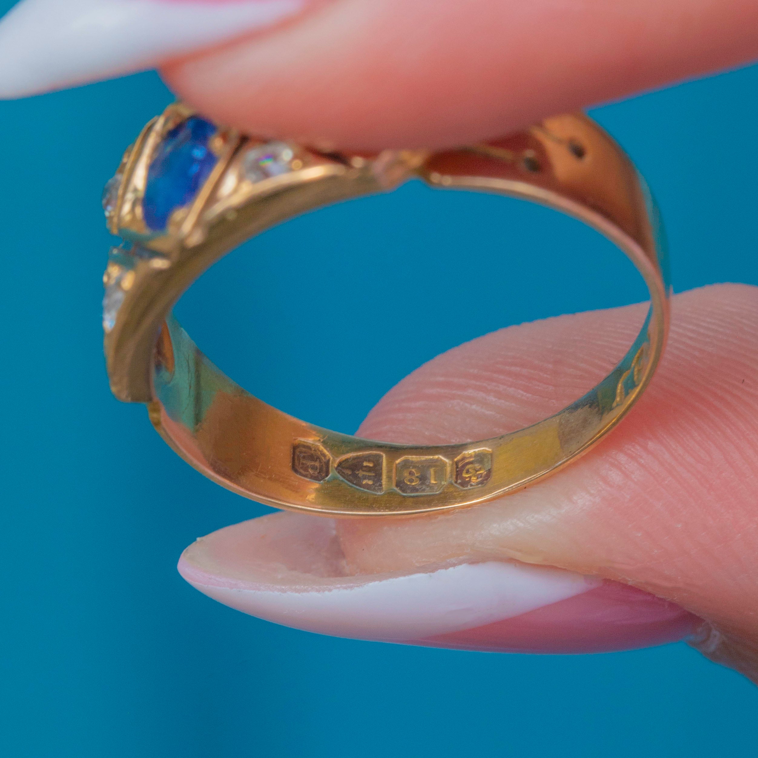 MATERIALS: Tests as 18ct Gold, Natural Sapphire, Diamond.