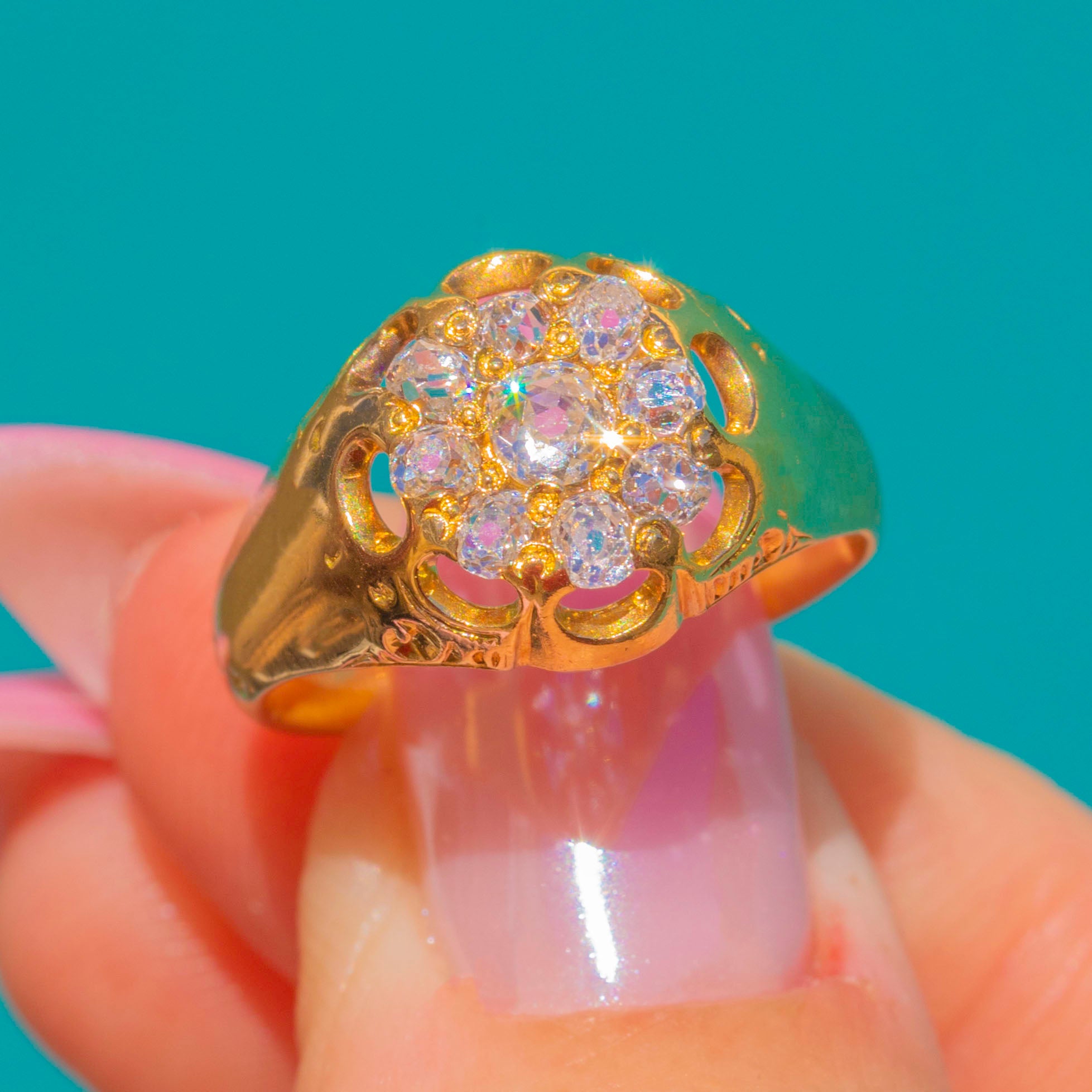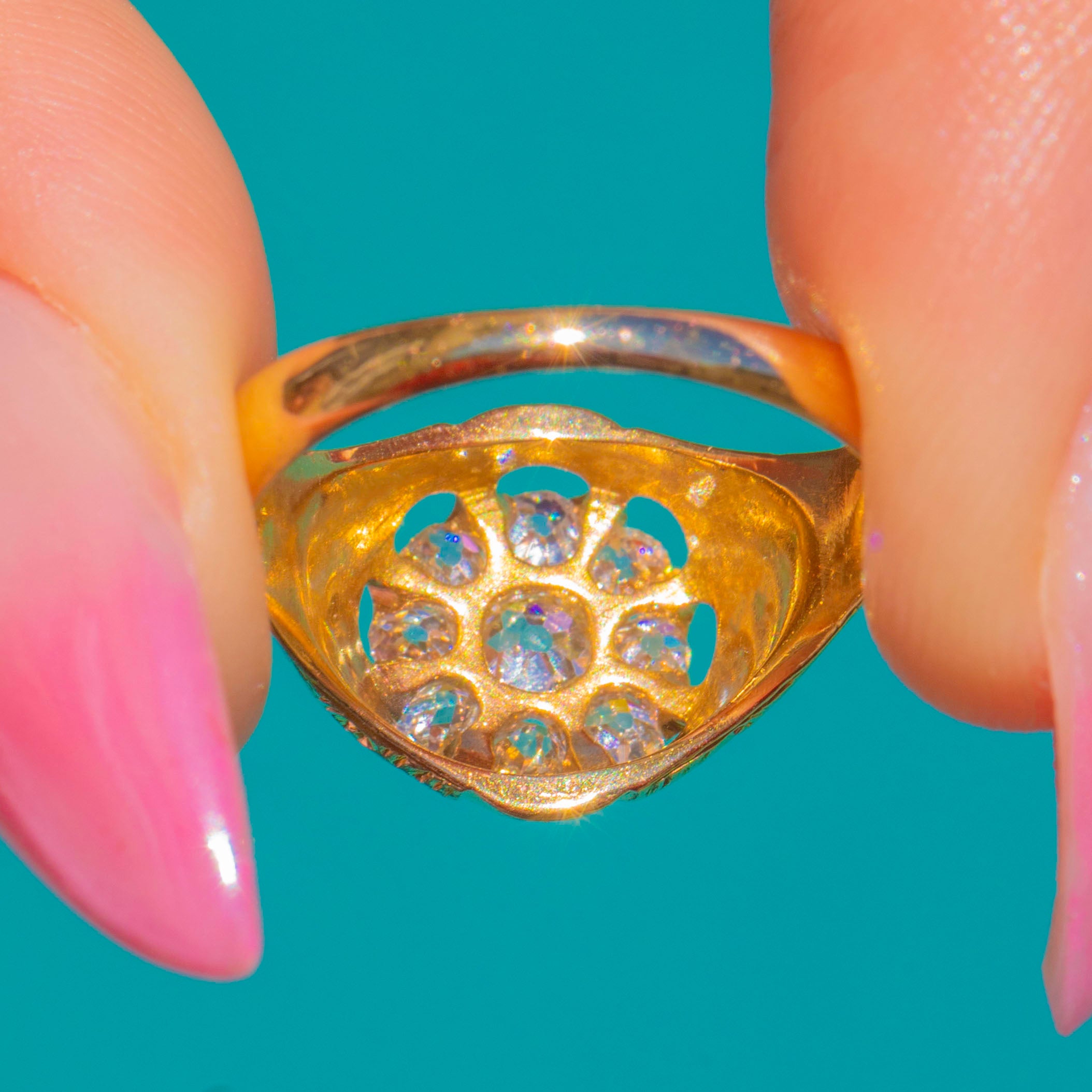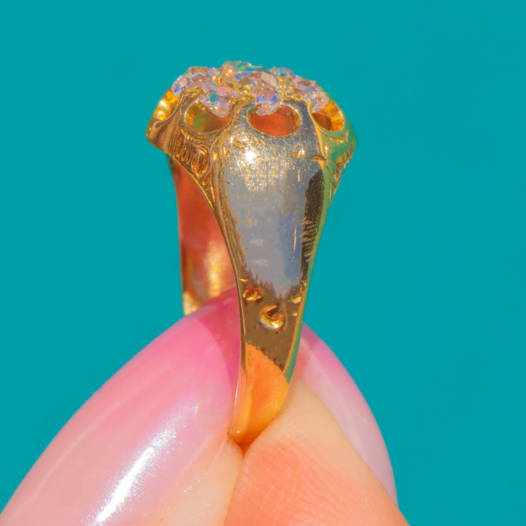 Mit funkelndem, antikem Charme präsentiert sich dieser Victorian 18ct Gold Old Mine Cut Diamant-Cluster-Ring als üppige, gewölbte Rosette am Finger. Das florale Cluster wird durch eine geschwungene, durchbrochene Galerie und elegante, blattförmige Voluten an den Schultern erhöht, alles vollendet in reichhaltig poliertem Gold, das das Licht auf wunderschöne Weise einfängt.