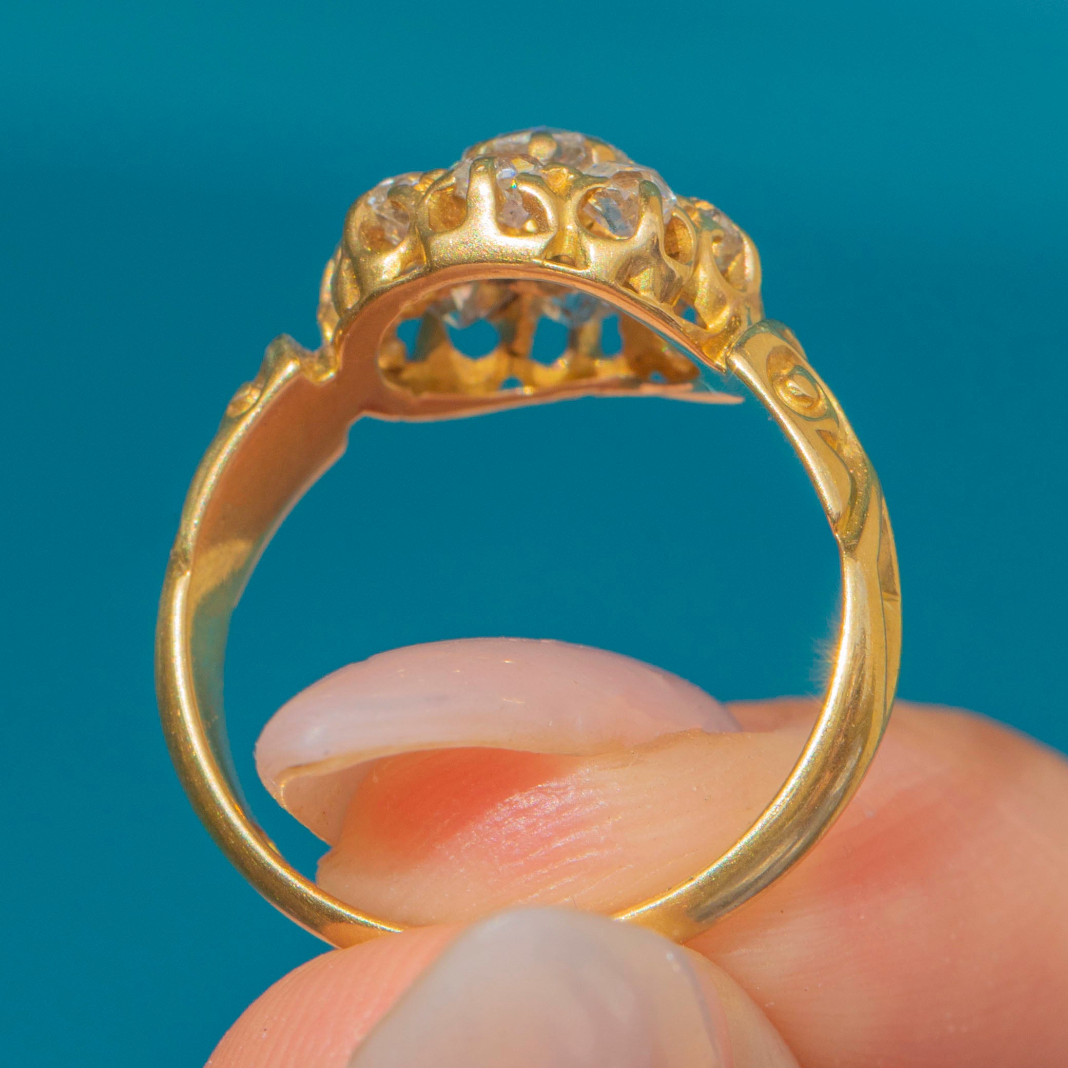 A beautifully crafted Victorian Old Mine Cut Diamond cluster ring in rich 18ct Gold, c.1870. The ring features a sparkling circular cluster, centred by a bright old Mine Cut Diamond surrounded by a halo of eight more!