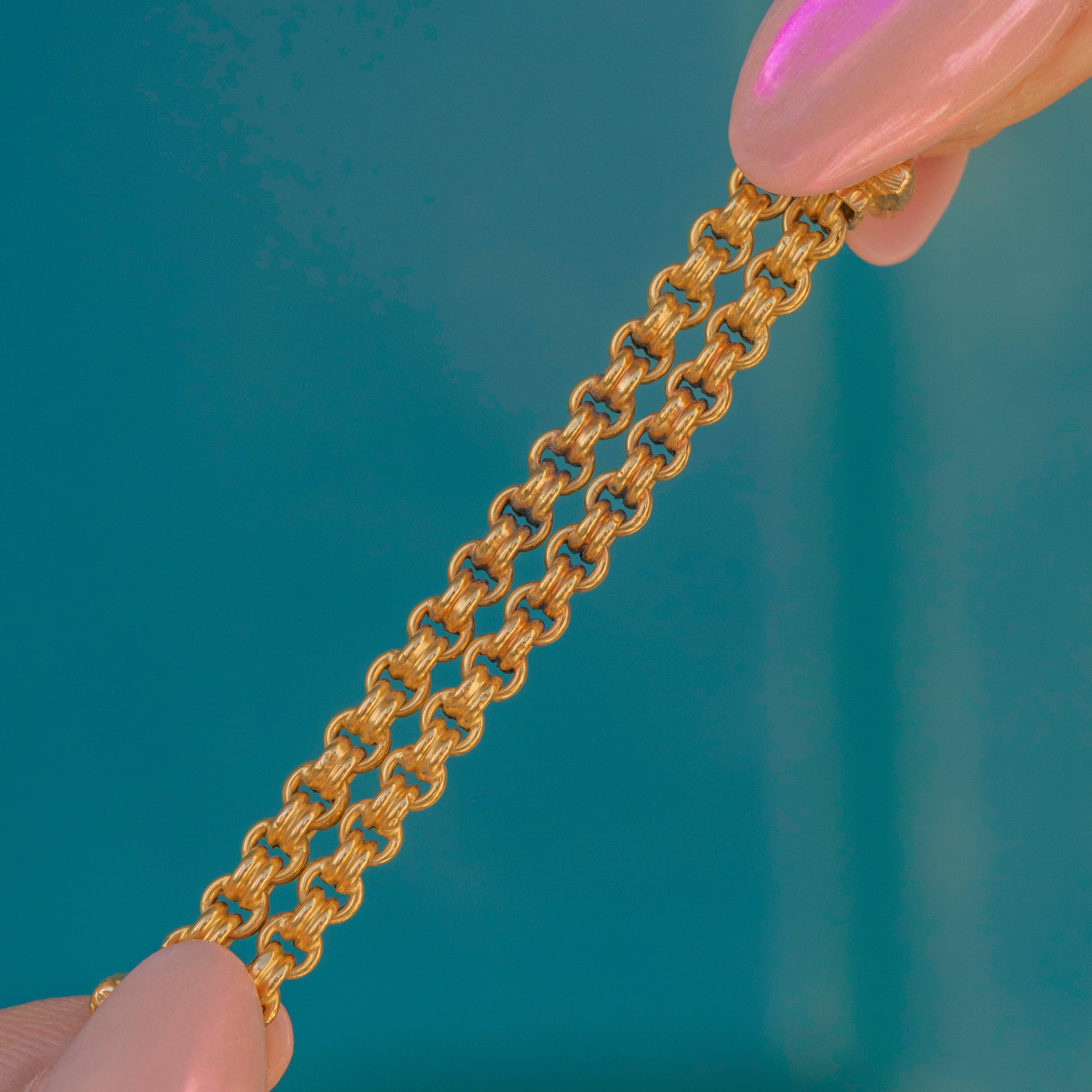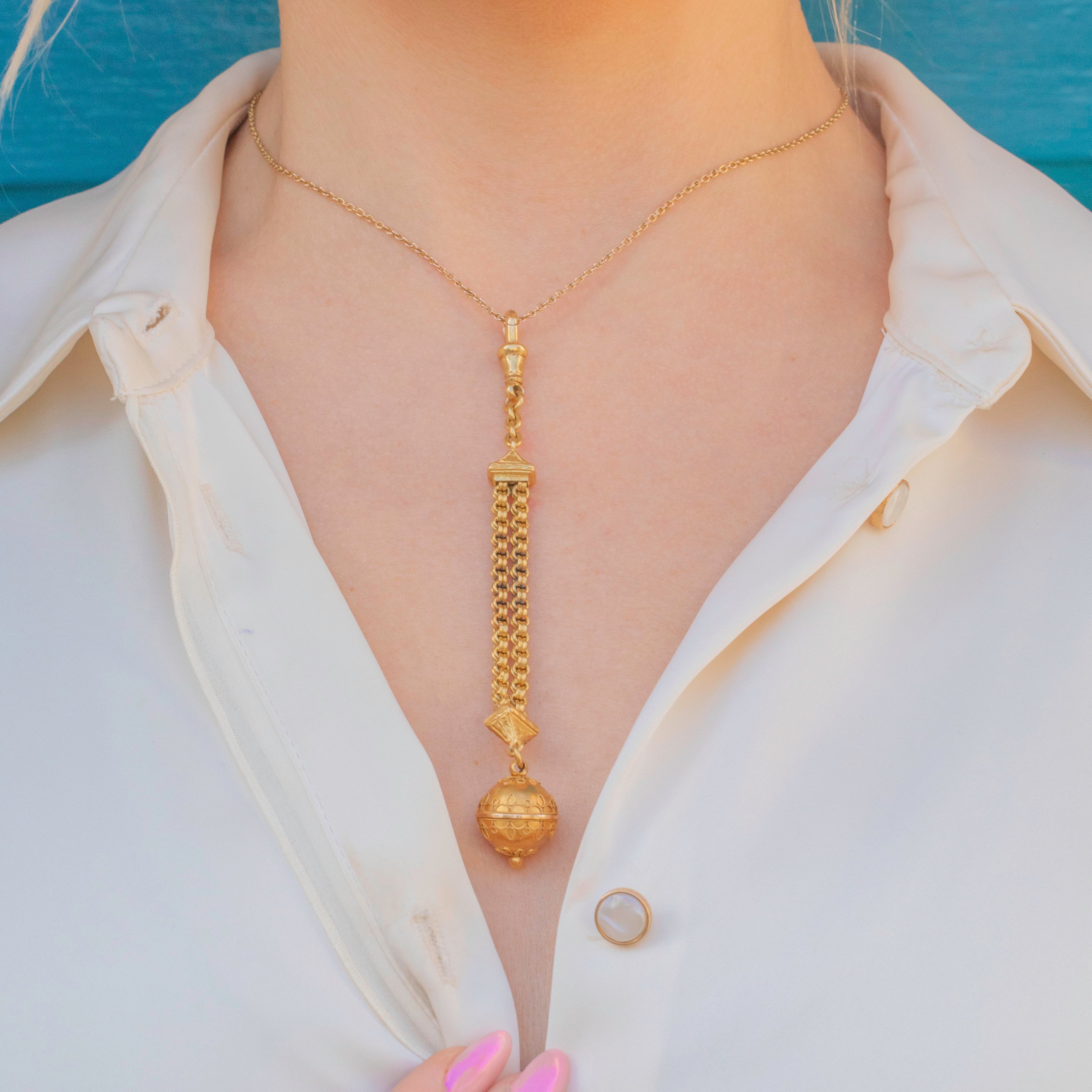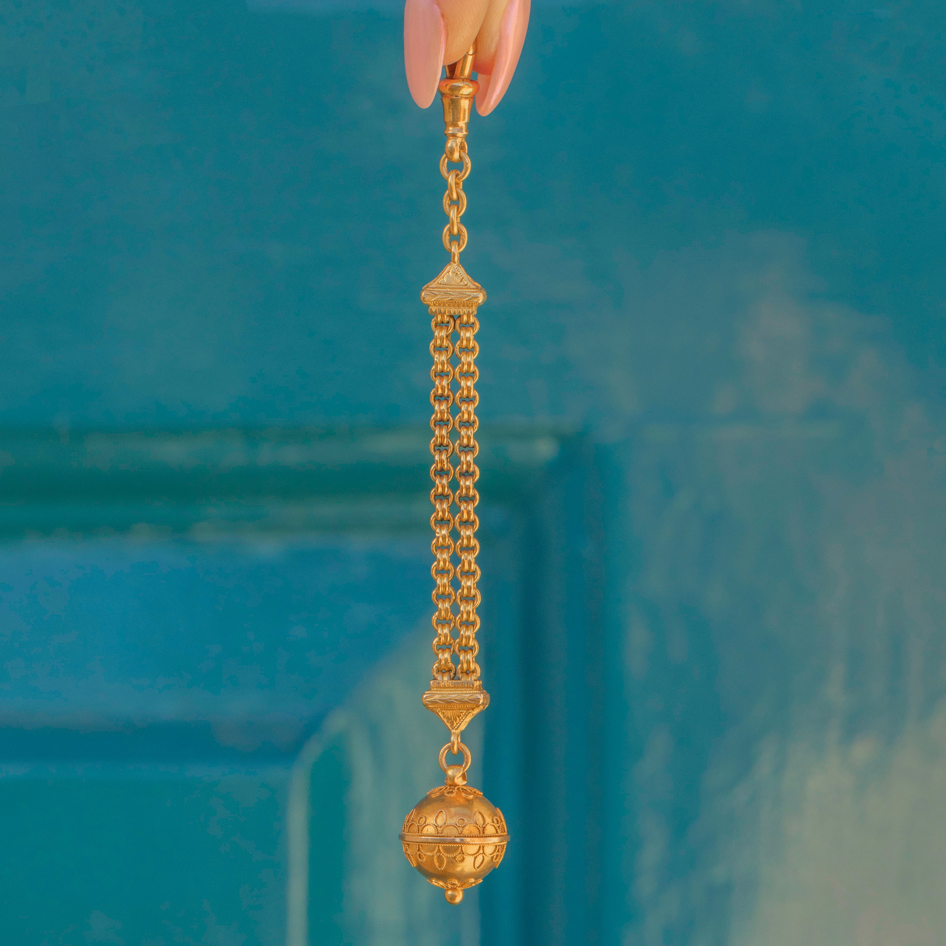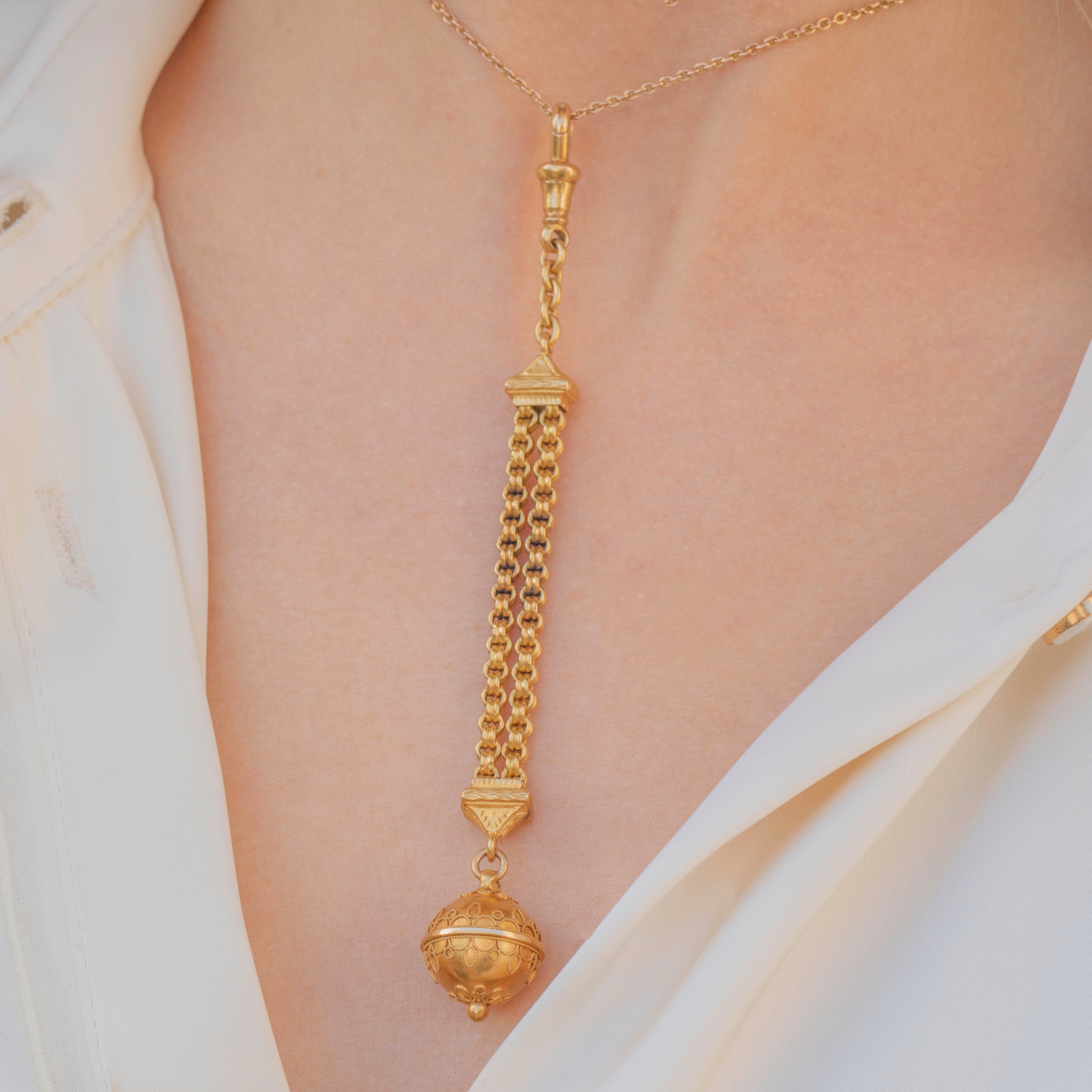 This Victorian 18ct Gold orb drop pendant is a captivating piece, featuring an ornate  Gold orb that hangs elegantly from a richly saturated Gold belcher chain. The orb is attached to a classic Victorian-style dog-clip clasp rendering her both classy and functional!