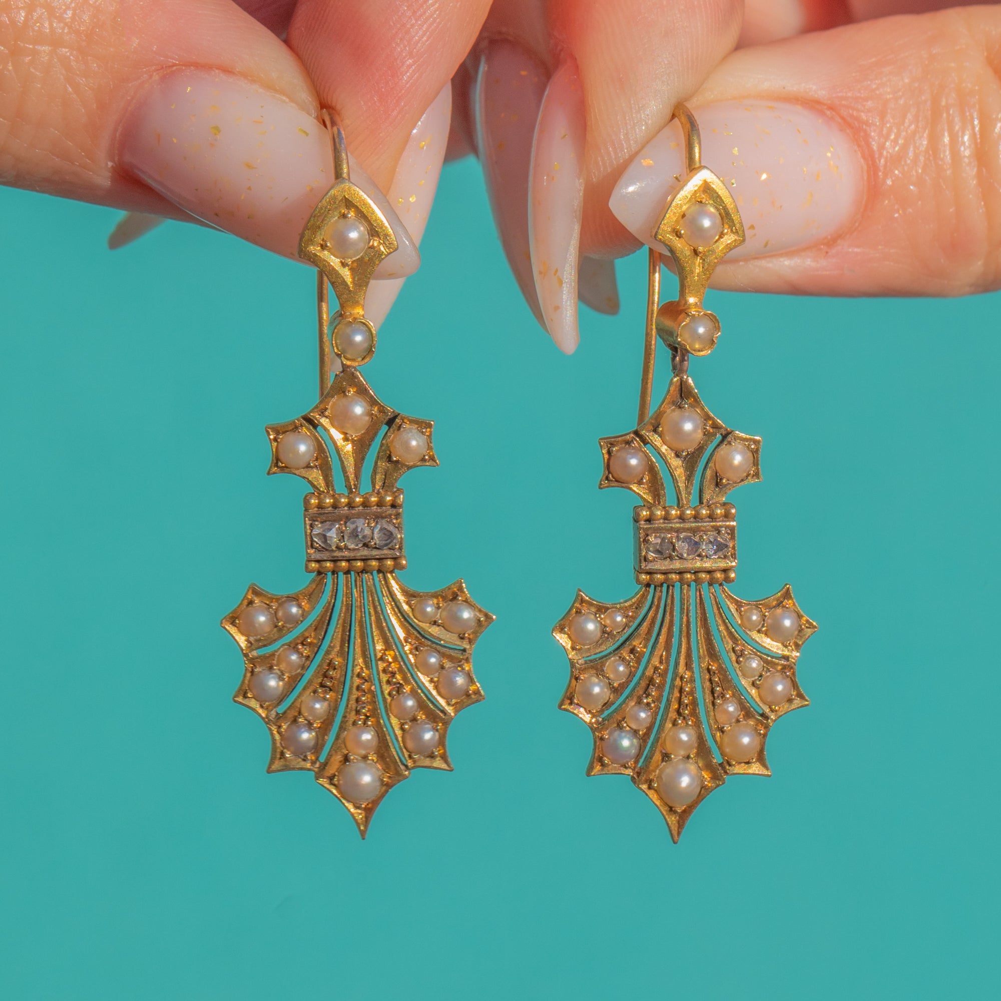 Richly ornate and utterly romantic, these Victorian Fleur de Lis drop earrings are a love letter to historic revival design. Crafted in glowing 18ct Gold, each earring cascades from a petite lozenge into a sculpted palmette fan, the surfaces alive with radiating flutes, beaded borders and delicately applied detail. Petite Pearls are scattered like dewdrops across the Gold, while a slim horizontal bar glints with Diamonds set within a contrasting pale-toned panel for a refined kiss of sparkle.