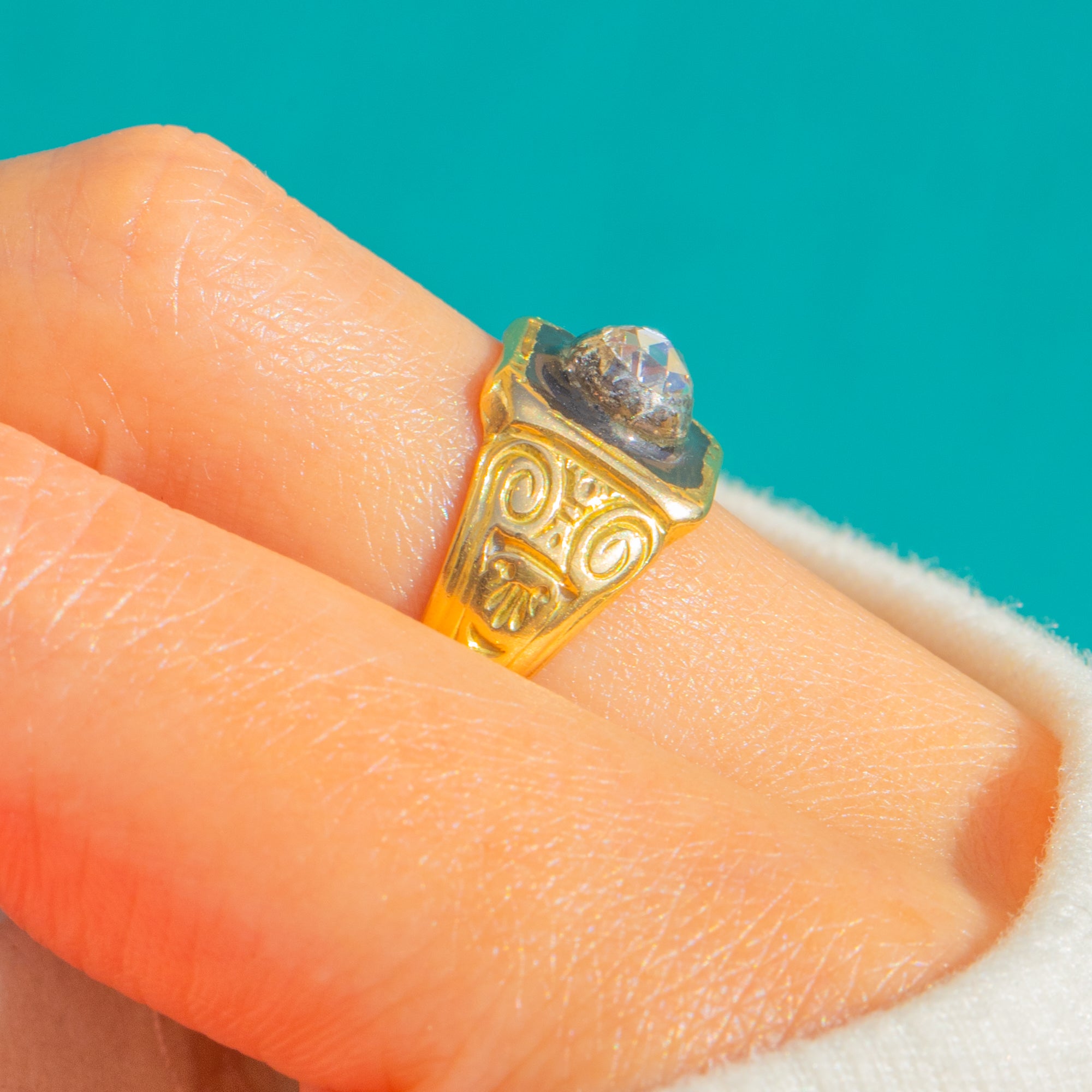 Ein erlesener Victorian-Ring mit tiefschwarzer Emaille, die einen leuchtenden Diamanten im Rosenschliff umrahmt. Der Diamant (ca. 0,35 ct) ist in einer patinierten Silber-Zarge gefasst; seine sanft gewölbte Form und funkelnden Facetten verleihen ihm einen romantischen, antiken Glanz. Gefertigt aus warmem 18ct Gold, sind die Schultern mit gravierten, floralen Voluten verziert und sorgen für ein elegantes, historisches Finish.