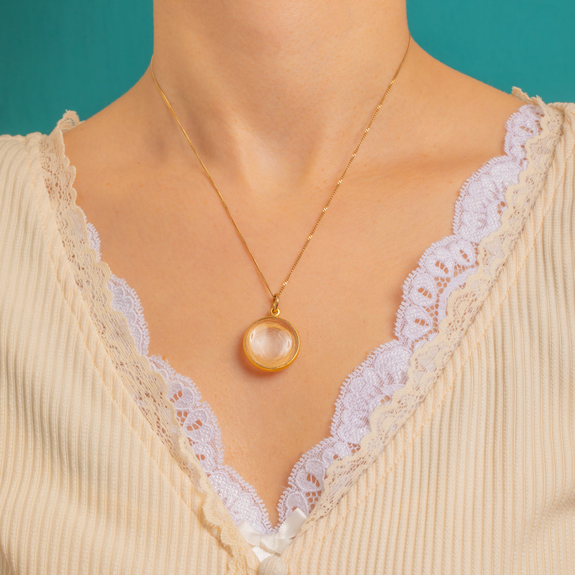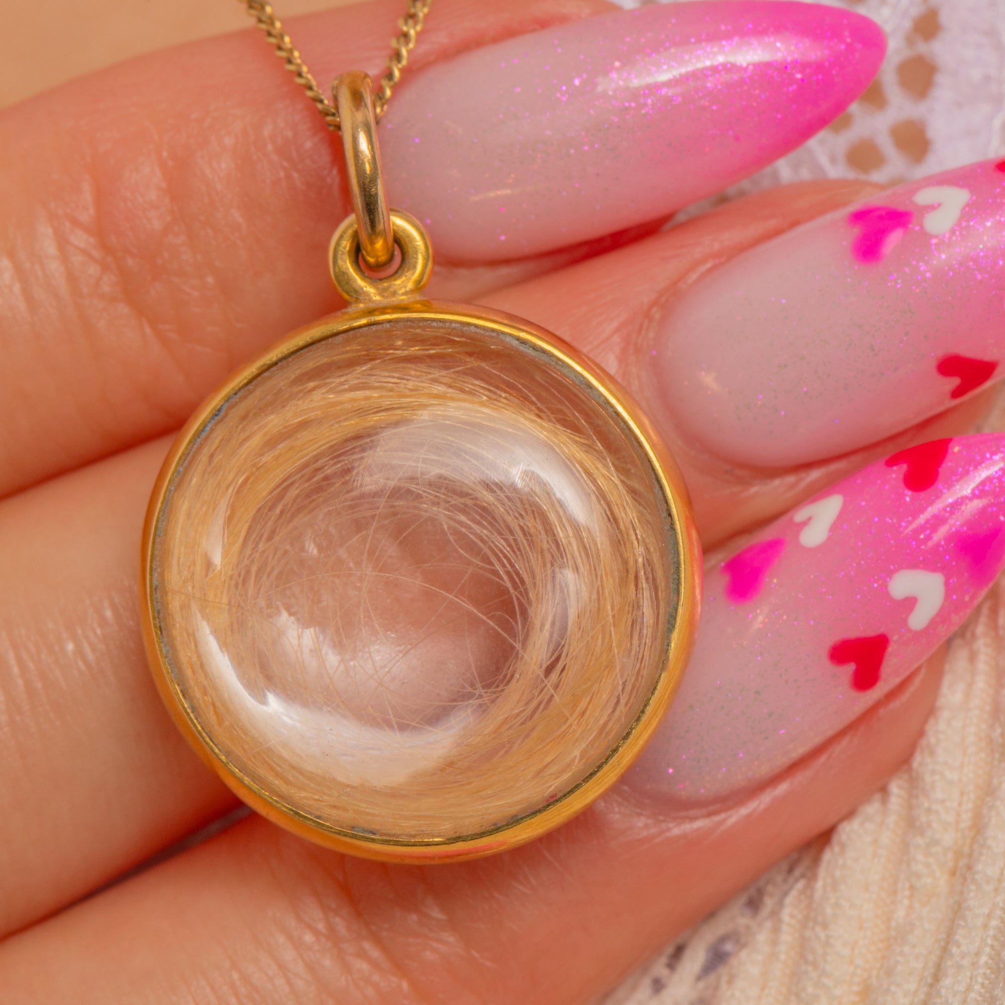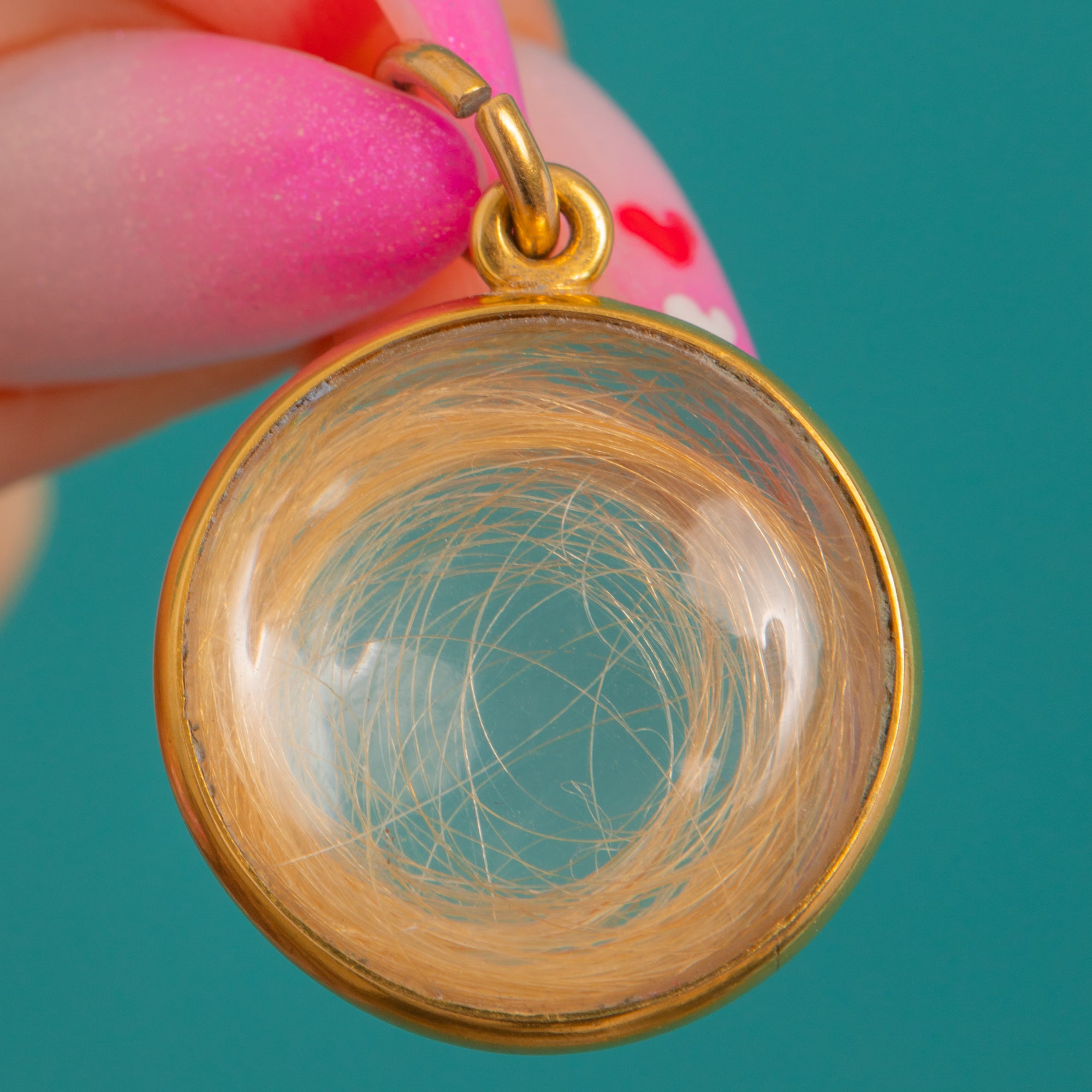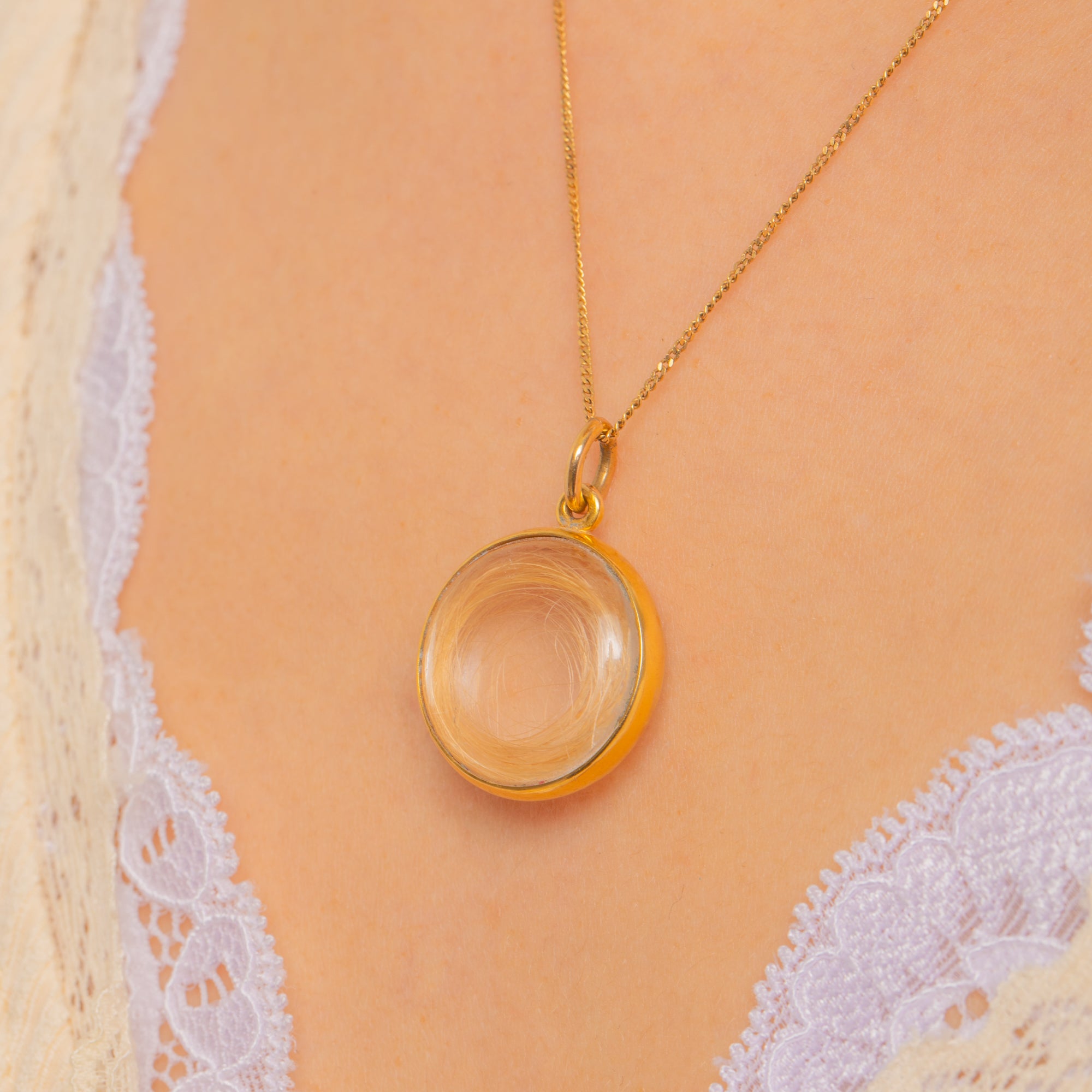A tender Victorian keepsake, this round 18ct Gold pendant holds a delicate coil of blonde hair beneath a pronounced, clear domed glass cover. The minimalist, polished bezel frames the memento with quiet elegance, letting the soft golden tones and intimate spiral take centre stage.