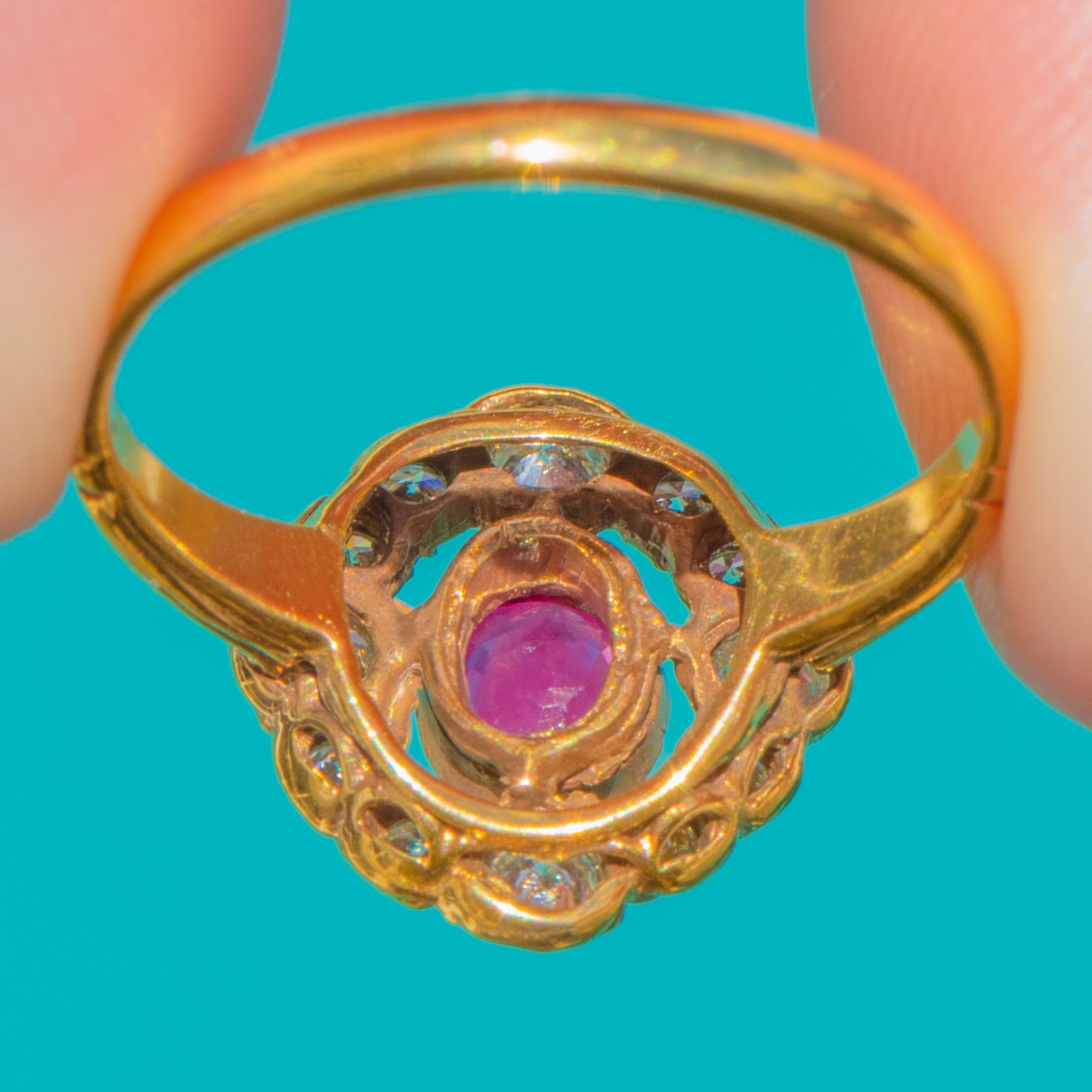 SEHR GUT–AUSGEZEICHNET: Rubin und Diamanten sind leuchtend, ohne Absplitterungen oder erkennbare Gebrauchsspuren, und bewahren ihr schönes Funkeln. Die 18ct Gold-Fassung, die gezackte Umrahmung und die durchbrochene Galerie sind sicher und hervorragend erhalten, mit leichter, altersgemäßer Oberflächenpatina. Die Ringschiene zeigt minimale Gebrauchsspuren; eine feine Lötlinie nahe dem Ringkopf deutet auf eine fachmännische historische Größenanpassung hin, stabil und beim Tragen nicht sichtbar.