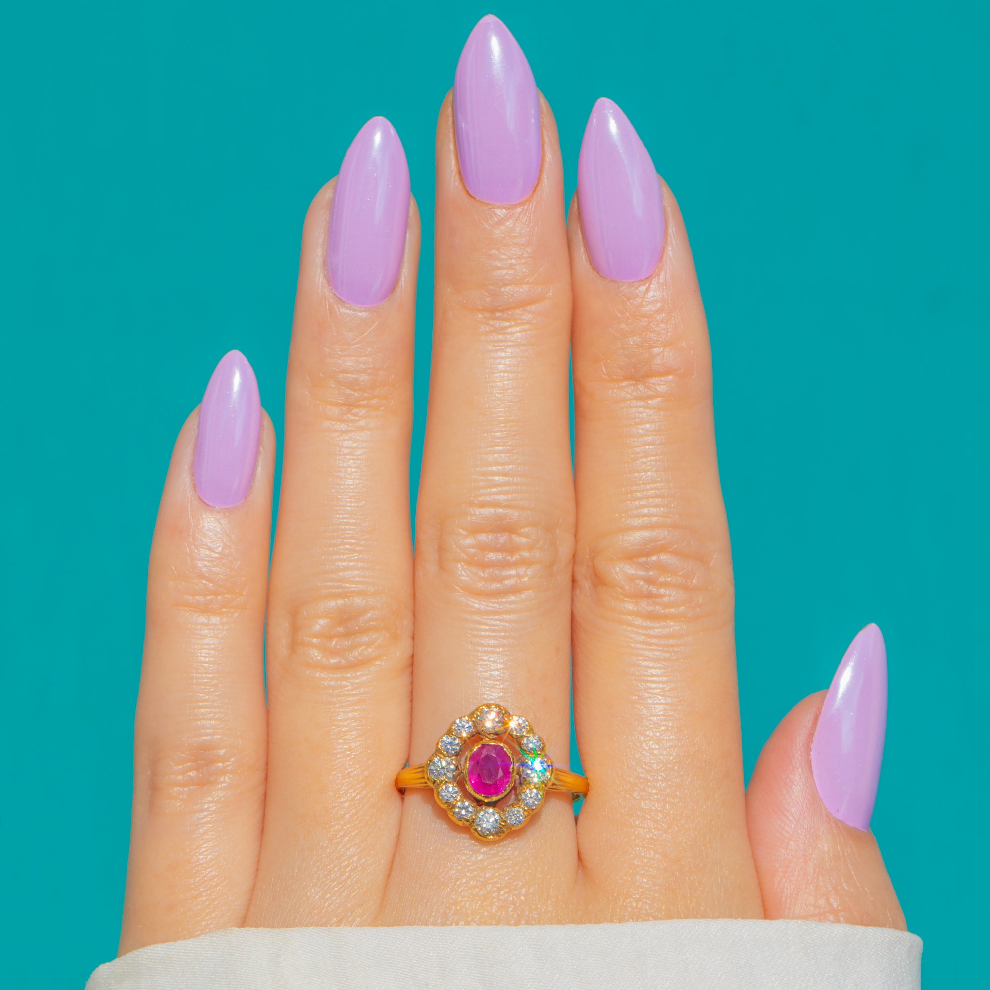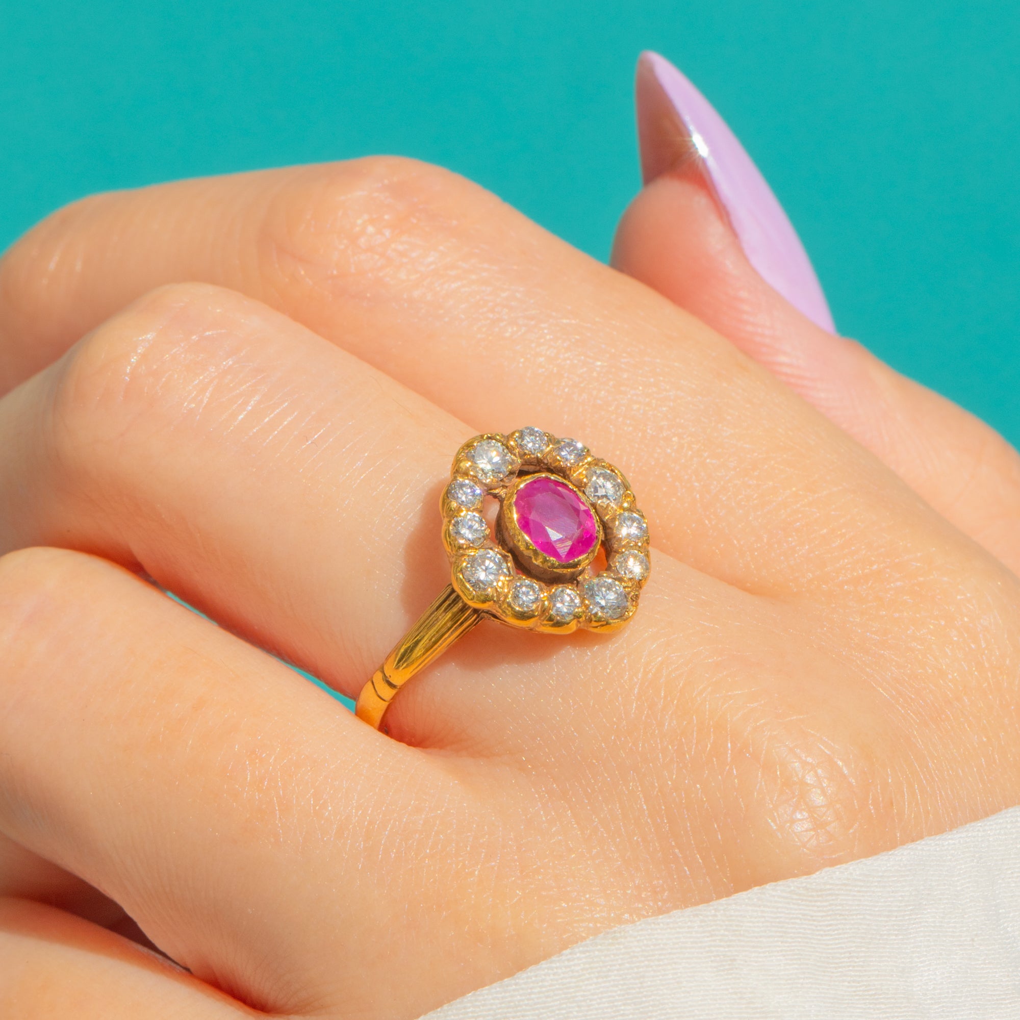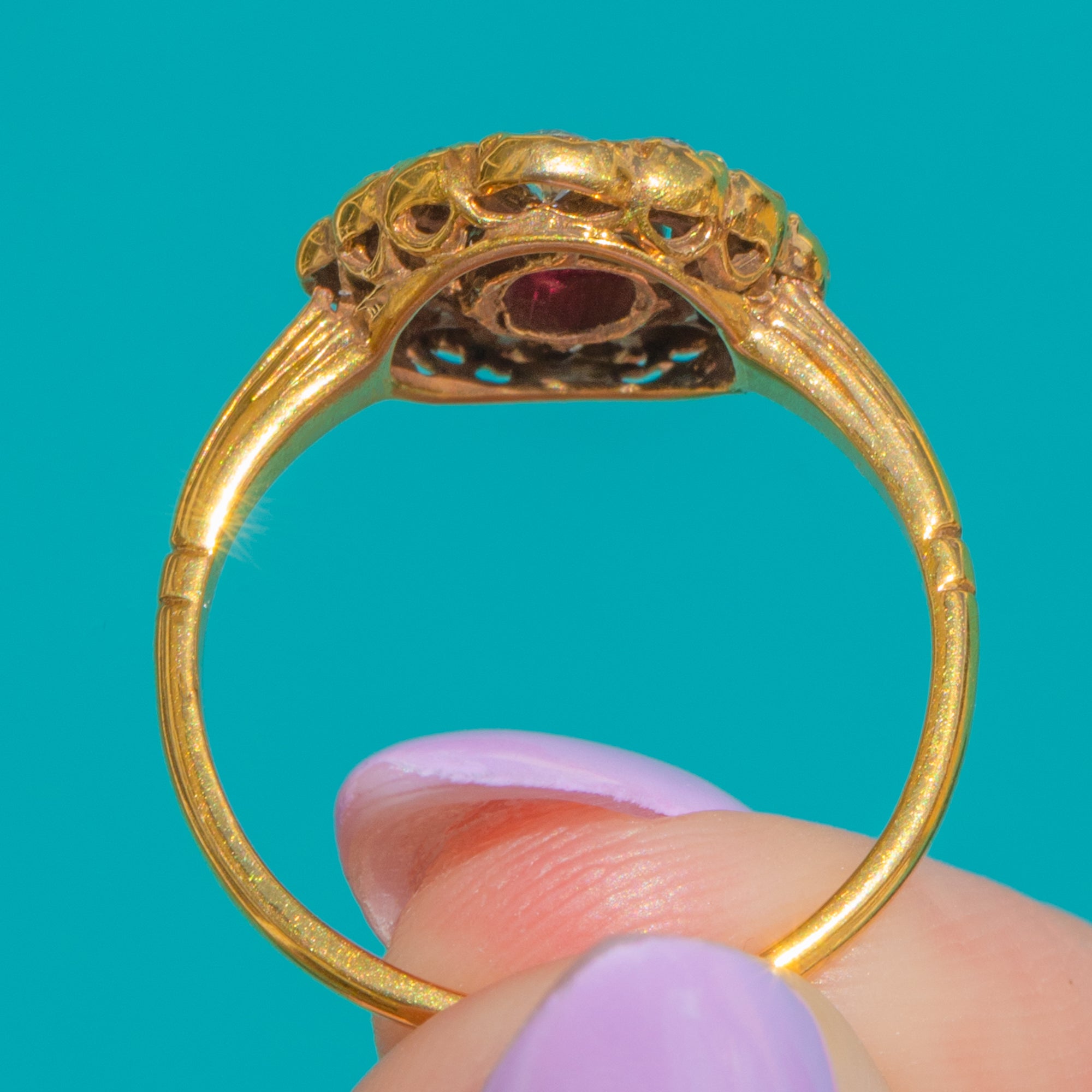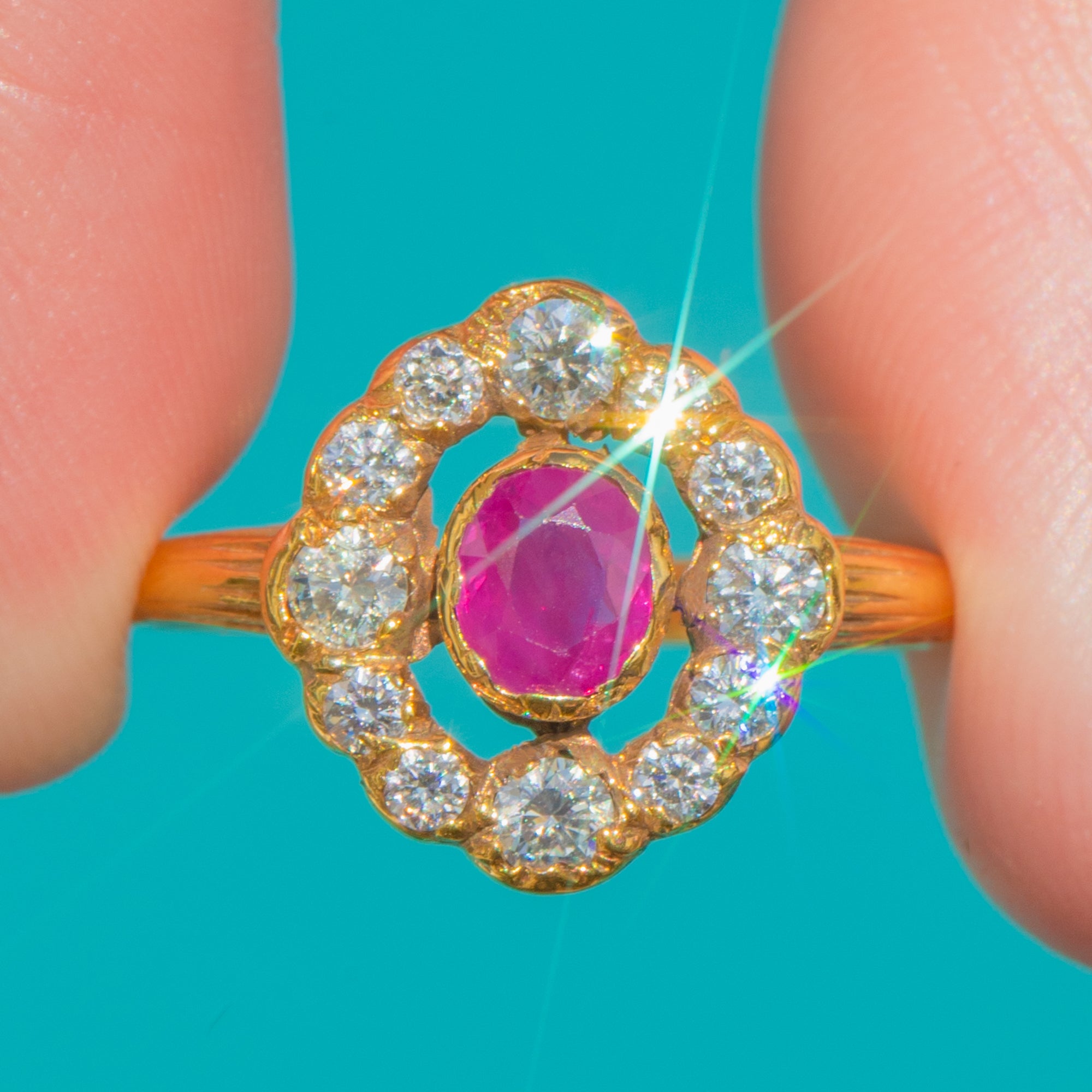 Ein zeitloser Victorian Cluster-Ring, der die Romantik dieser Epoche einfängt, gefertigt aus edlem 18ct Gold mit wunderbar detailreicher, handgearbeiteter Ausstrahlung. Im Zentrum erstrahlt ein ovaler Rubin von etwa 0,55ct, dessen lebhaft pink-roter Farbton in einer erhöhten Zargenfassung zur Geltung kommt und von einer fein gezackten Umrahmung eingefasst wird.