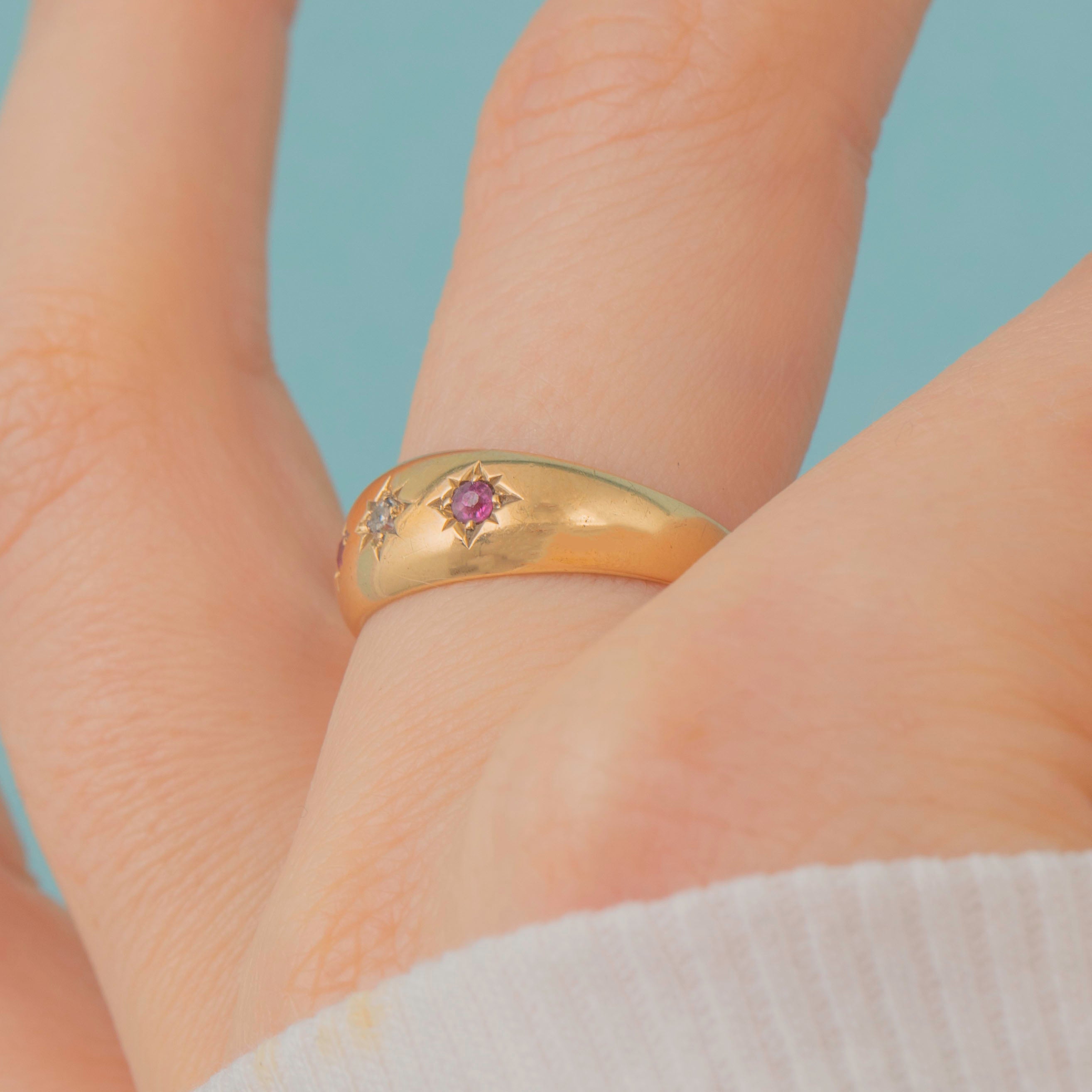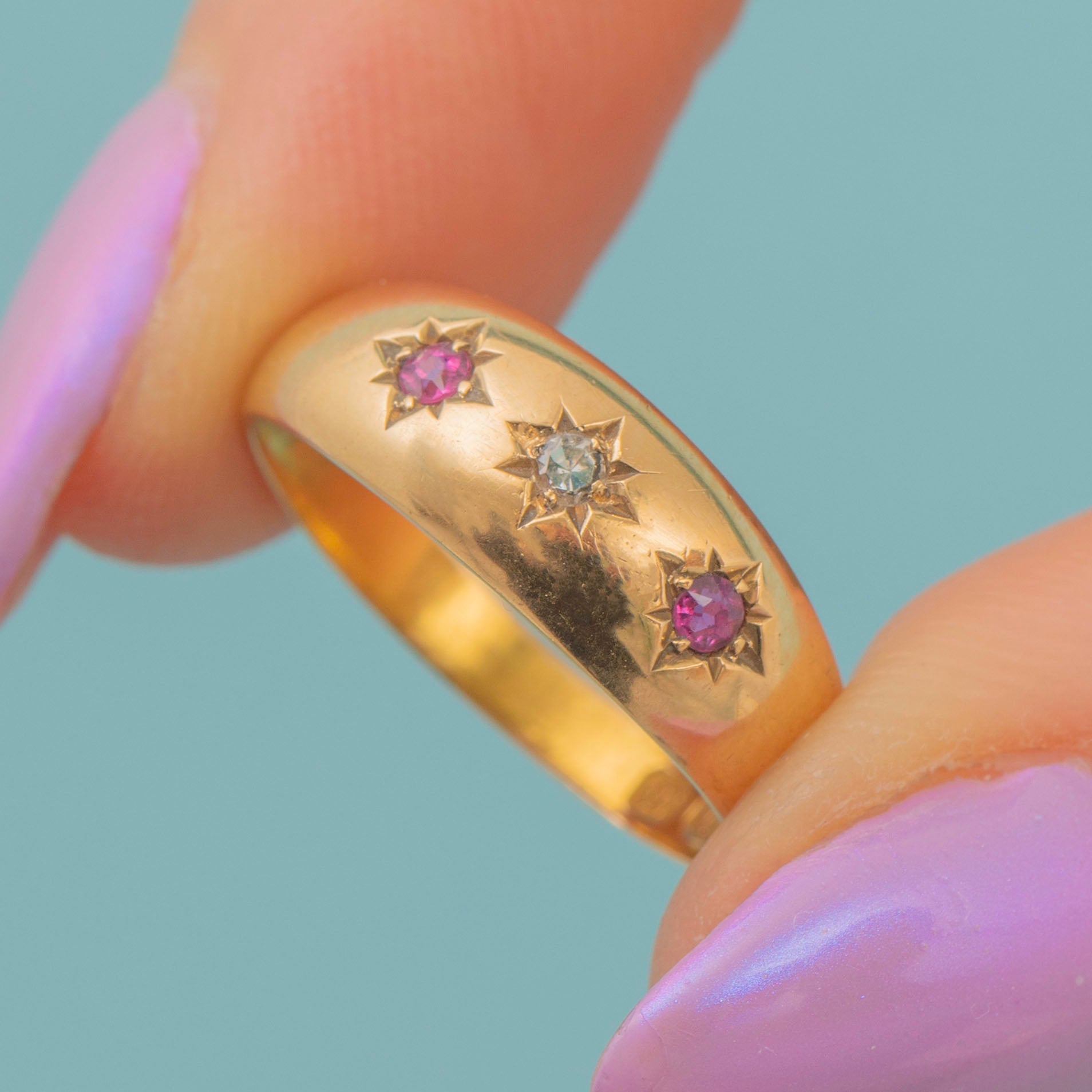 VERY GOOD-EXCELLENT: This Victorian 18ct Gold Ruby Diamond gypsy ring is in superb condition. Her gemstones are radiant and secure within their star settings. There are minor signs of wear to the Gold, including some small pinprick marks to the front, however this is difficult to spot without a jeweller's loupe. The band comes complete with a full set of English hallmarks dating to 1892, making this Victorian gypsy ring a coveted piece!