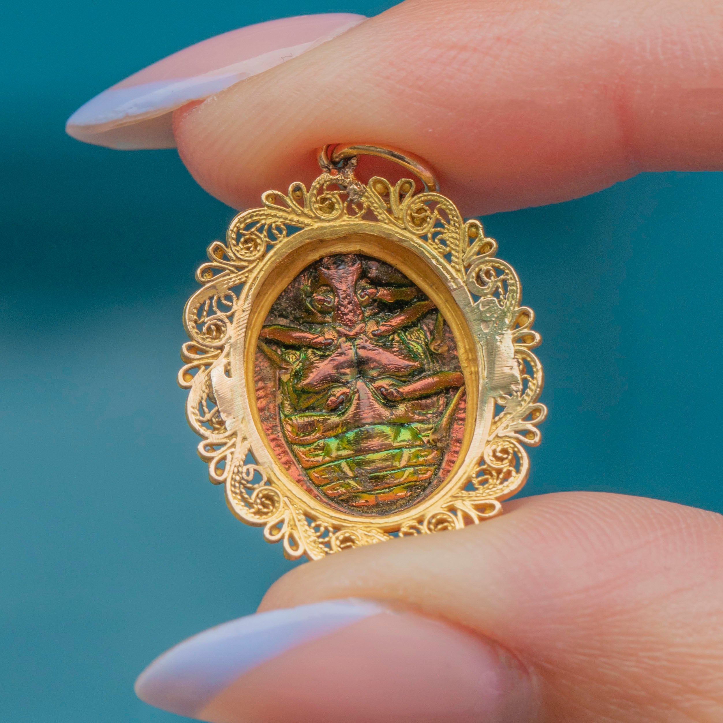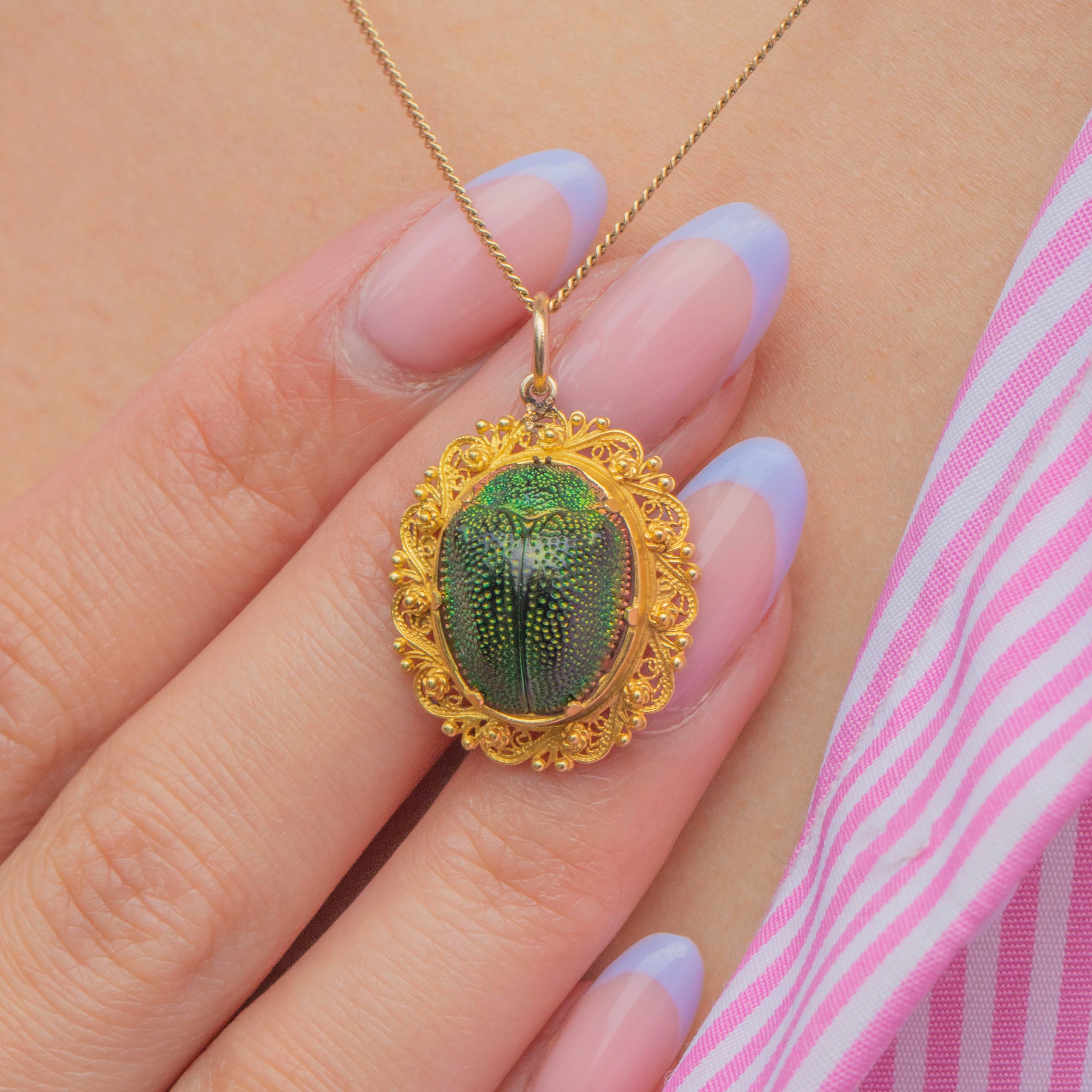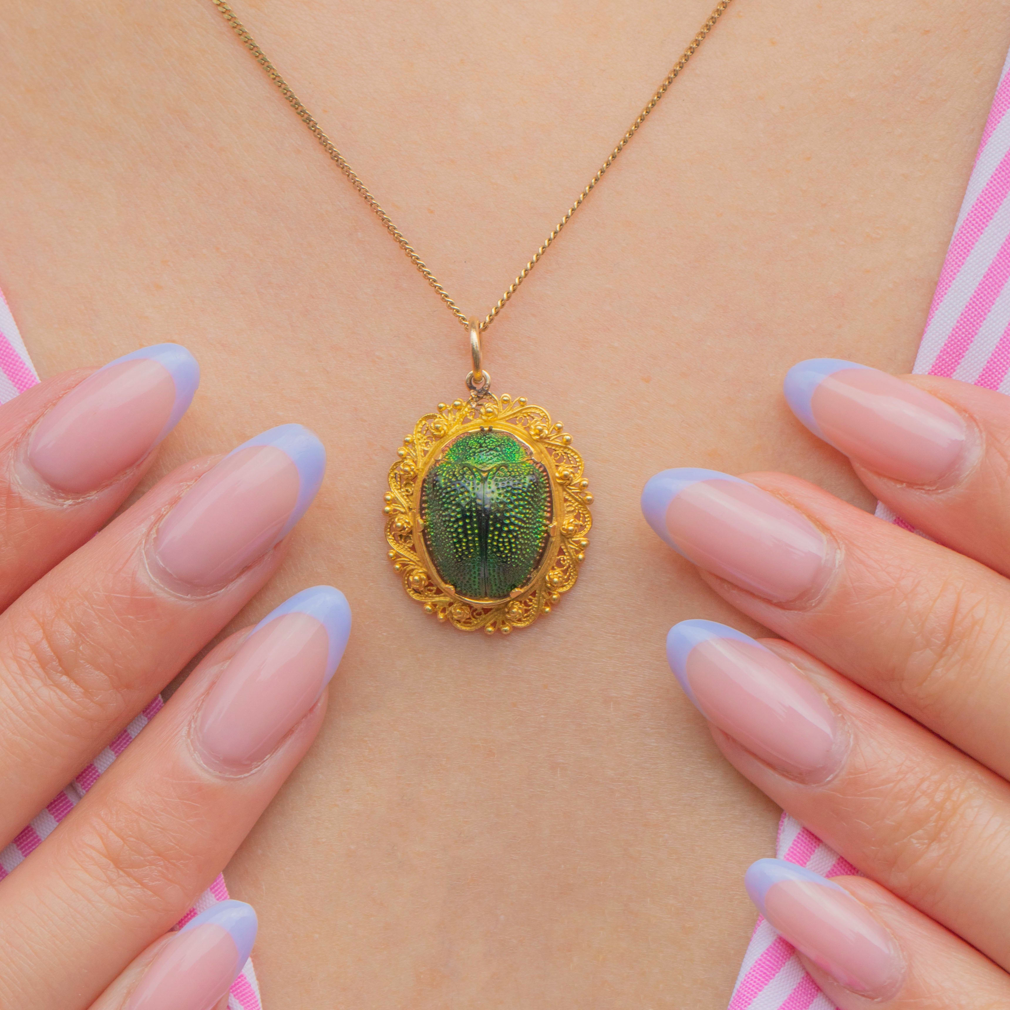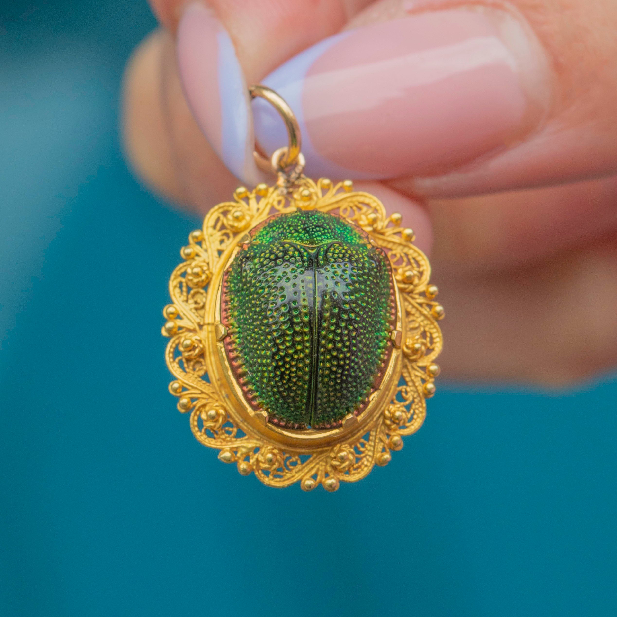 EXCELLENT: This Victorian 18ct Gold Scarab Beetle filigree pendant is in excellent antique condition. The beetle itself is in lovely condition, perfectly preserved, and free from damage. Her 18ct Gold filigree border is in pristine condition - bright and beautiful with no dings or dents. Firmly attached to the Gold jump-ring, this characterful pendant will become your new favourite item!