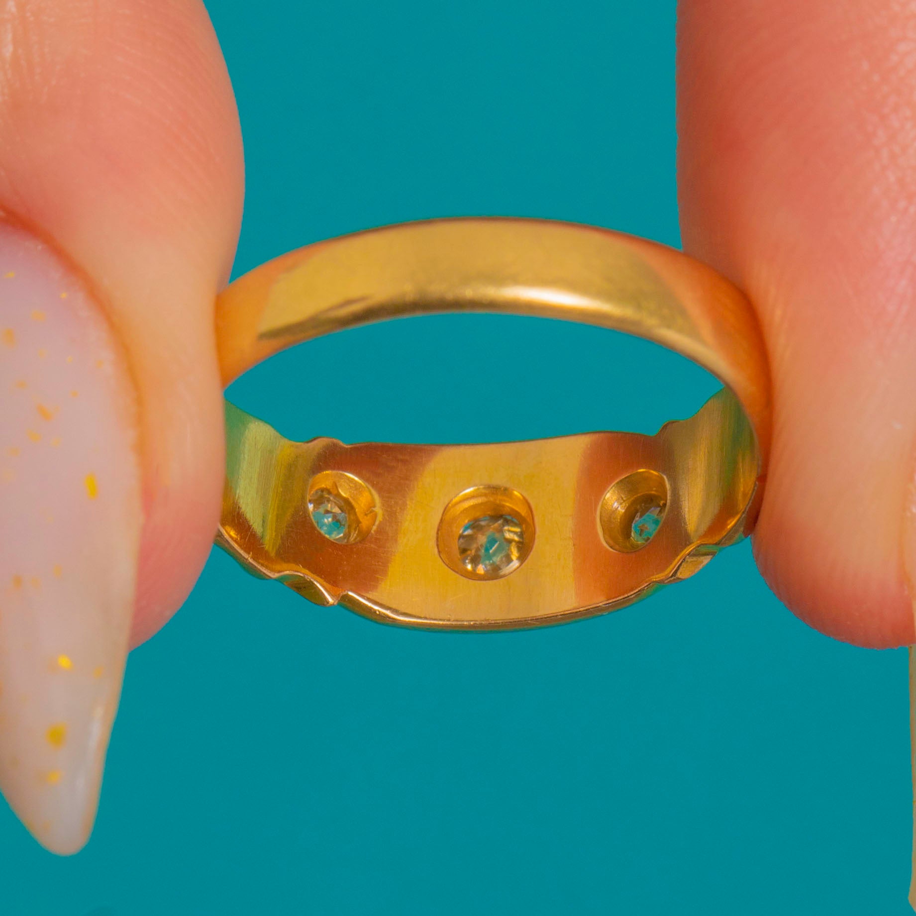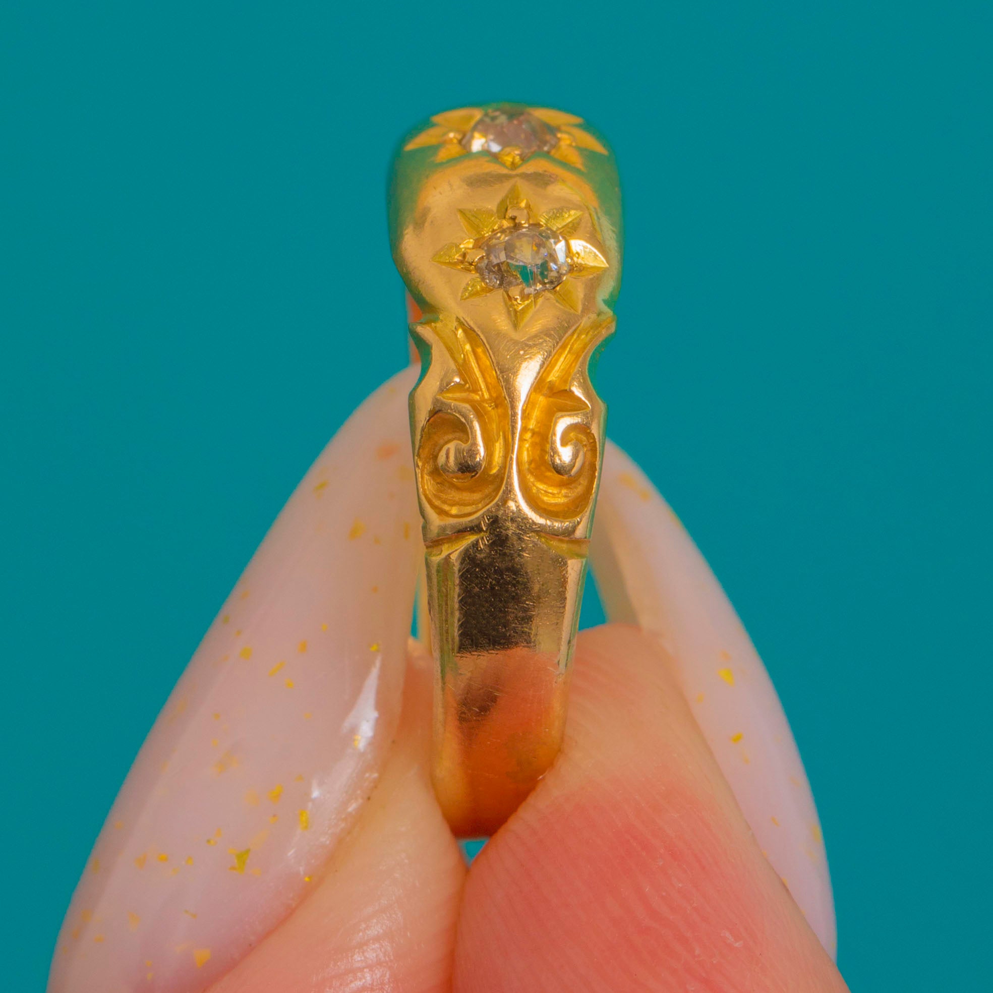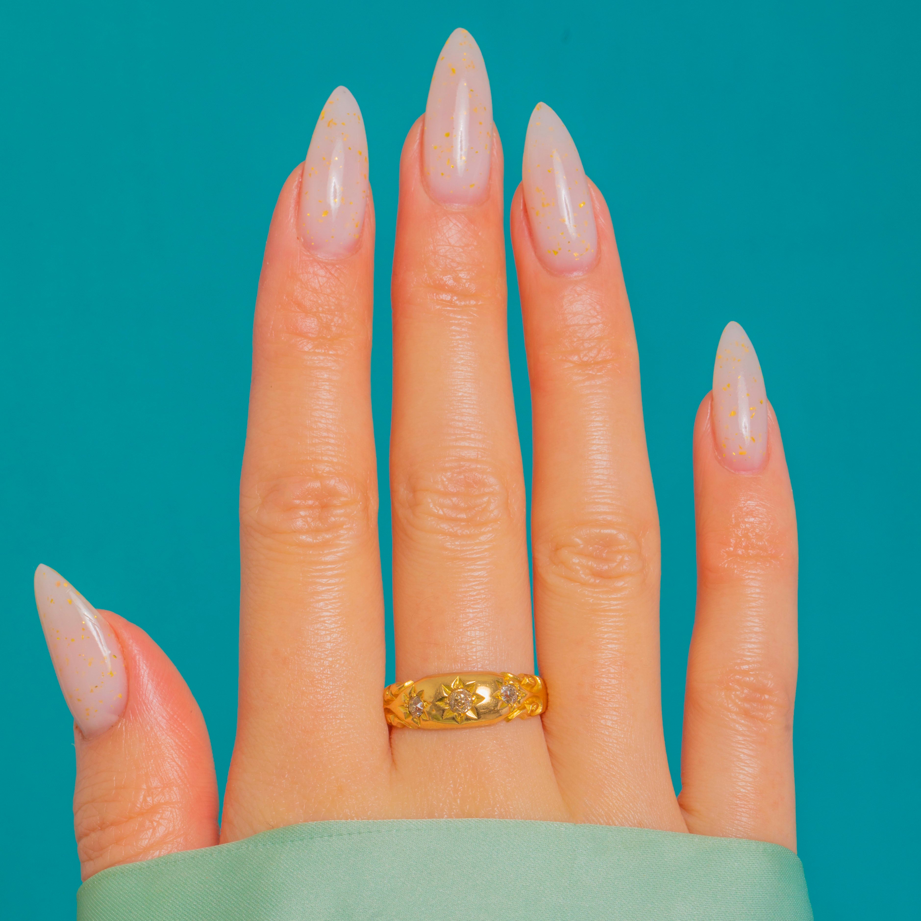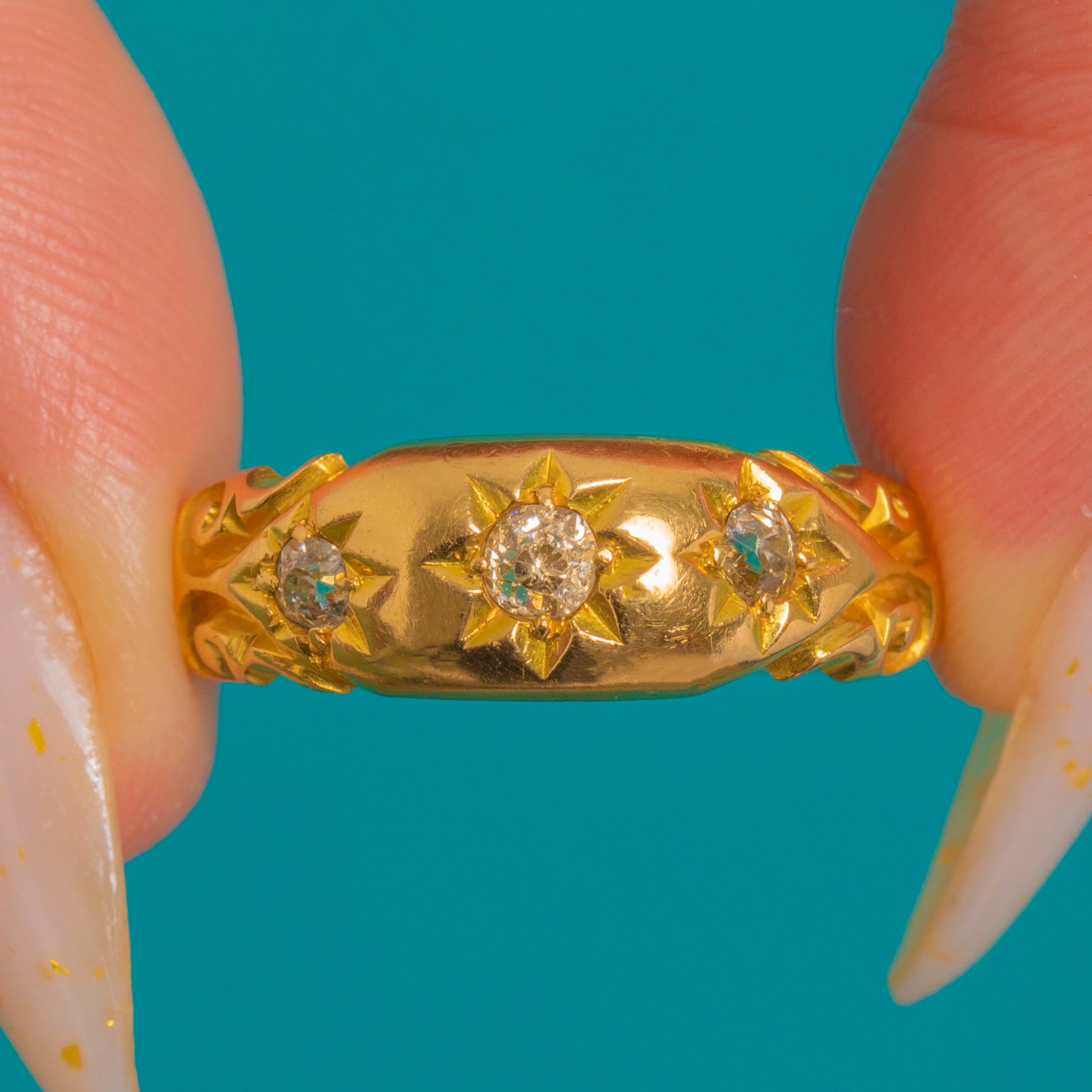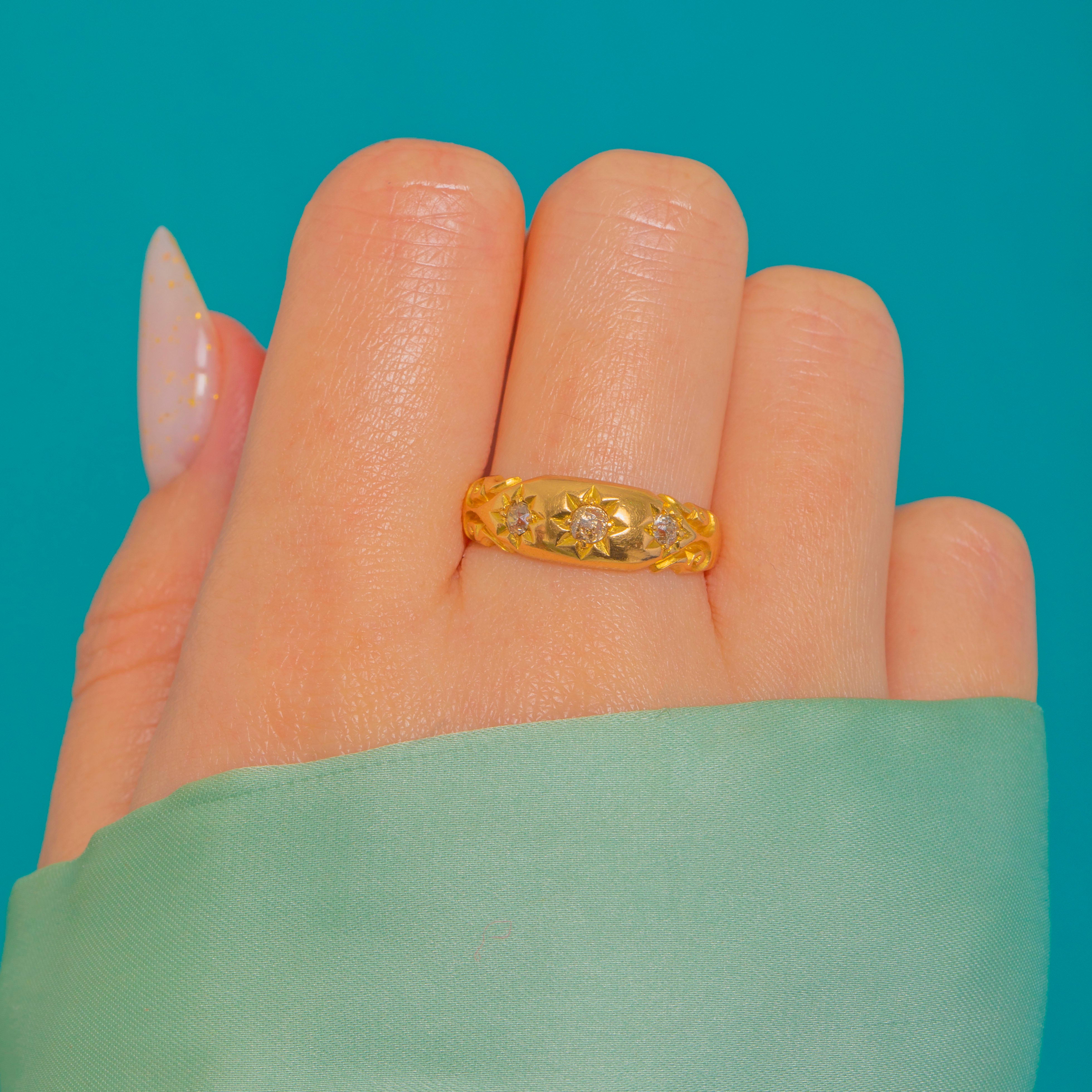 A classic Victorian gypsy ring, this star-set trilogy glows in rich 18ct Gold with a gently domed, polished profile. Three sparkling Diamonds are flush-set within crisp eight-point starbursts, the central stone slightly larger for a subtle graduation that draws the eye.