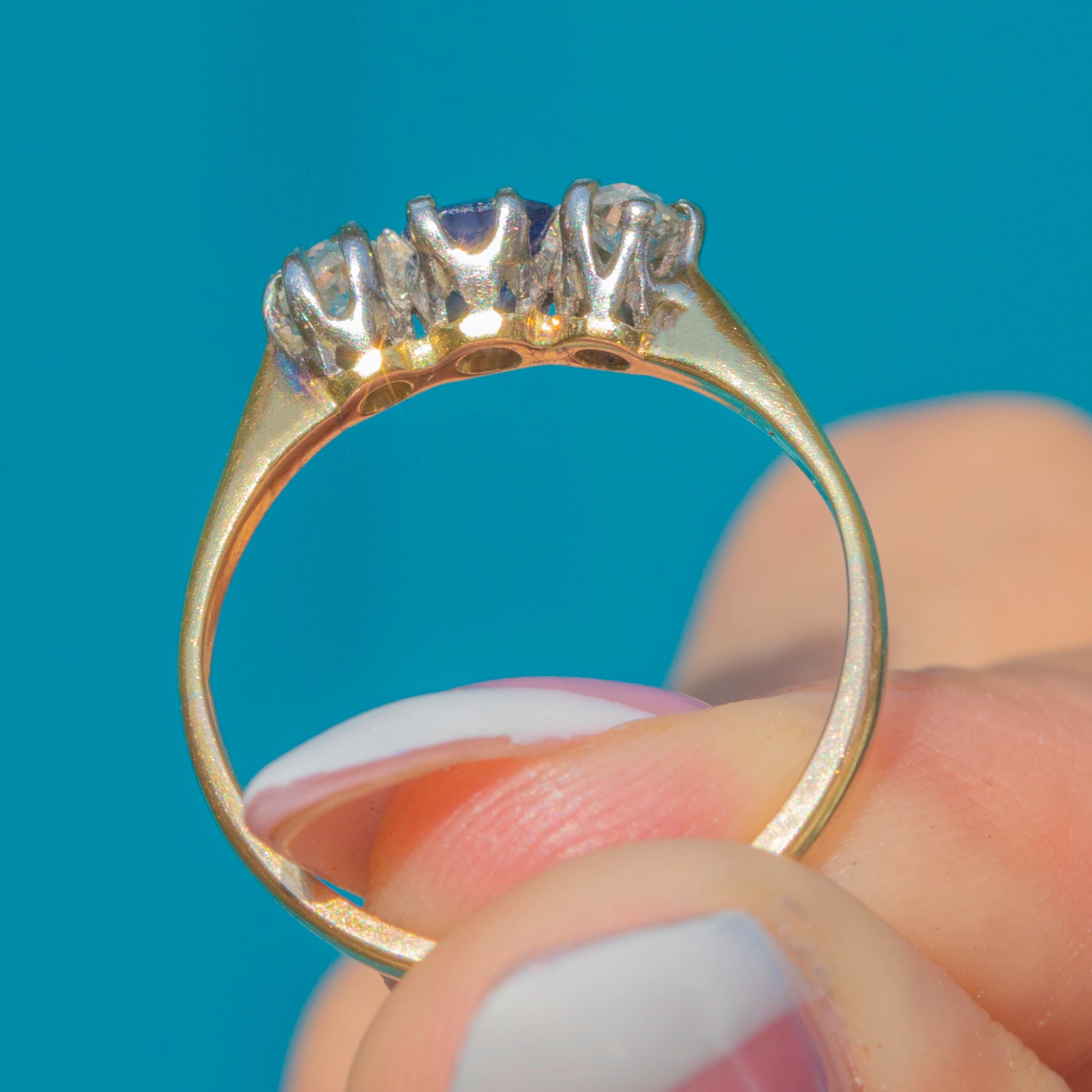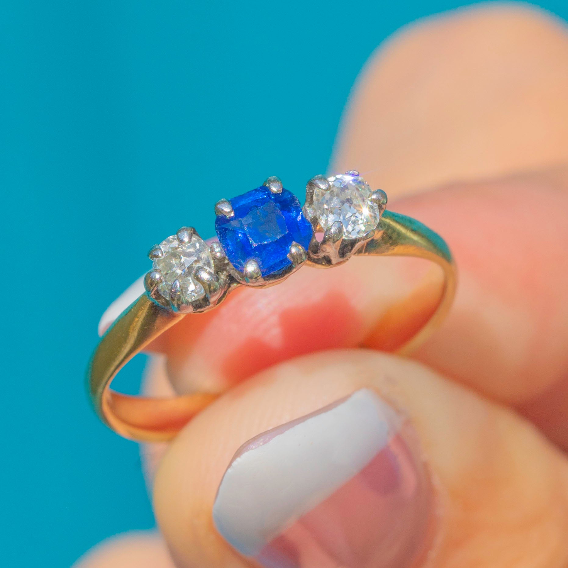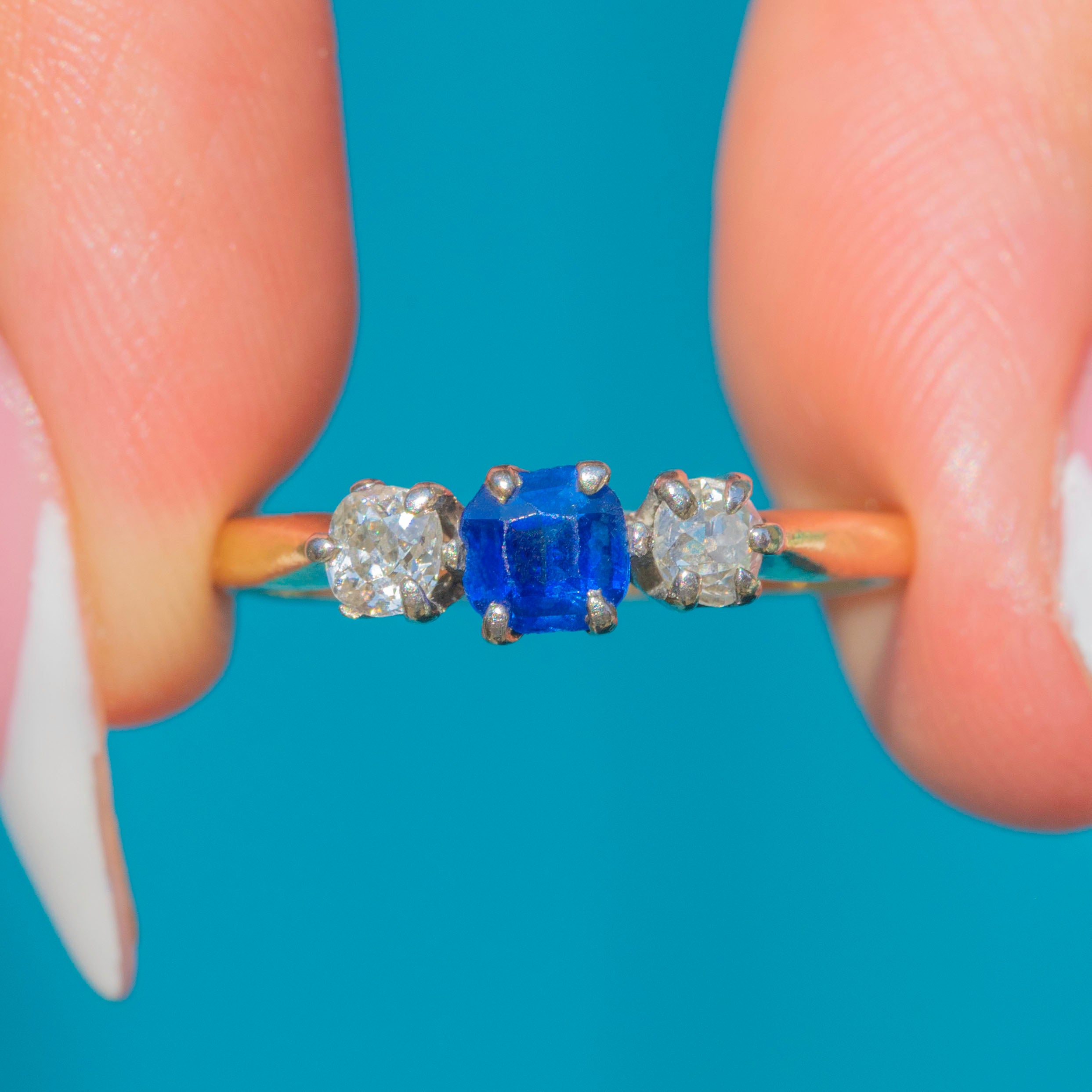 This Victorian 18ct Sapphire Diamond Trilogy Ring features a central cushion-cut Sapphire flanked by Old Mine Cut Diamonds in a classic trilogy setting.