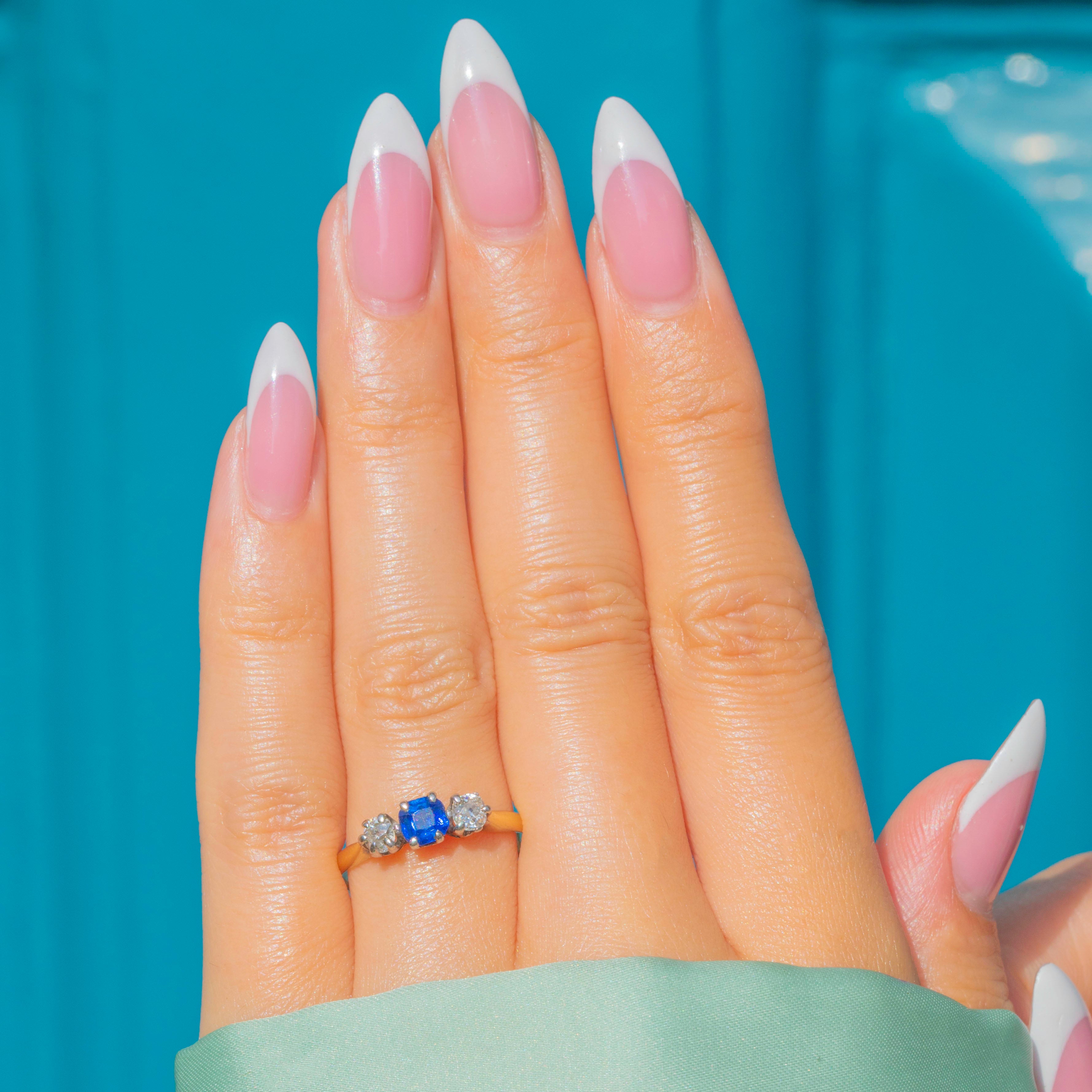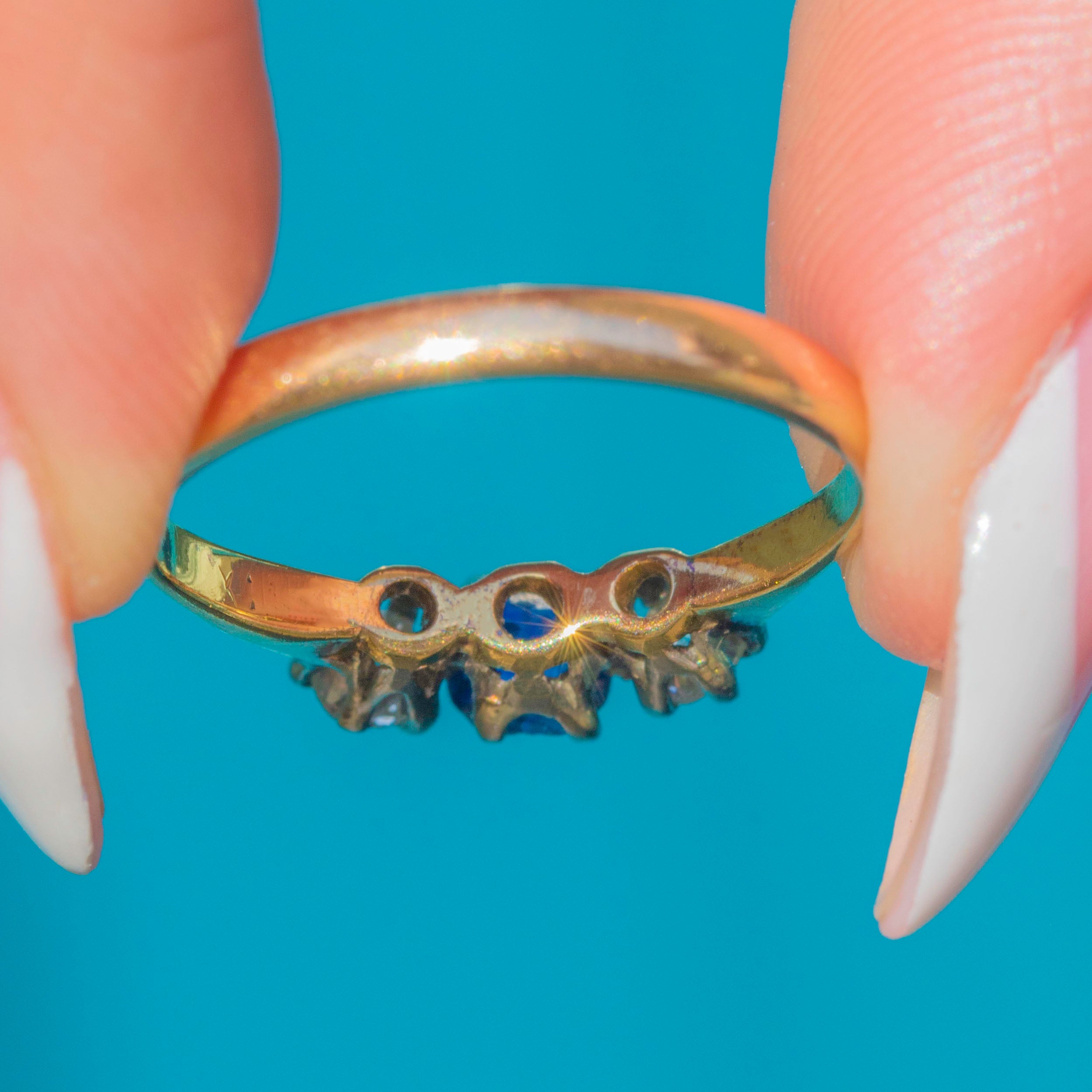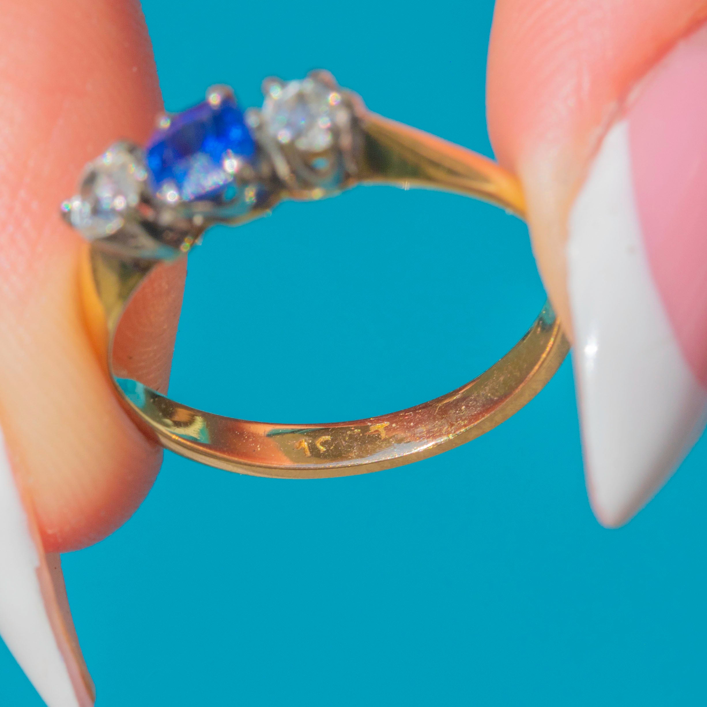 This Victorian 18ct Sapphire Diamond Trilogy Ring features a central cushion-cut Sapphire flanked by Old Mine Cut Diamonds in a classic trilogy setting.