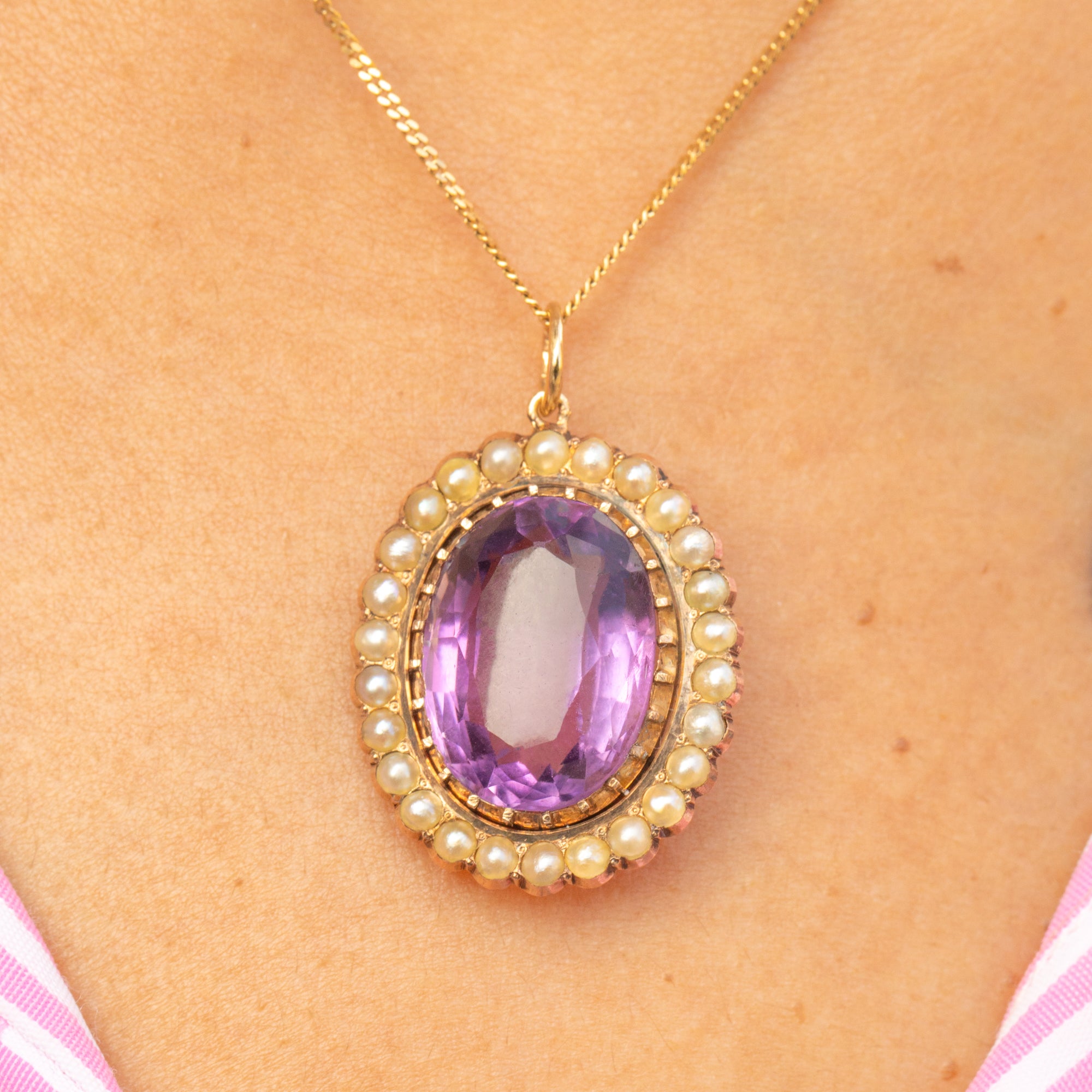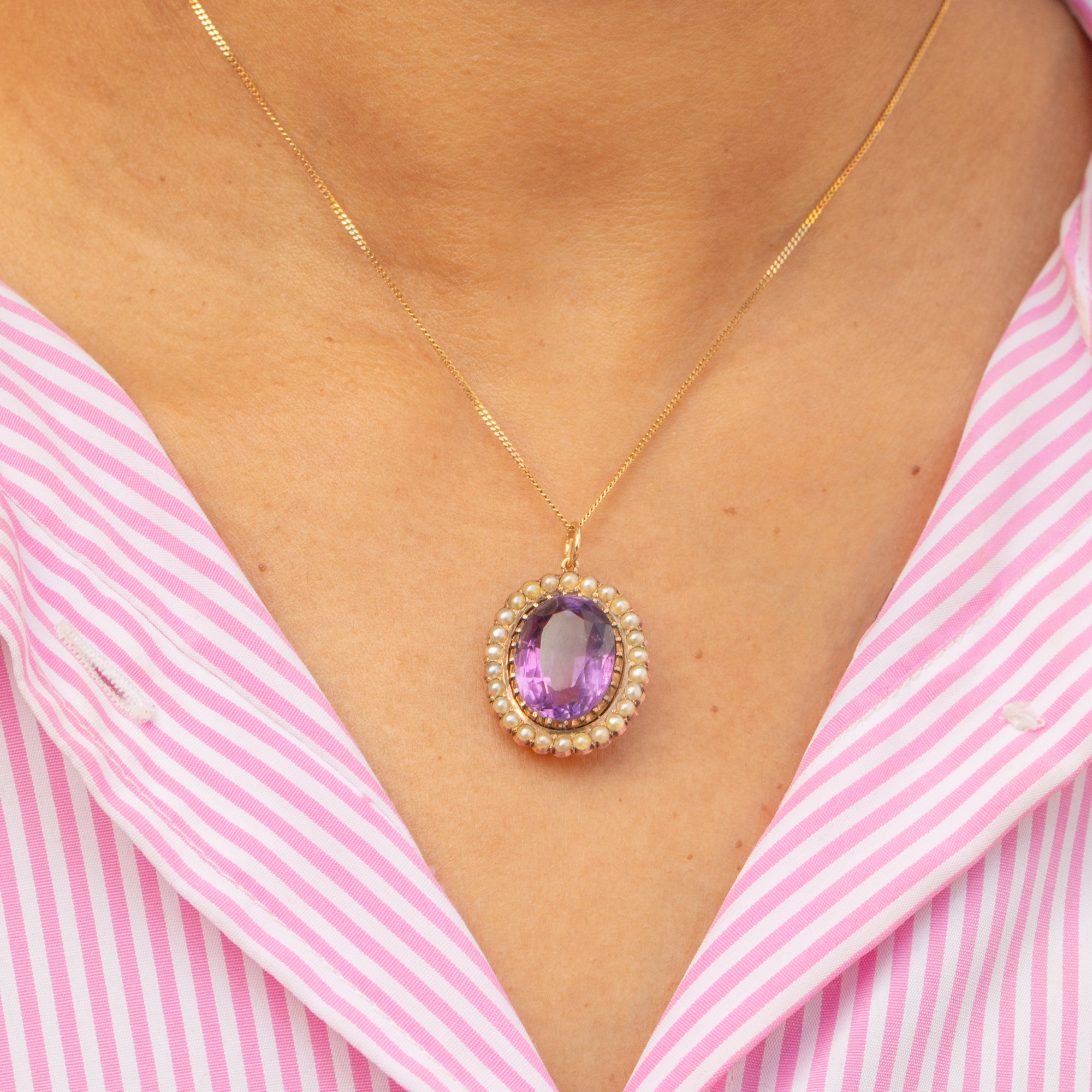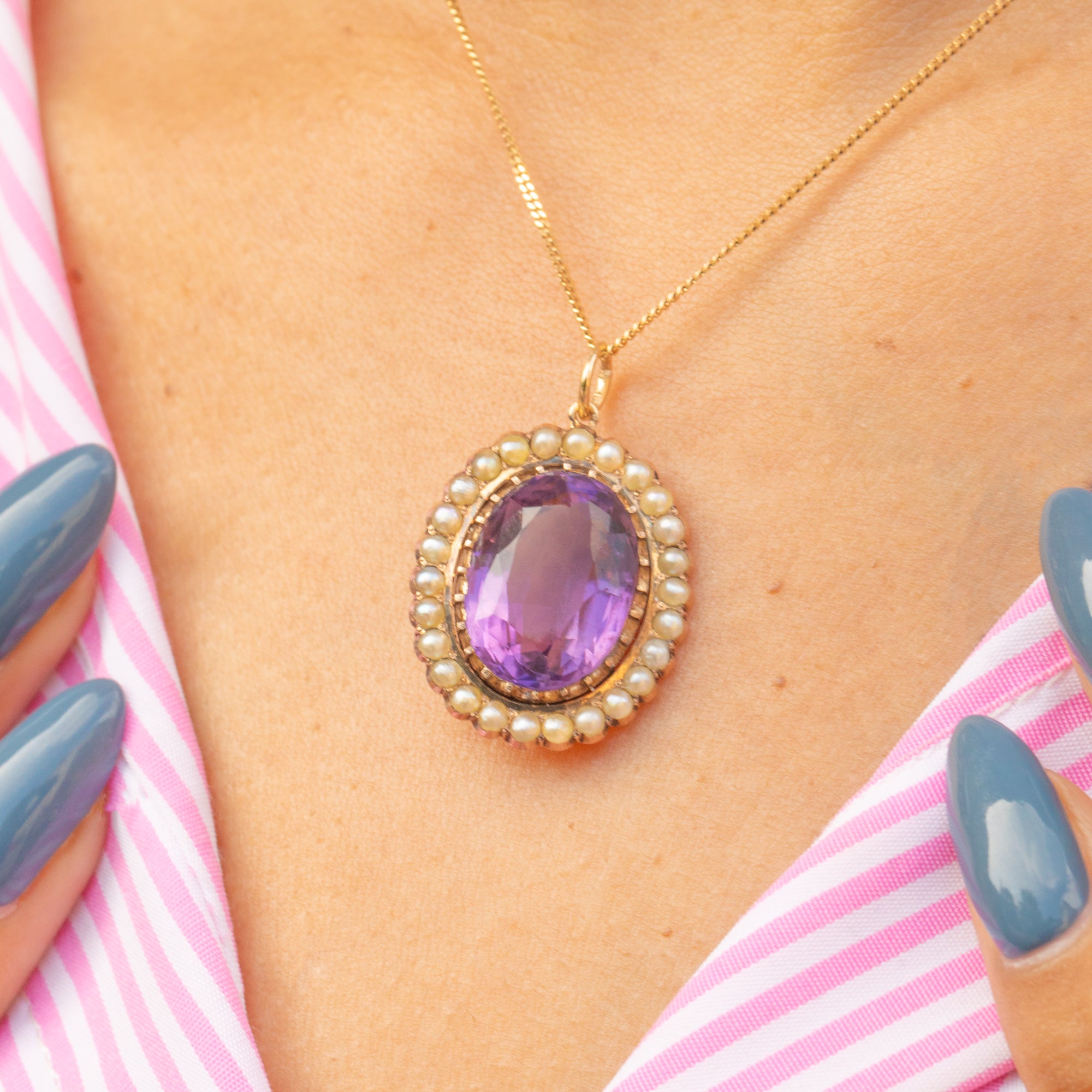 An exquisite Victorian 9ct Gold Amethyst Pearl oval pendant! At the centre of this Victorian piece lies an 9.00ct Amethyst, boasting a rich purple colour infused with orchid hues and surrounding it are a gorgeous selection of plump satin sheened Pearls.