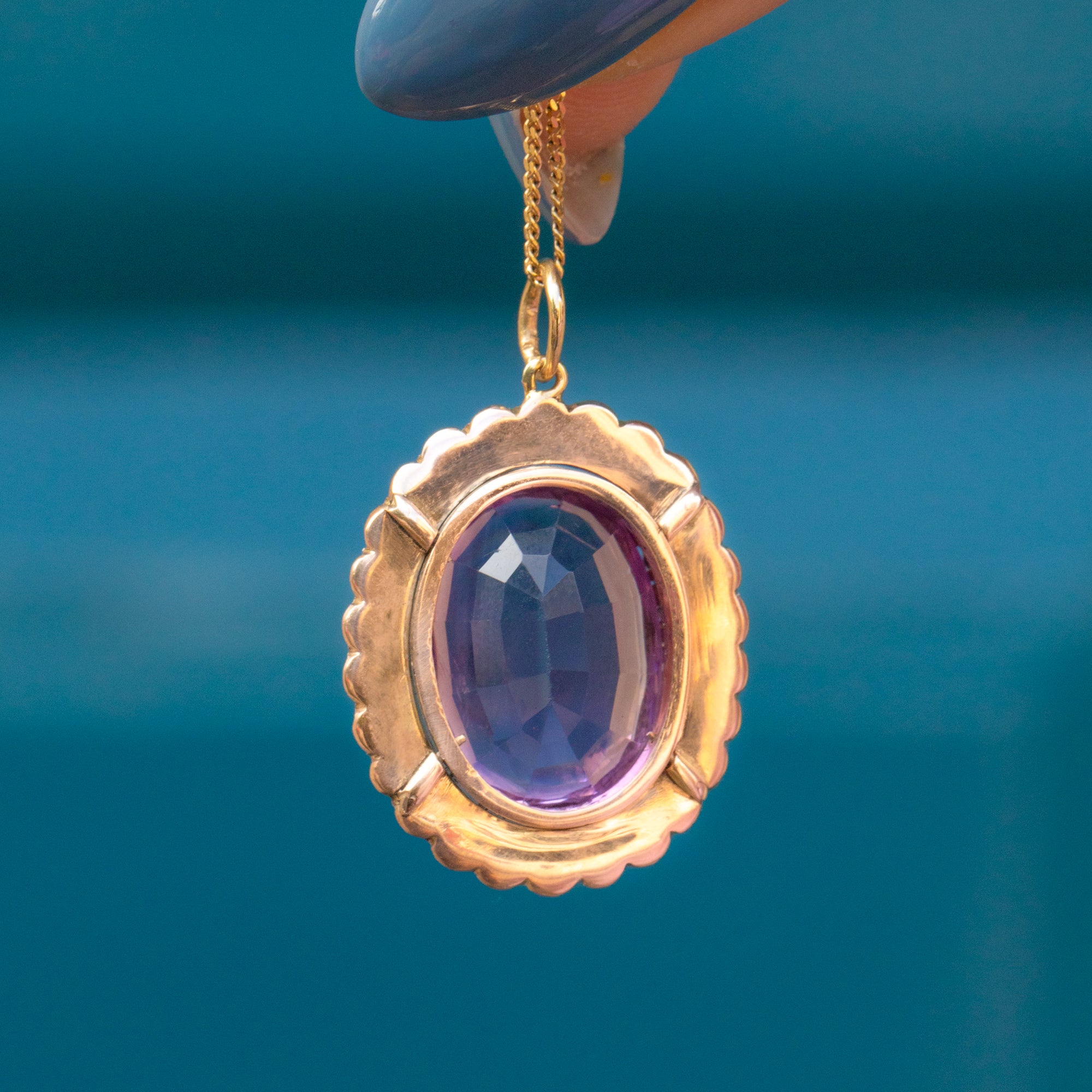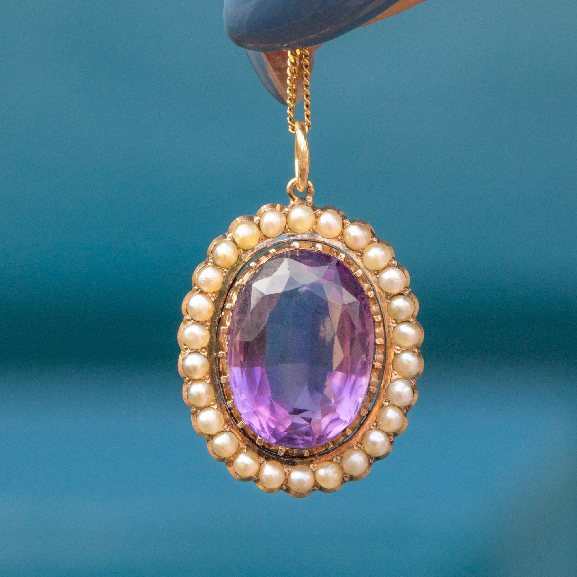 VERY GOOD. This Victorian 9ct Gold Amethyst Pearl oval pendant is offered in excellent condition. The Pearls are creamy and securely set within their setting. The Amethyst has some fleabites on some of the facets, however, this does not impact its vibrant purple hue and it's securely set! The 9ct Gold is buttery and each claw is present, with only some minor discolouration commensurate with age. Complete with a soldered jump ring, you can wear this phenomenal antique pendant with absolute confidence!
