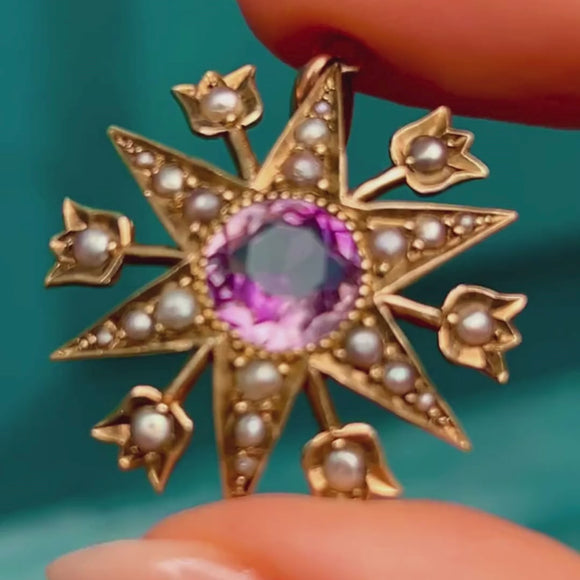 Victorian 9ct Gold Amethyst Pearl Starburst Pendant, 1.45ct Amethyst