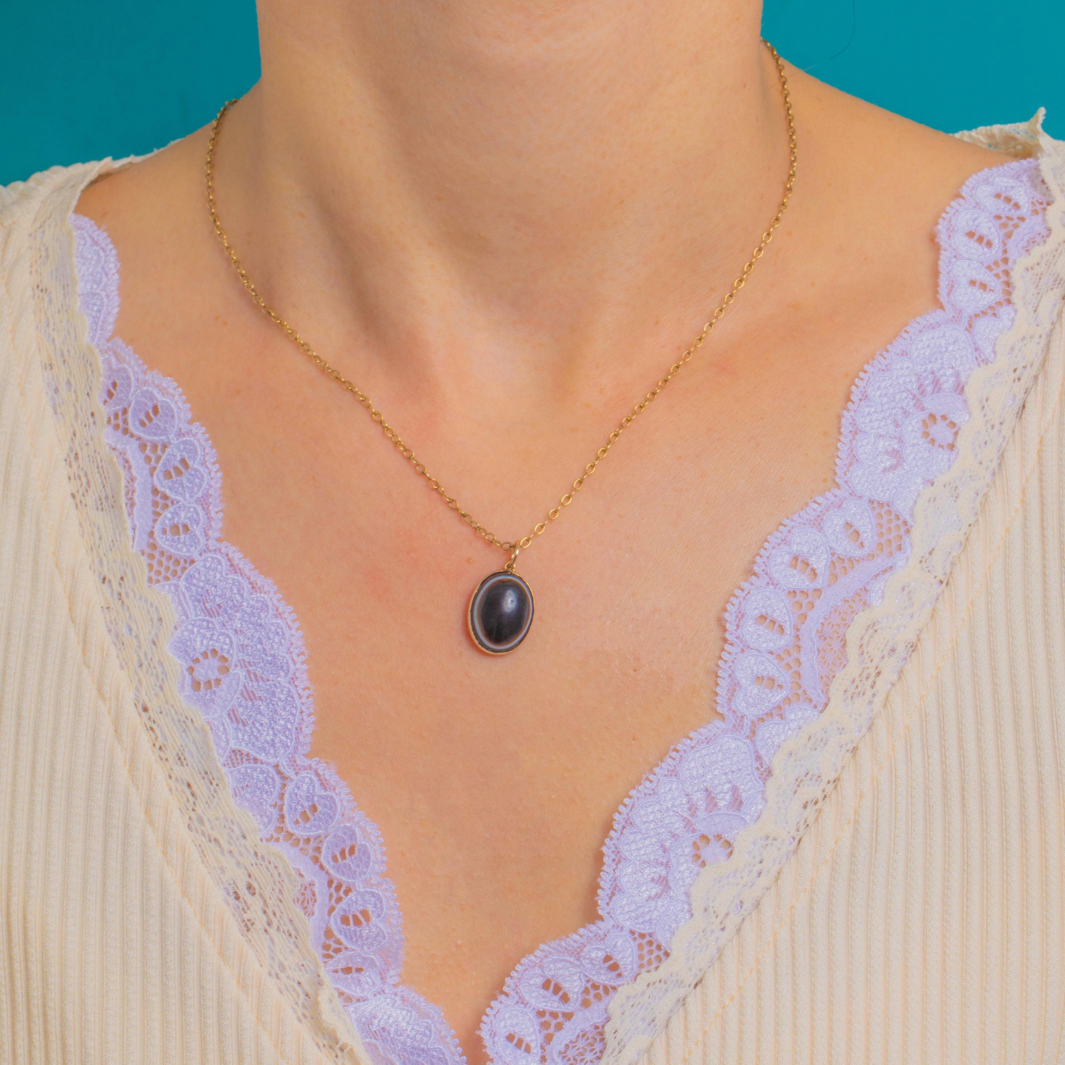 The warm 9ct Gold bezel, petite top loop and closed back speak to classic 19th-century craftsmanship. Subtle, elegant and timeless, it’s an effortless pop of monochrome that layers beautifully or shines on its own.