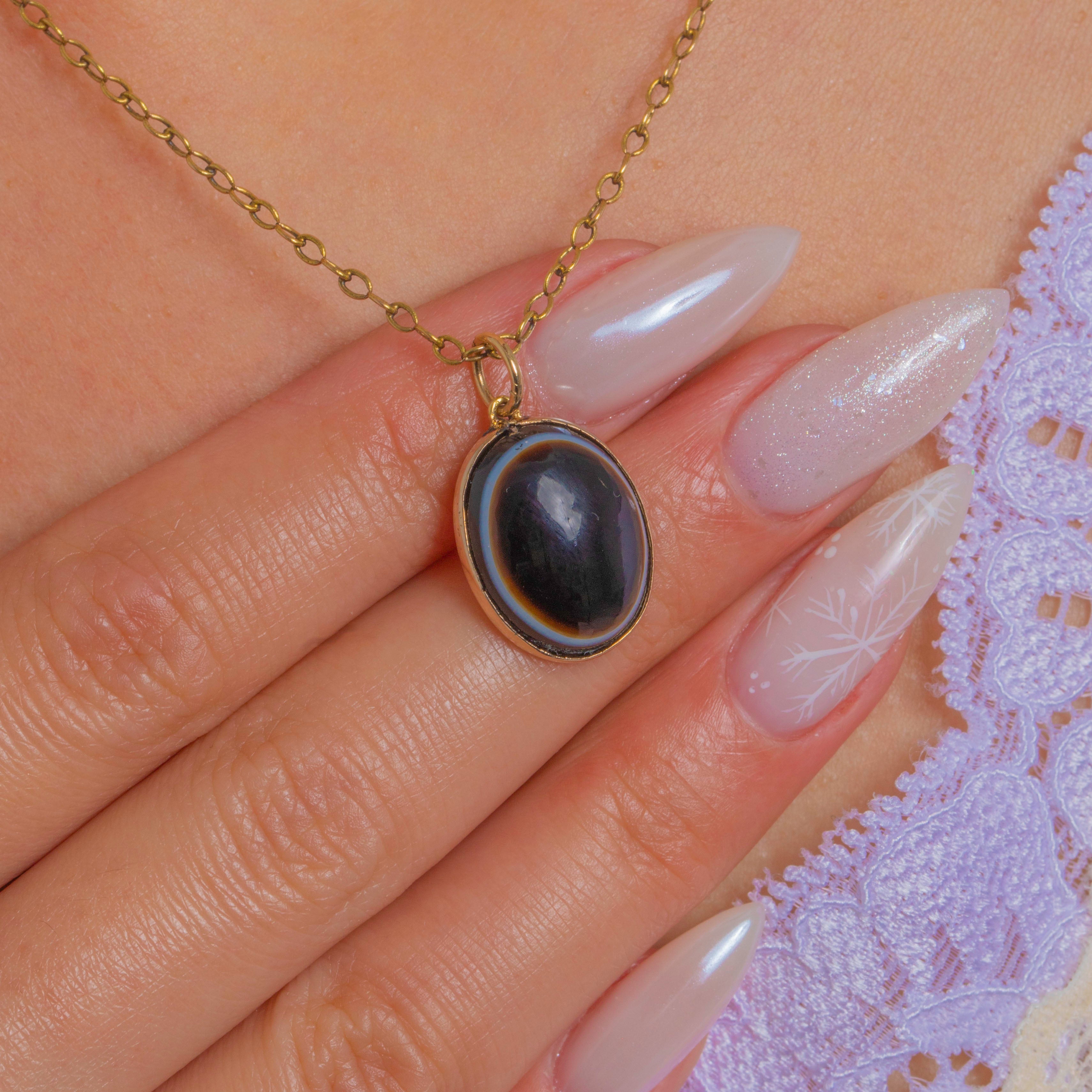 A delicate Victorian treasure, this petite pendant showcases a mesmerising Banded "bullseye" Agate cabochon: a deep, inky centre ringed by pale grey-white. Glossy and high-domed, the stone sits in a simple bezel that lets the natural pattern take centre stage.