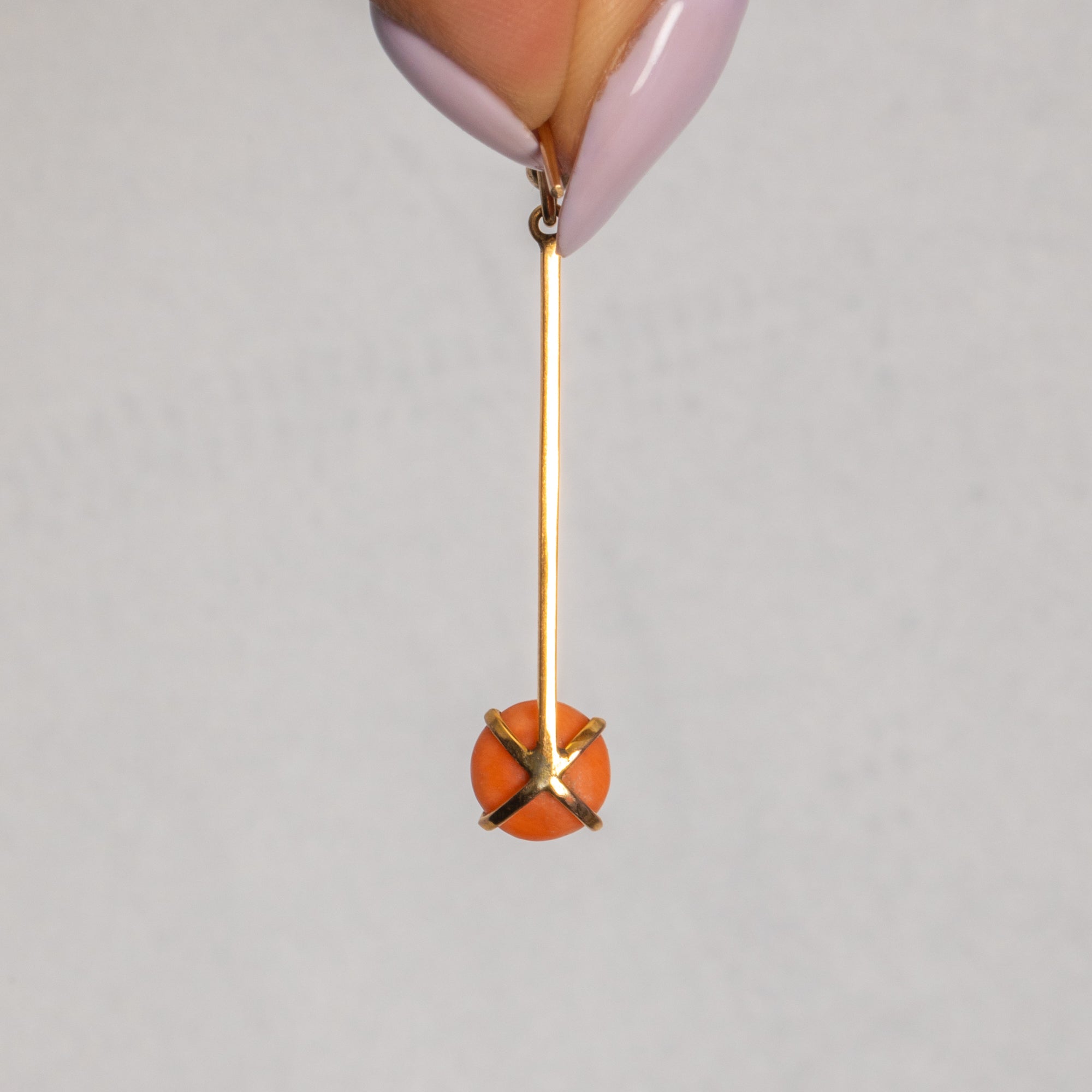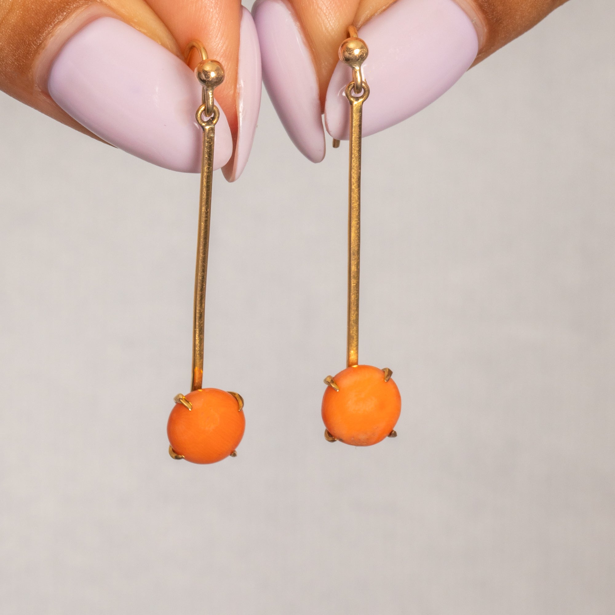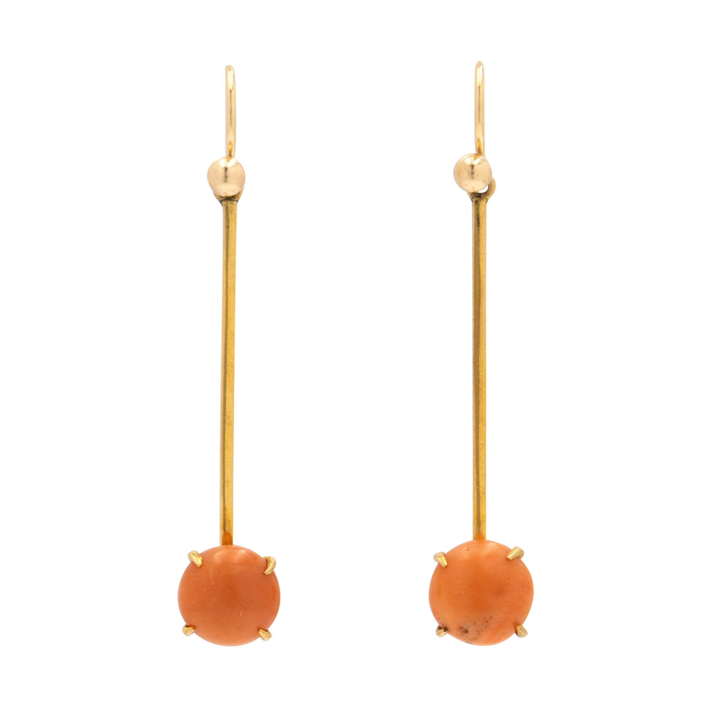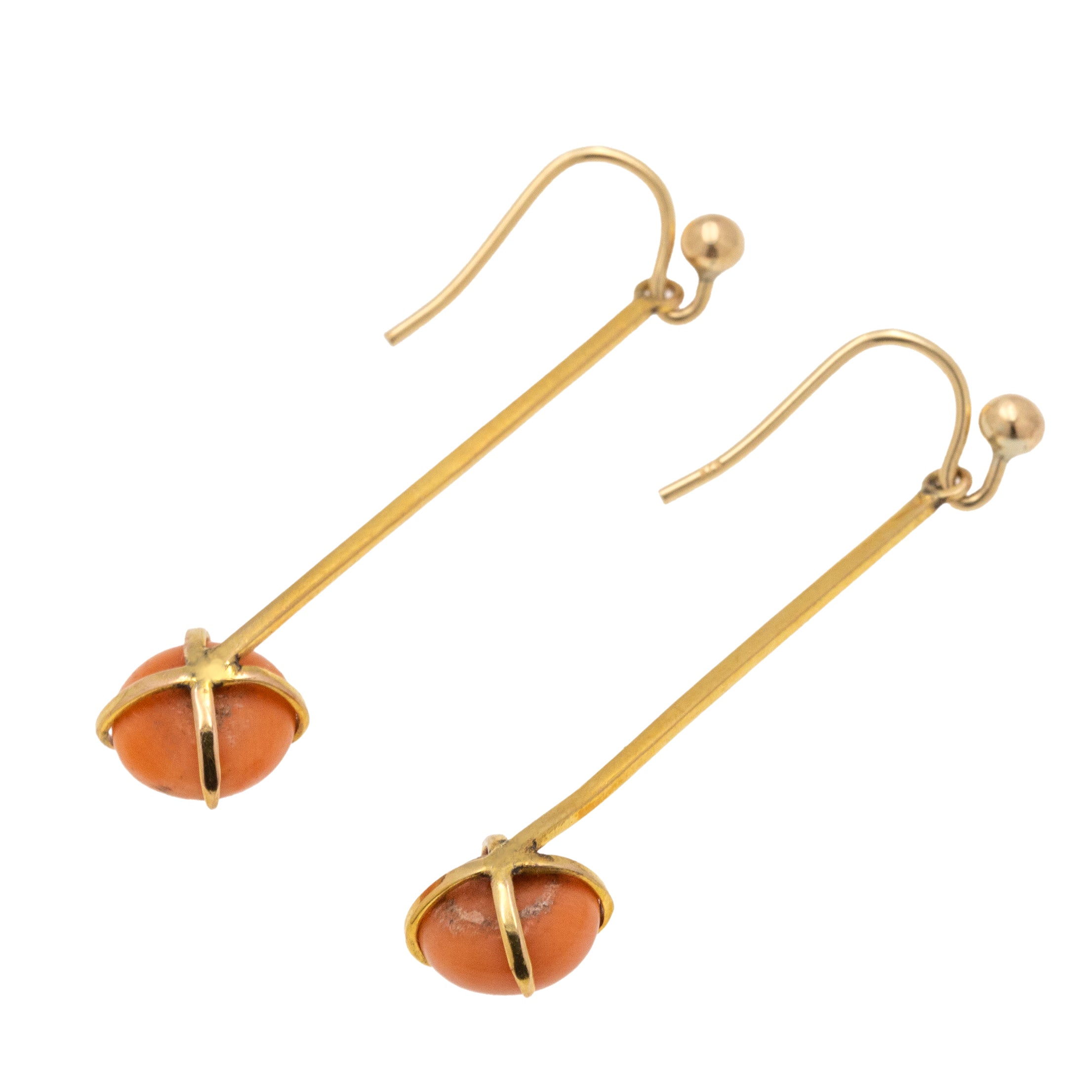 These Victorian 9ct Gold Coral drop earrings are a sophisticated pair! Enhance your attire with these Victorian earrings, adorned with a delicately smooth droplet of peachy pink Coral suspended from elegant Gold bars, perfect for any occasion.