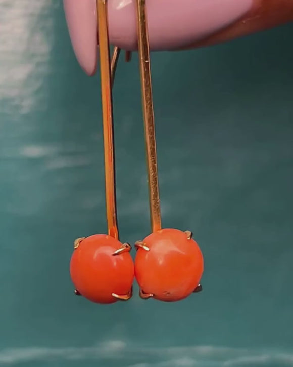 VERY GOOD. These Victorian 9ct Gold Coral drop earrings are offered in very good condition. The 9ct Gold is brightly saturated and free from dents or scuffs, each Coral has remained firmly set within their claws. One of the Coral exhibits minor nibbles at the bottom, however it is held securely within its setting, and the other one is perfectly smooth. There is some minor wear on the back of the Corals, but this cannot be seen while the earrings are worn. Each component is securely affixed and the generous hooks provide secure and comfortable wear!