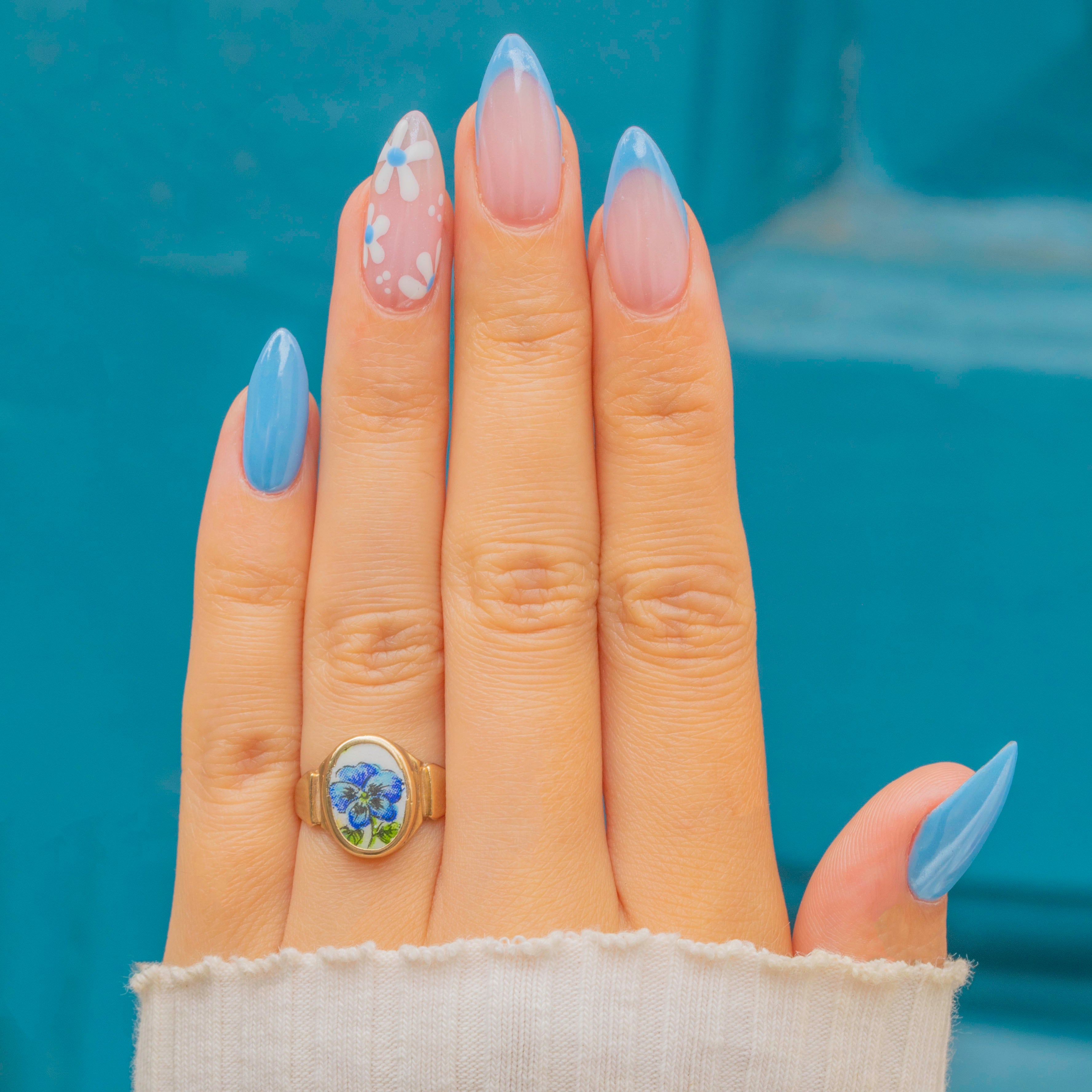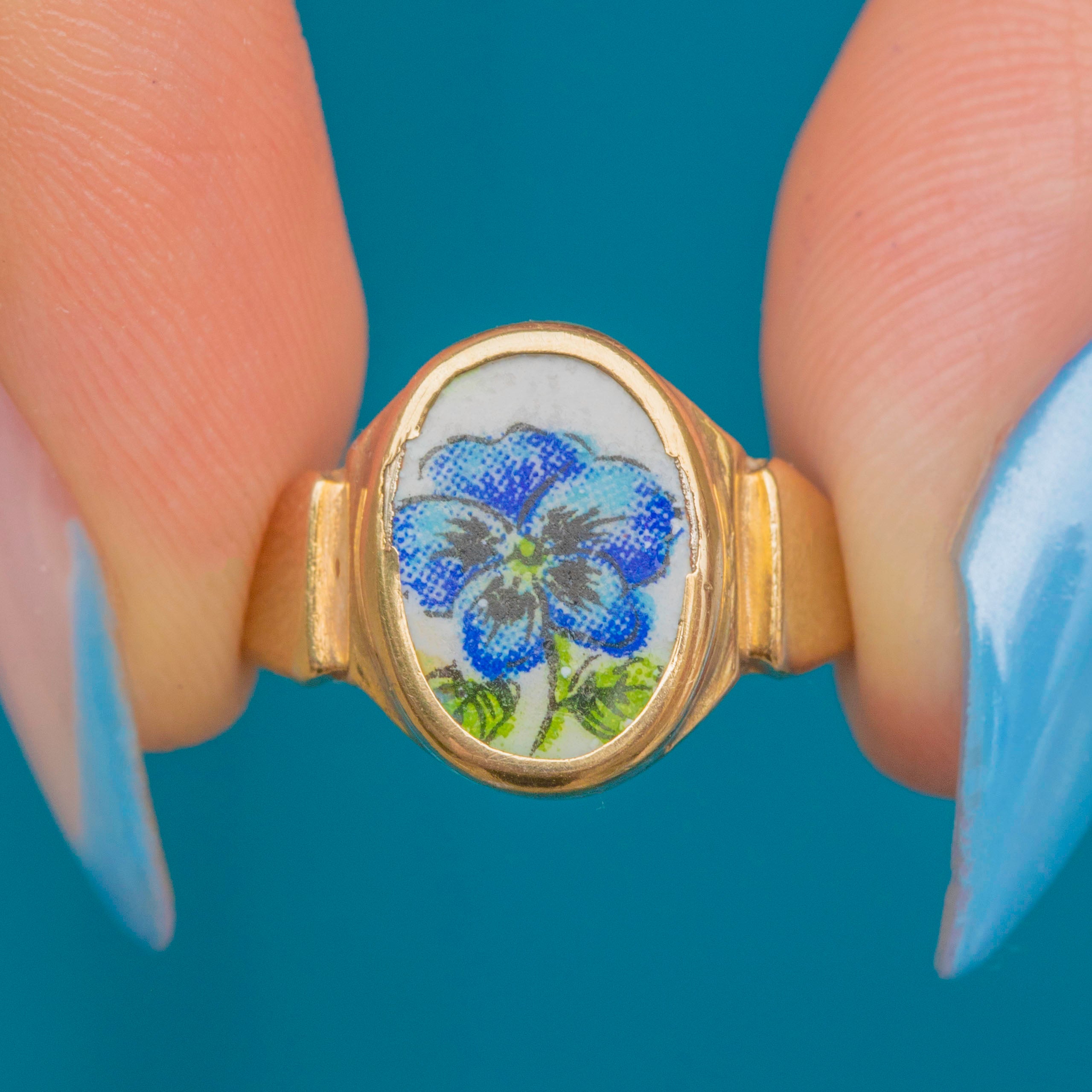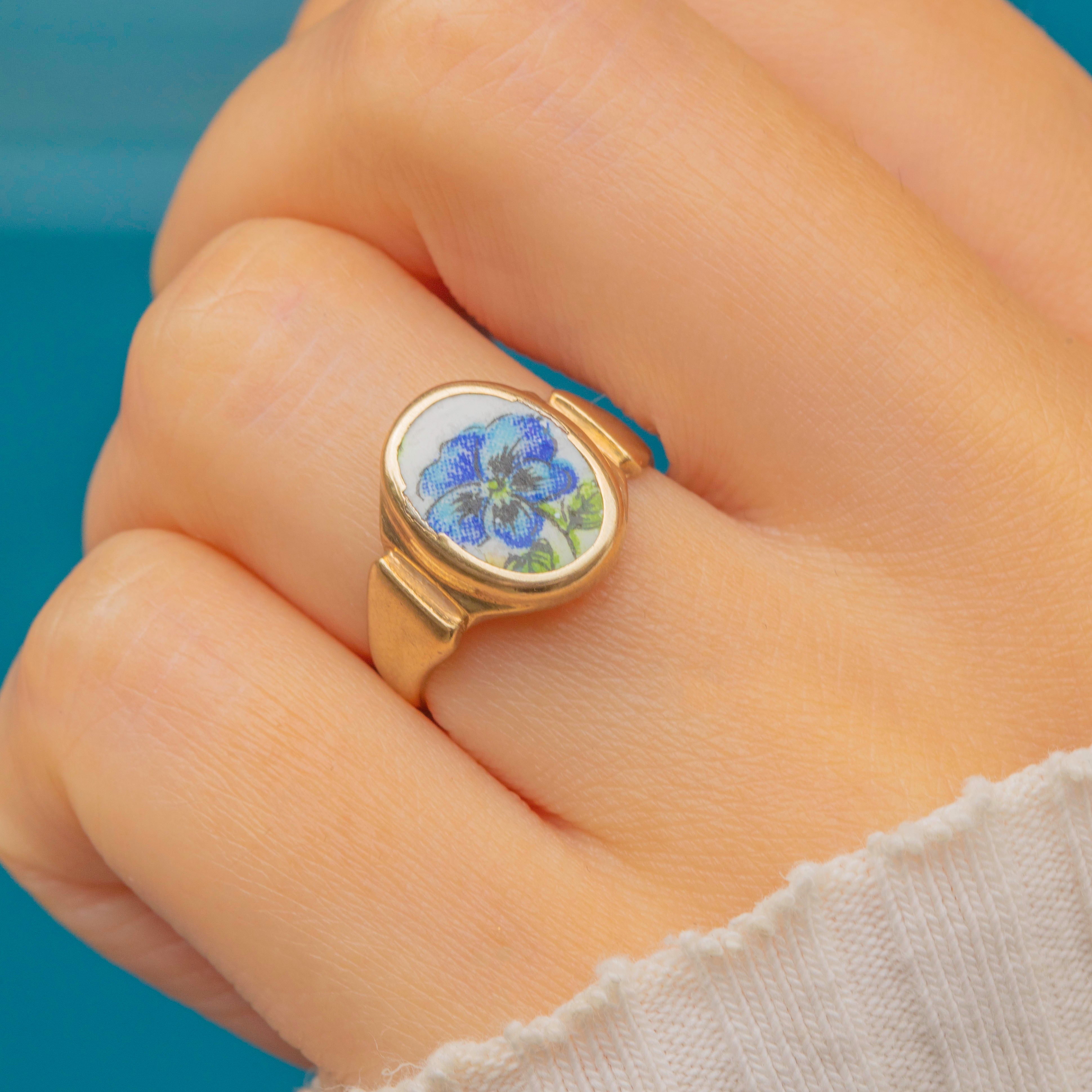 An adorable Victorian signet ring, adorned with a charming blue and white Enamel pansy motif!