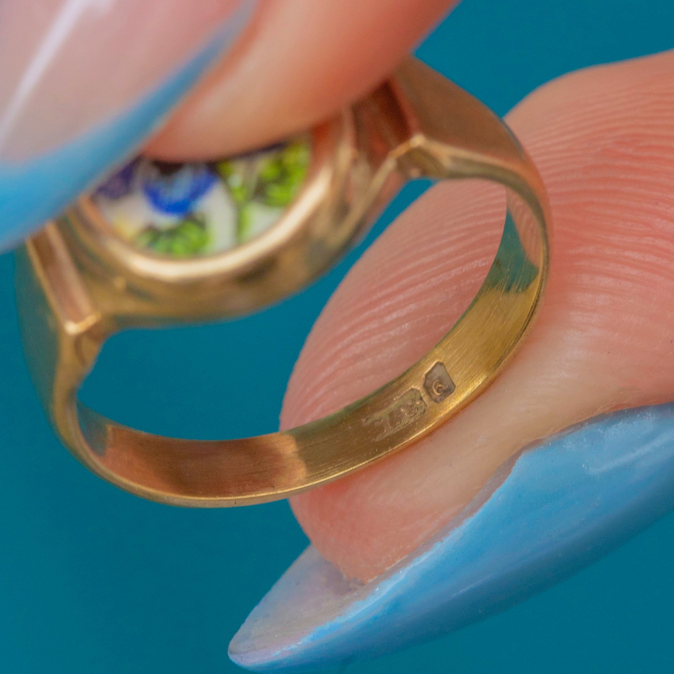VERY GOOD-EXCELLENT: The 9ct Gold is bright and glossy, with its smooth band providing comfortable wear. The Enamel is intricately detailed and has retained a nice colour. There are two areas of wear on the bezel setting, but this does not detract from the overall impact of the ring and the Enamel remains undamaged. With little else to note, you can wear this Victorian signet ring with utmost confidence.