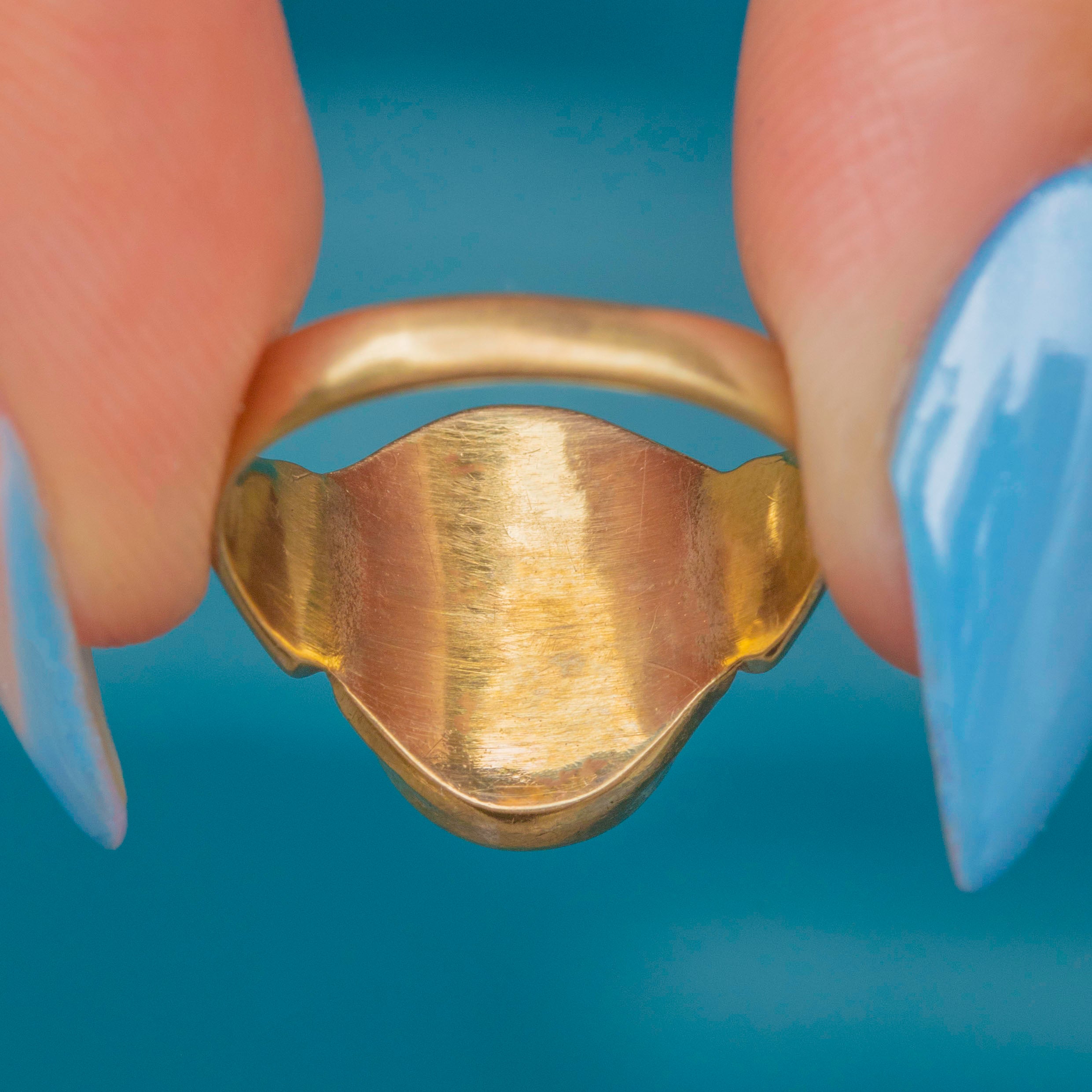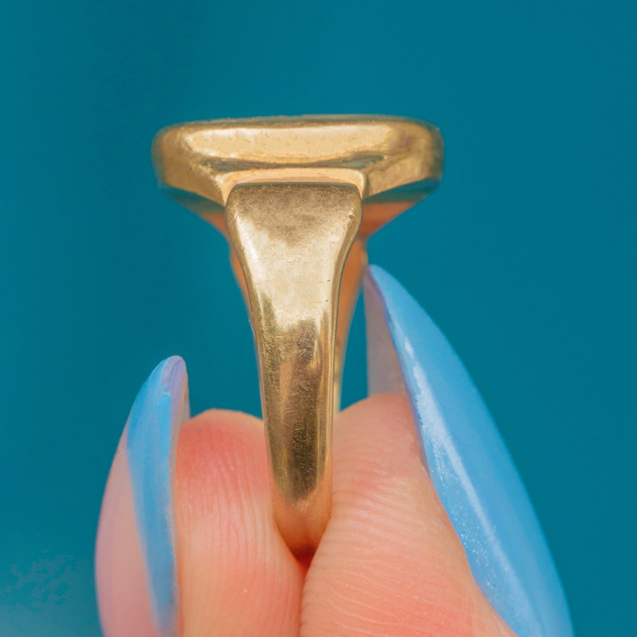 This signet ring is crafted from warm and glossy 9ct Gold, with its smooth band and ring face providing ample finger coverage and comfortable wear. A petite size G, this antique signet will sit nicely on your pinky and is sure to add ample charm to your collection.