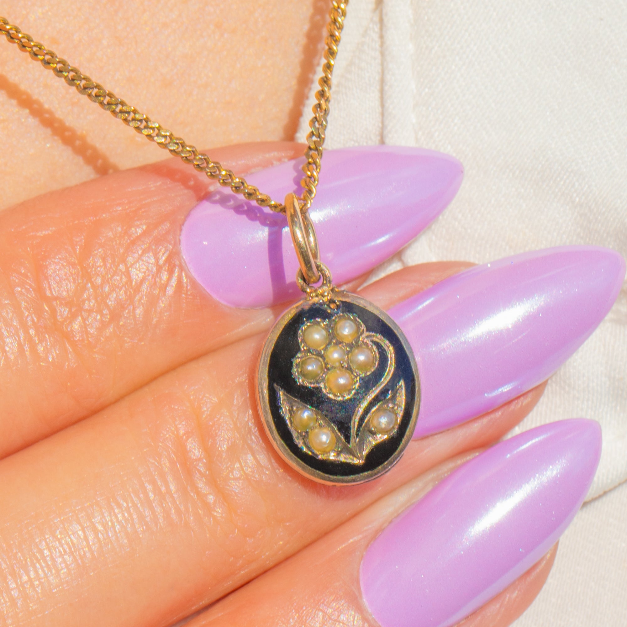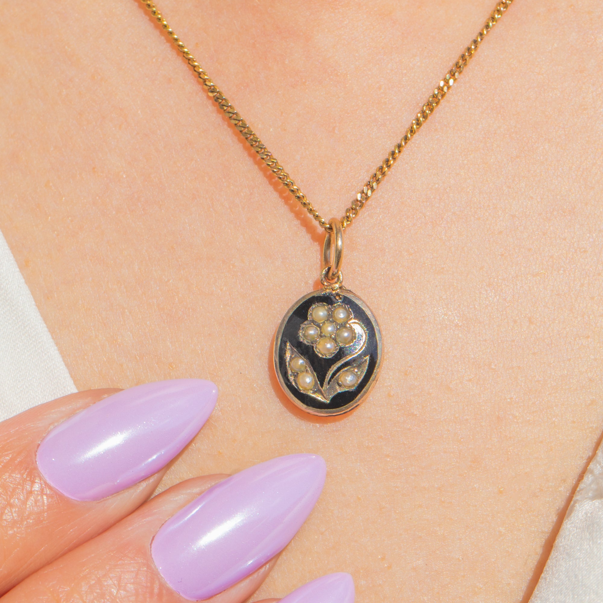 Mit Liebe gefertigt, sind die Saatperlen als kleine Blüte auf glänzendem Emaille arrangiert; die Goldfassung und der schlichte Ösenring vollenden die elegante Medaillon-Silhouette. Ein zeitloses Erinnerungsstück mit bleibendem Victorian Charme.