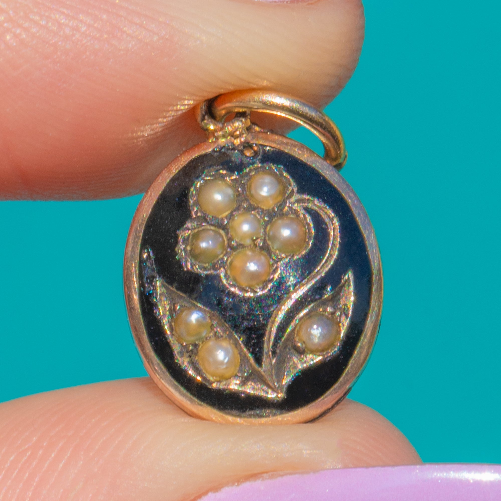 Ein bezaubernder antiker Traueranhänger: Dieses zierliche ovale Medaillon vereint tiefschwarzes Emaille mit einer leuchtenden Saatperlen-Vergissmeinnicht-Blüte, gefasst in warmem 9ct Gold. Die kontrastreiche Farbgebung und das anrührende florale Motiv spiegeln die Sentimentalität und Eleganz des Victorian Designs im Miniaturformat wider.