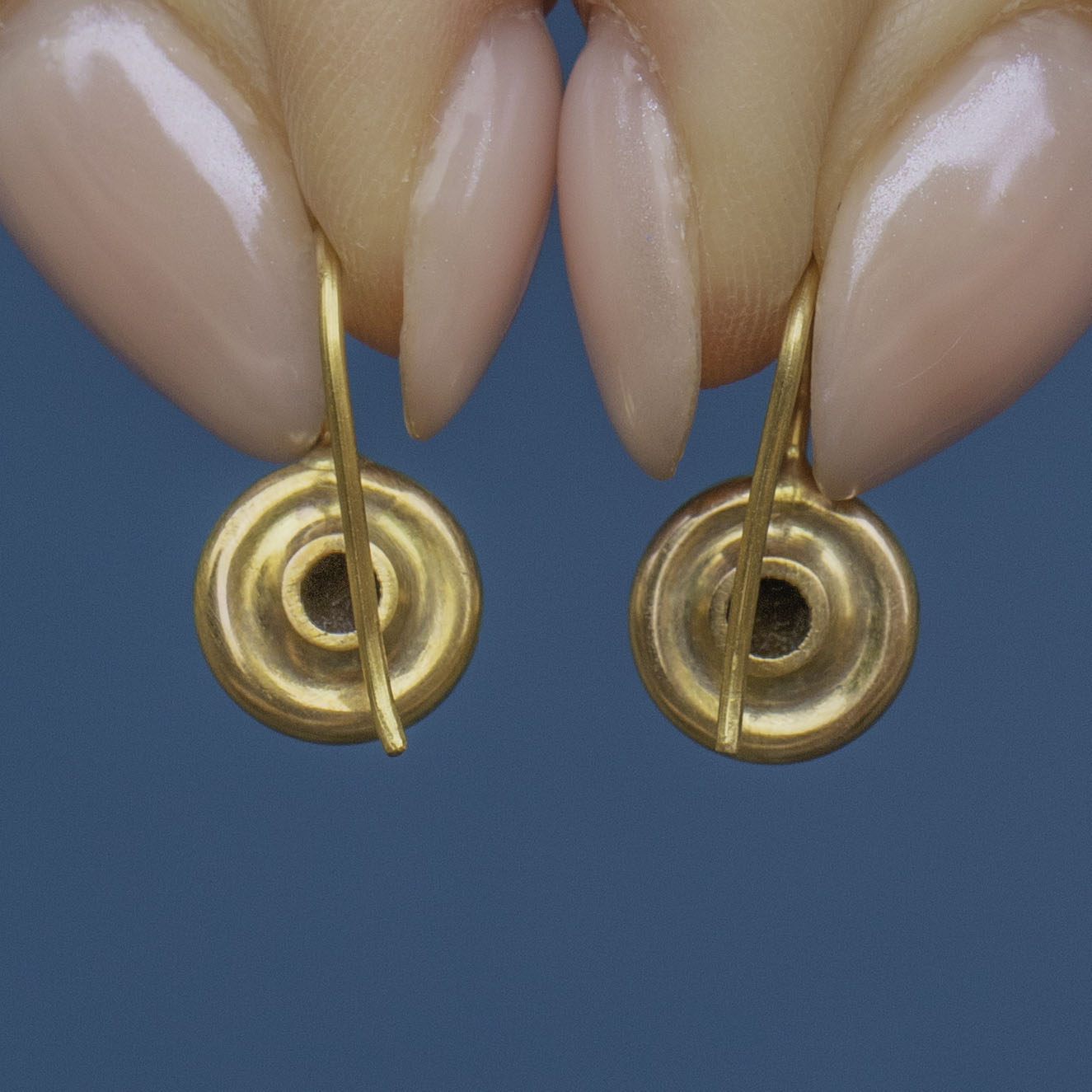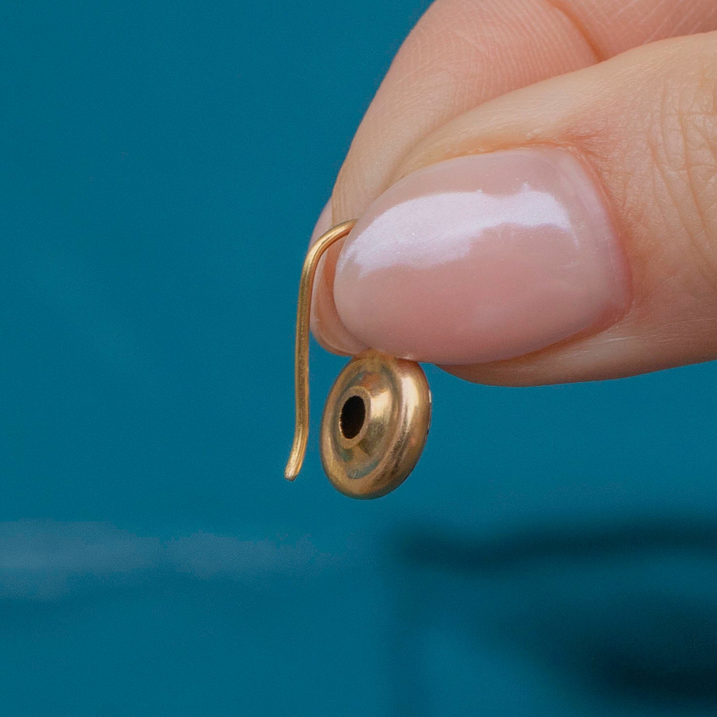 EXCELLENT. These Victorian 9ct Gold engraved button earrings are in excellent condition! The engravings are crisp and the Gold has a buttery hue throughout. Both ear hooks are securely soldered directly on to the button allowing you to wear this pair with peace of mind.