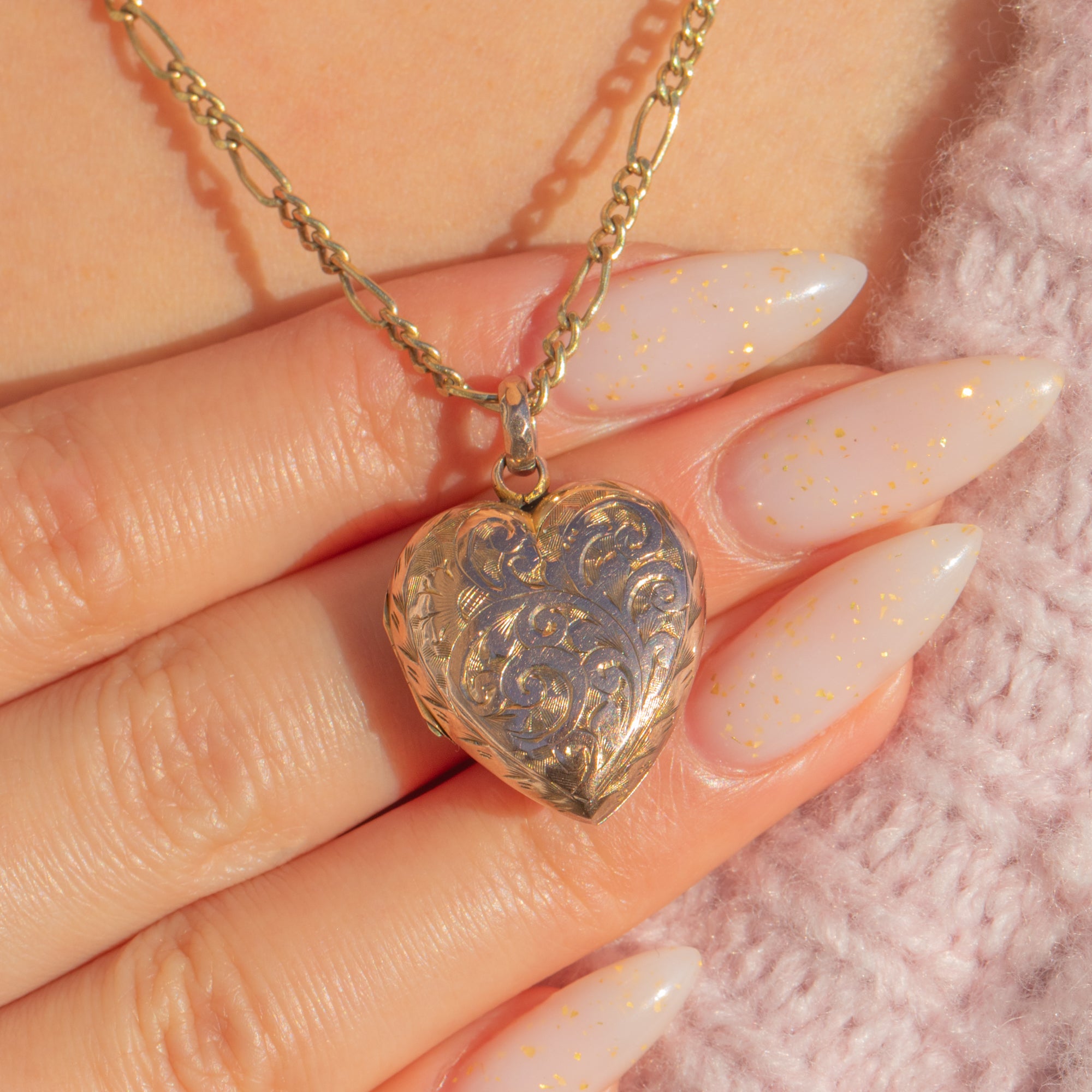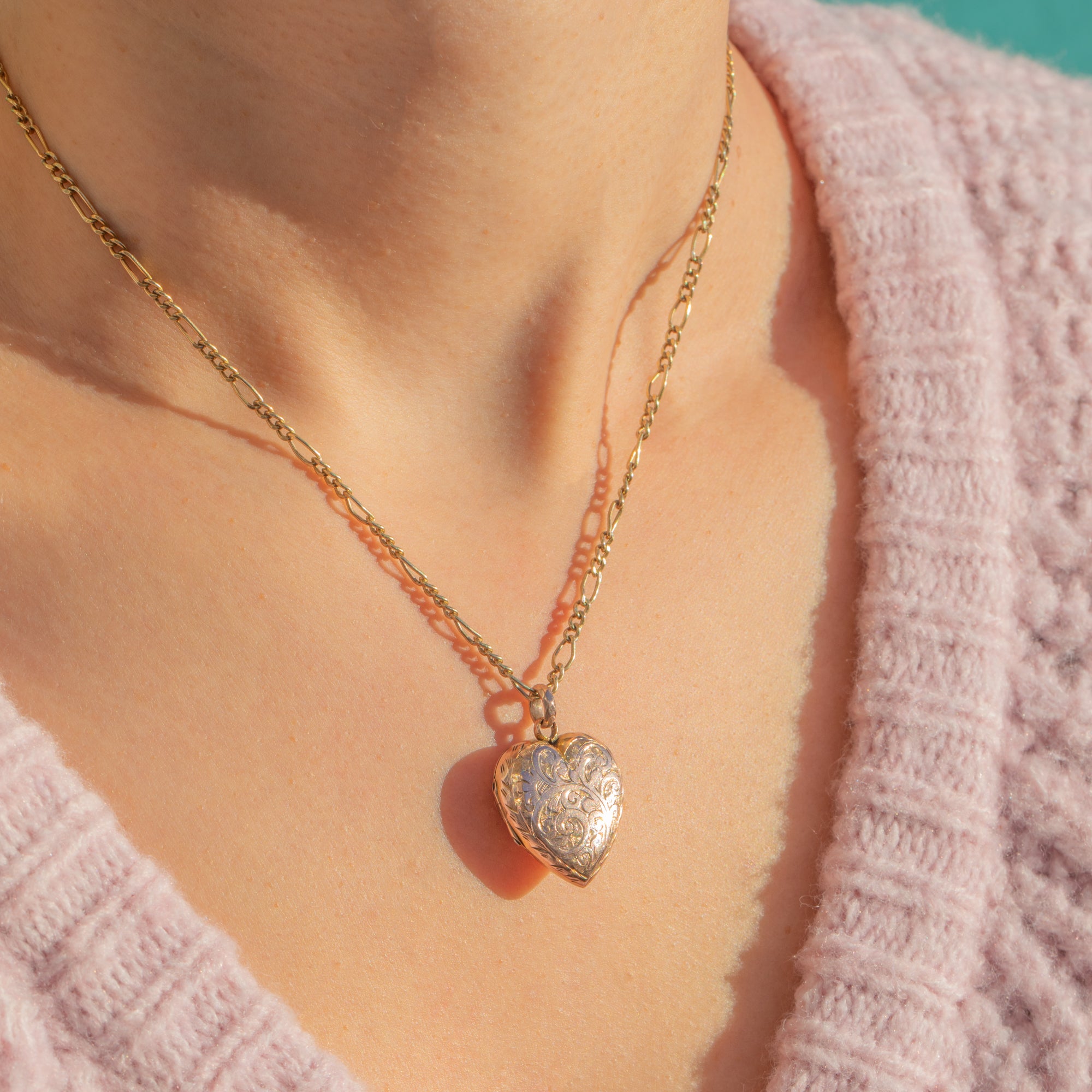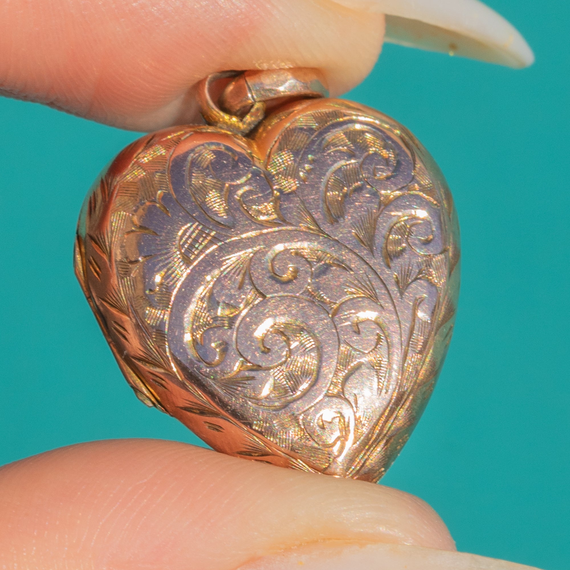 Ein romantisches Victorian Herz-Medaillon mit einem bezaubernden rosigen Schimmer. Die warme Rück- und Vorderseite aus 9 Karat Gold ist mit kunstvoll von Hand gravierten, hell glänzenden Blattvoluten und Zickzackmotiven verziert, die im Licht lebendig wirken. Das sanft gewölbte, „bauchige“ Profil und das zierliche Format machen dieses Schmuckstück zu einem liebenswerten, tragbaren Erinnerungsstück.