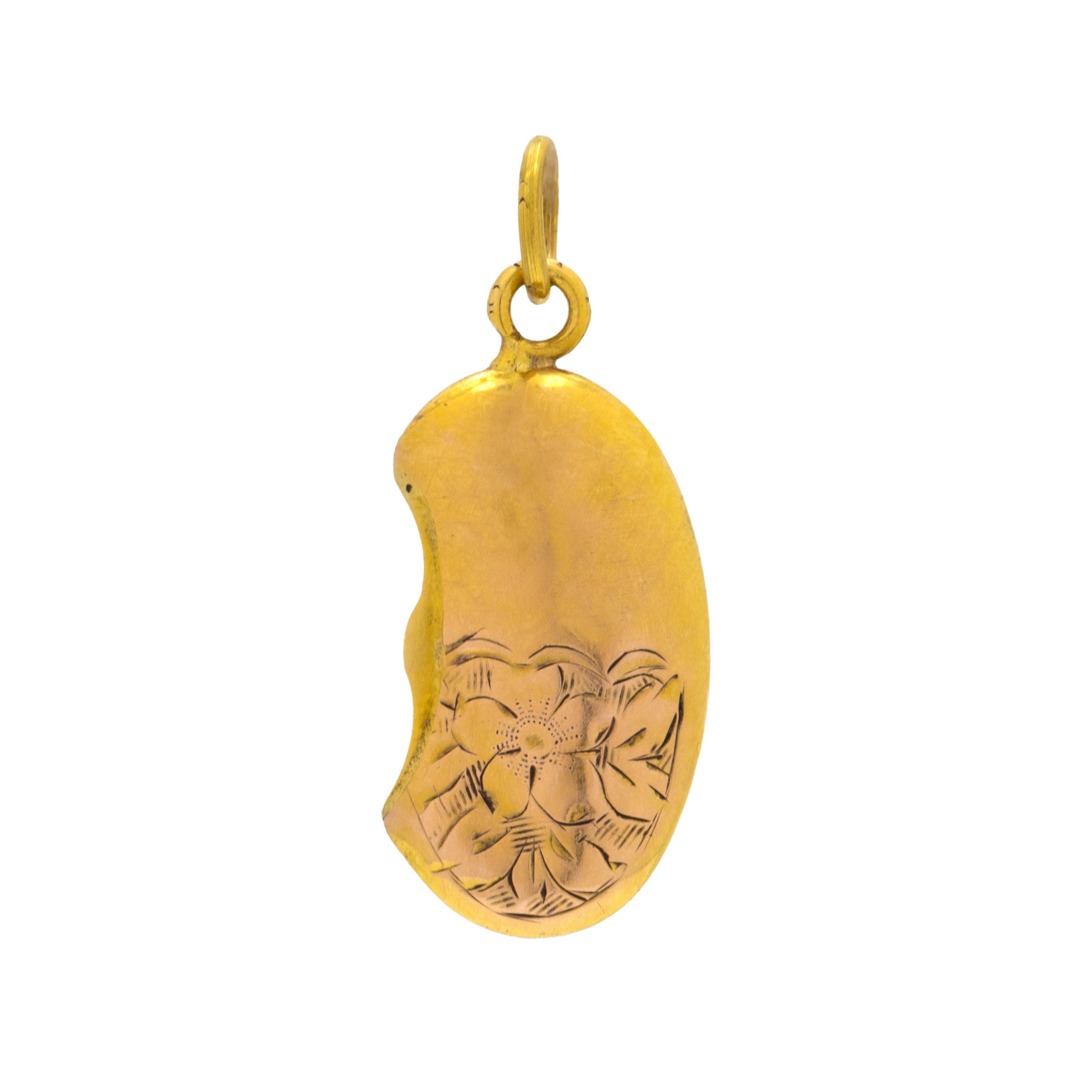 GOOD-VERY GOOD. This Victorian 9ct Gold engraved lucky bean pendant is in great condition. Her 9ct Gold has a wonderful glow and reflective qualities. Under close inspection you can see surface wear with a few dings prominent, but to the right person you can easily see past these antique quirks that we so often see with antique jewellery. The engravings are crisp and add a beautiful floral flare. Complete with a jump ring, she is ready to bring good fortune and well wishes to its lucky wearer!