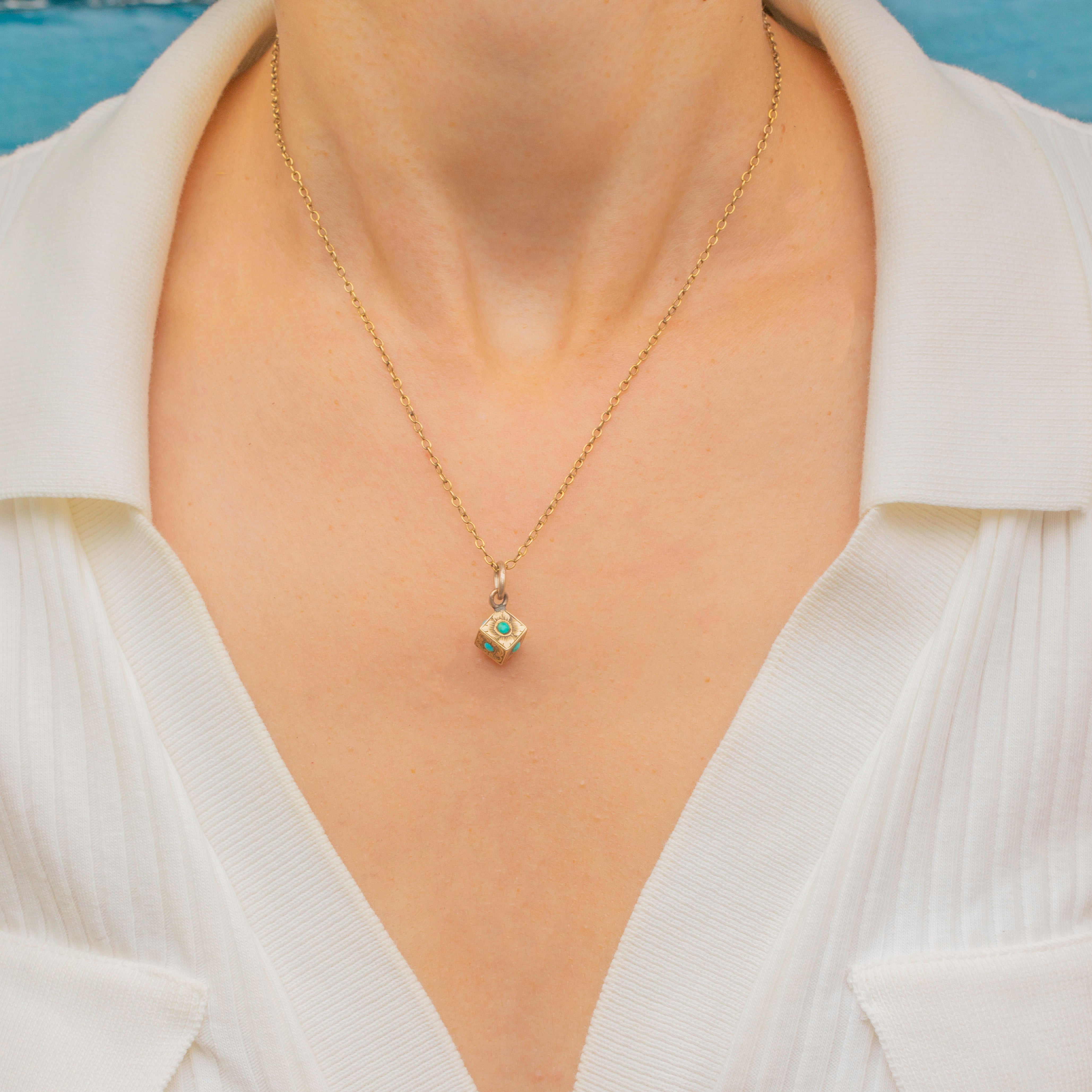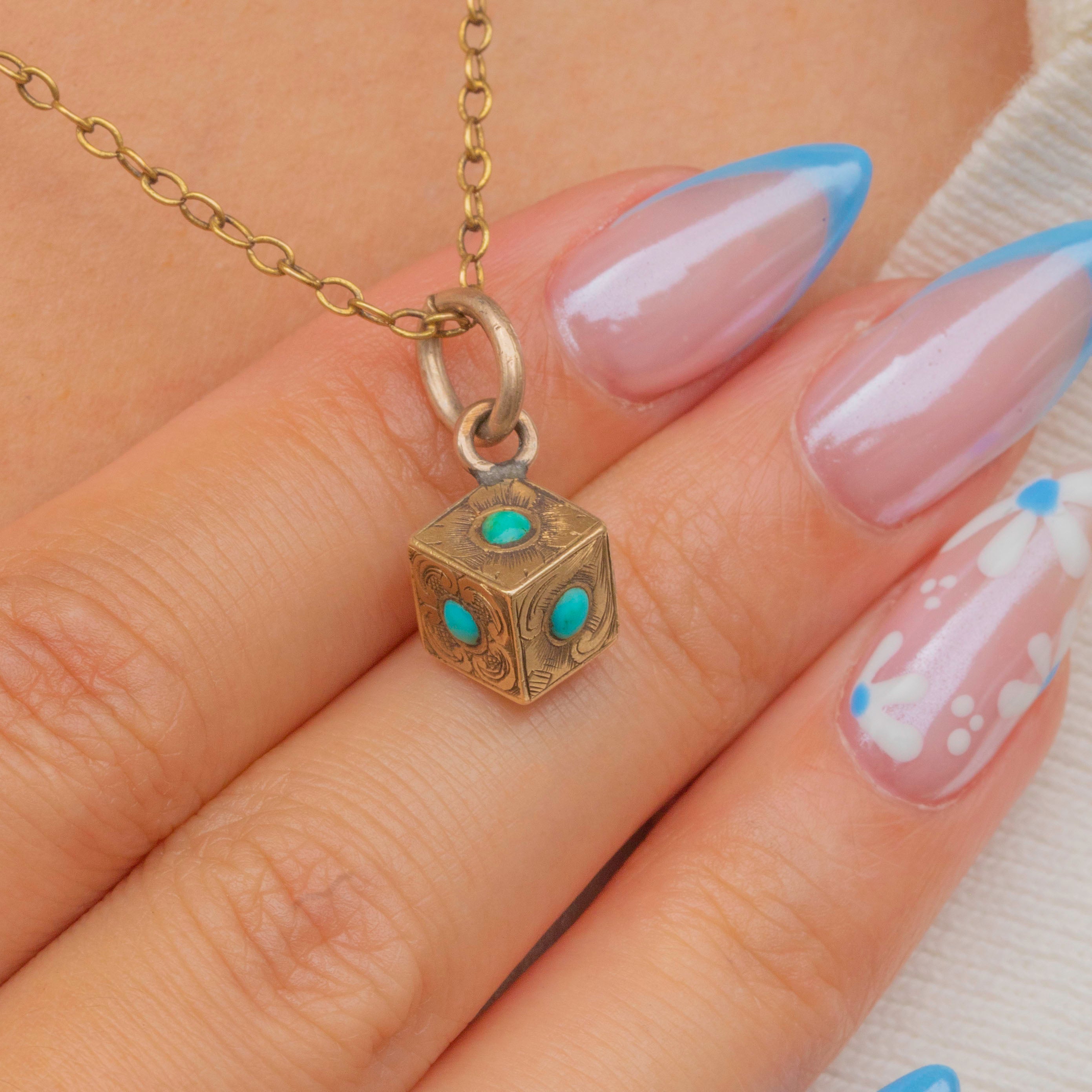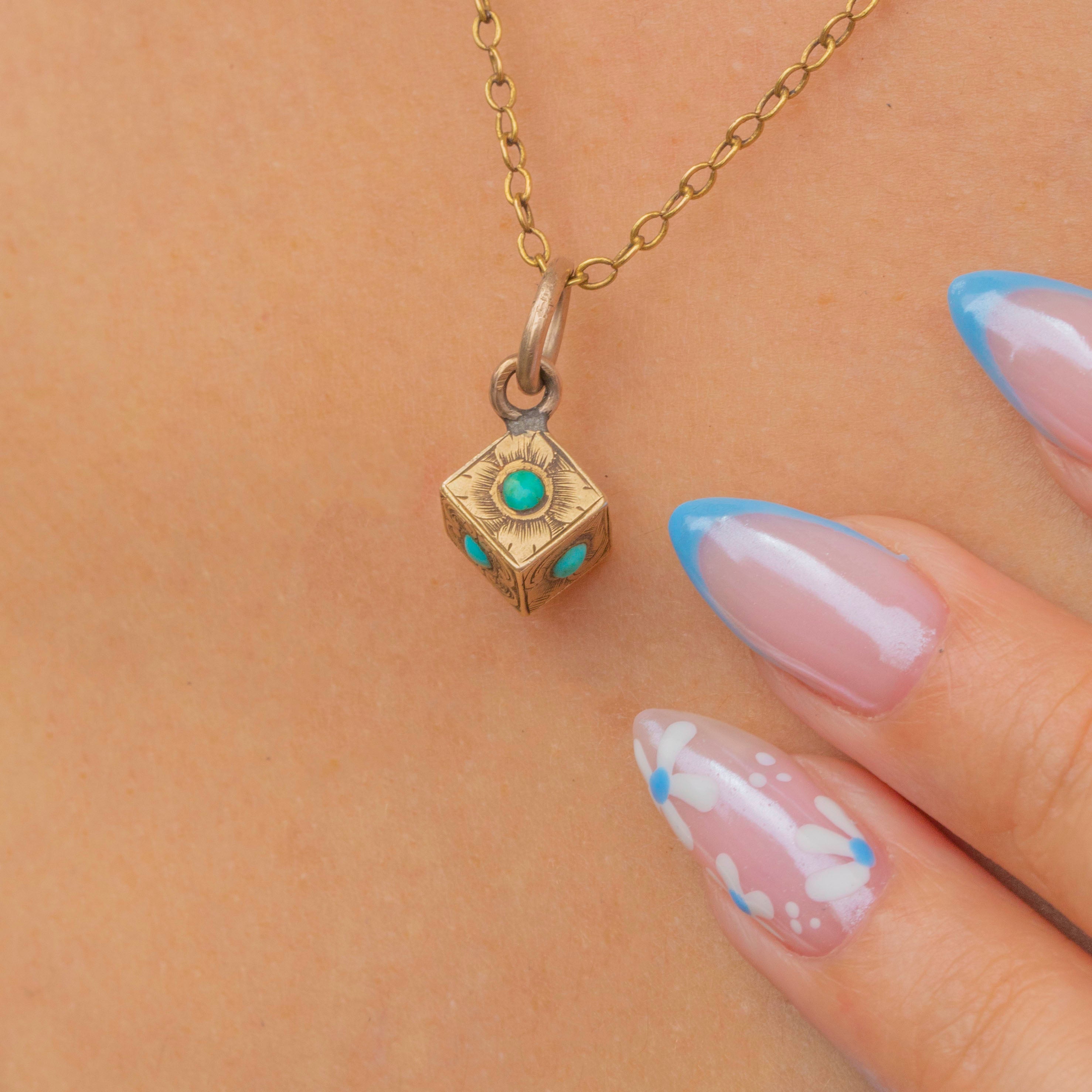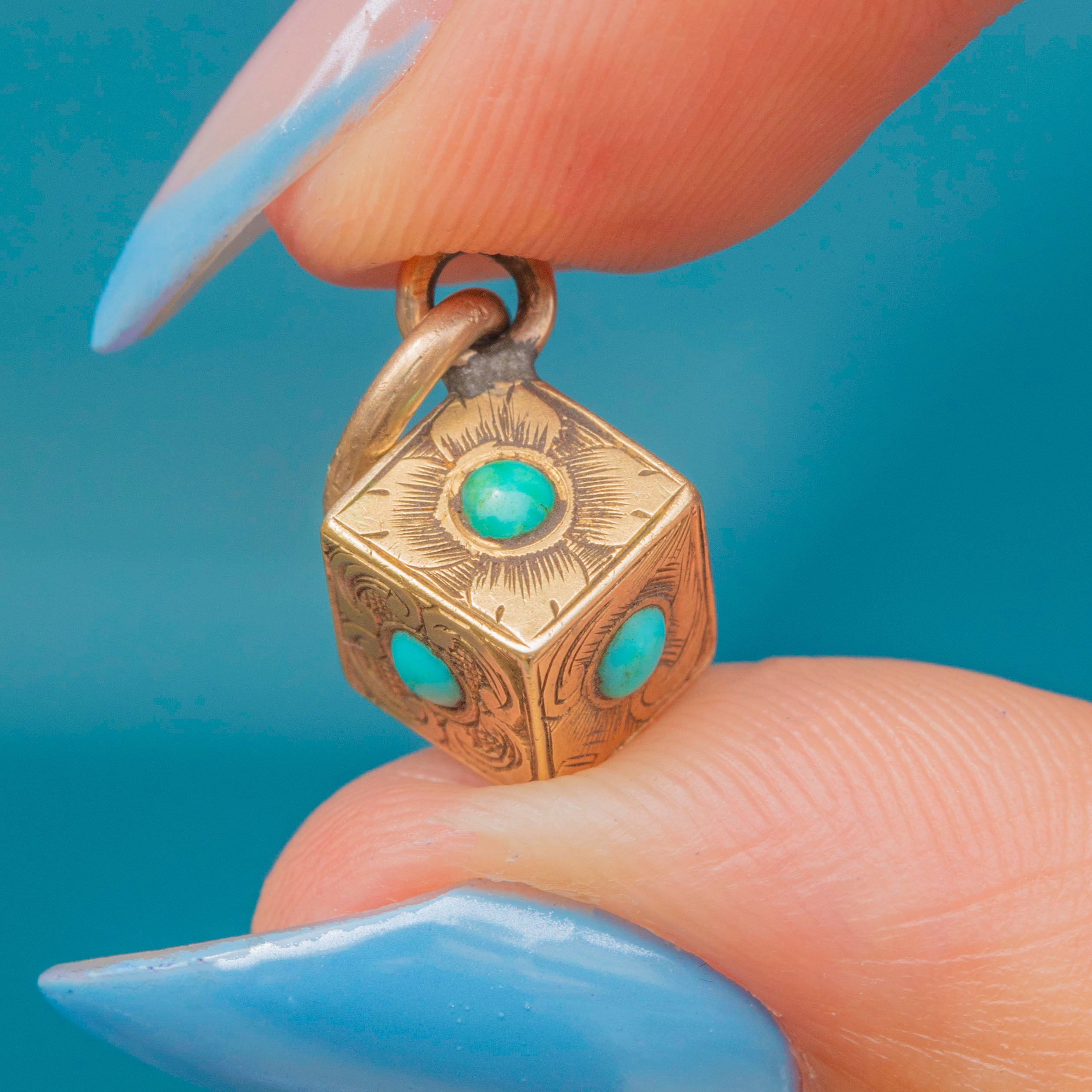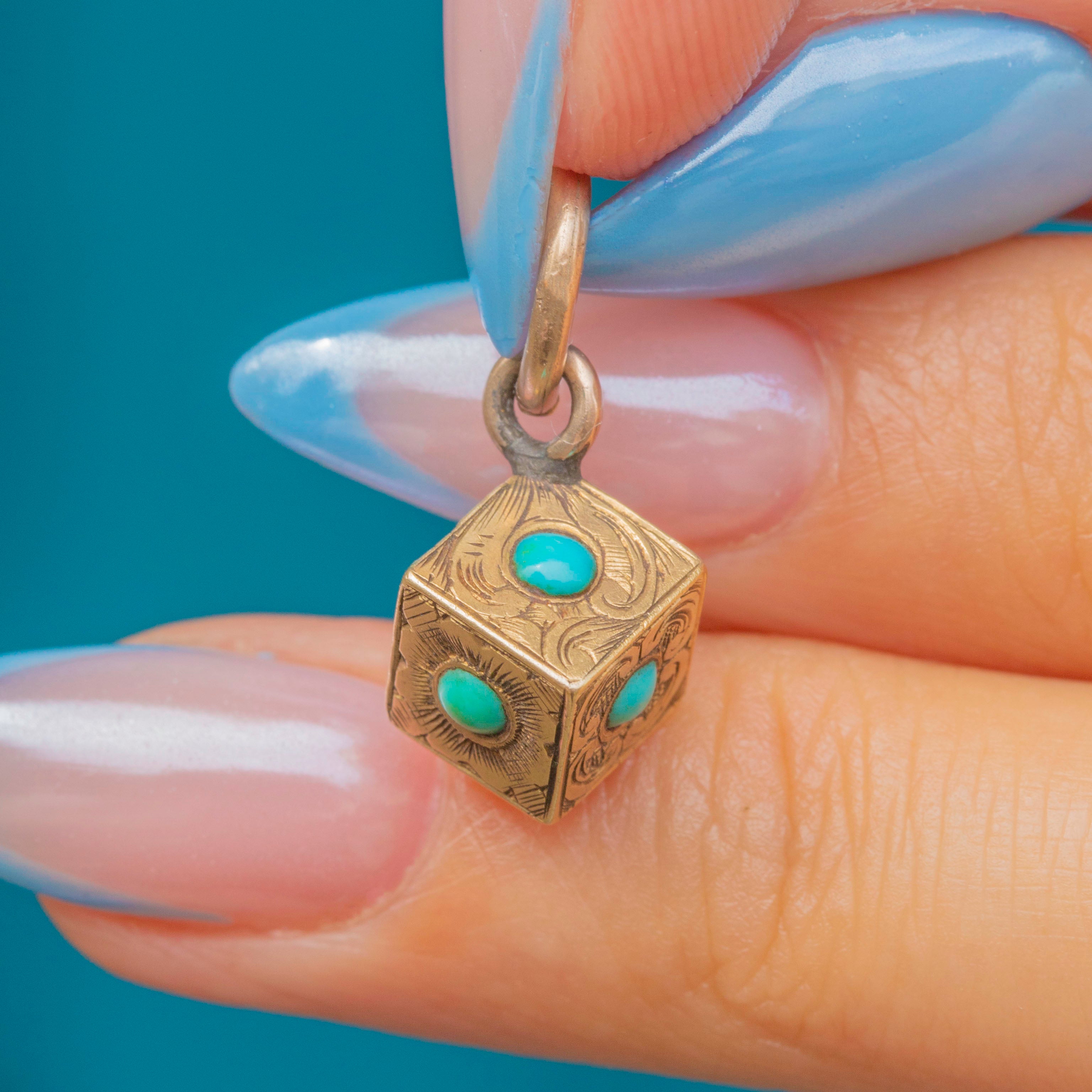 This Victorian charm is intricately formed into a petite cube shape, with each of the six side adorned by a vibrant Turquoise stone. The gemstones are adorned by engraved floral motifs, providing a wonderful texture and depth to the warm 9ct Gold.