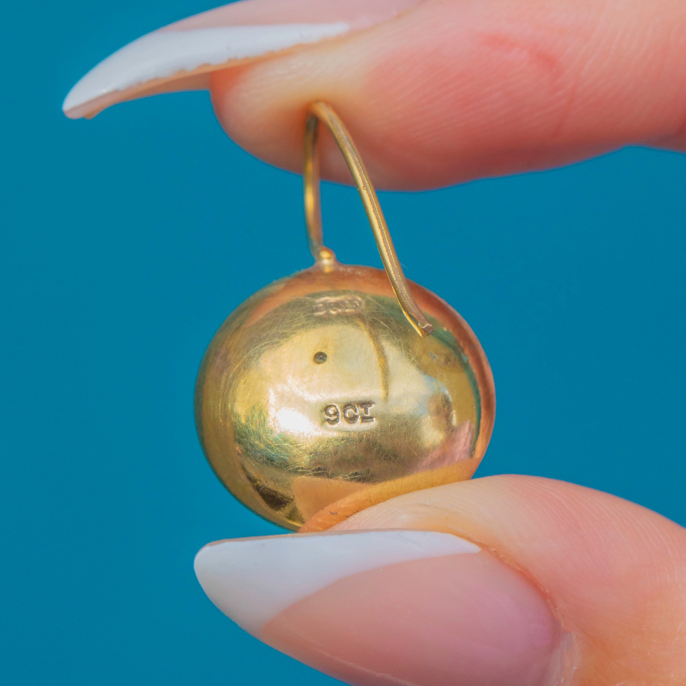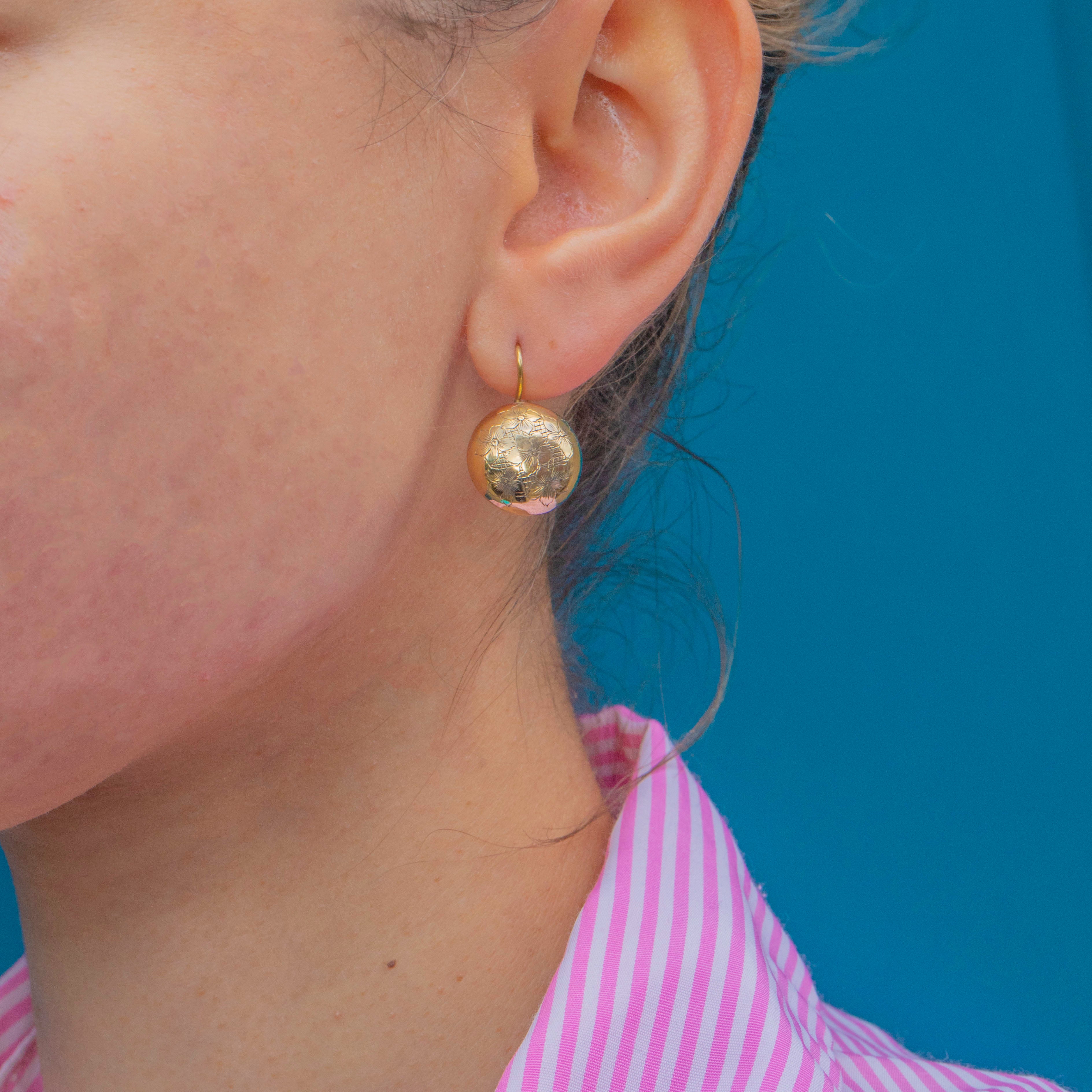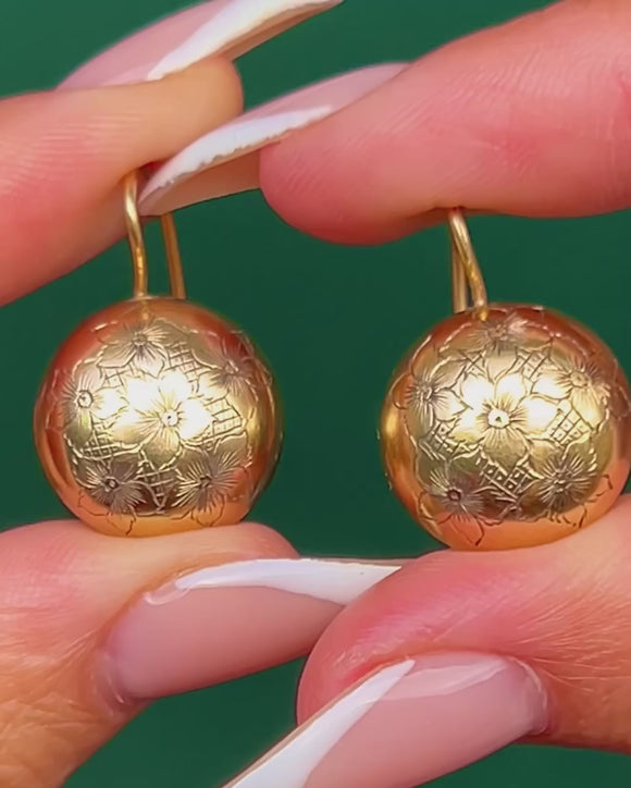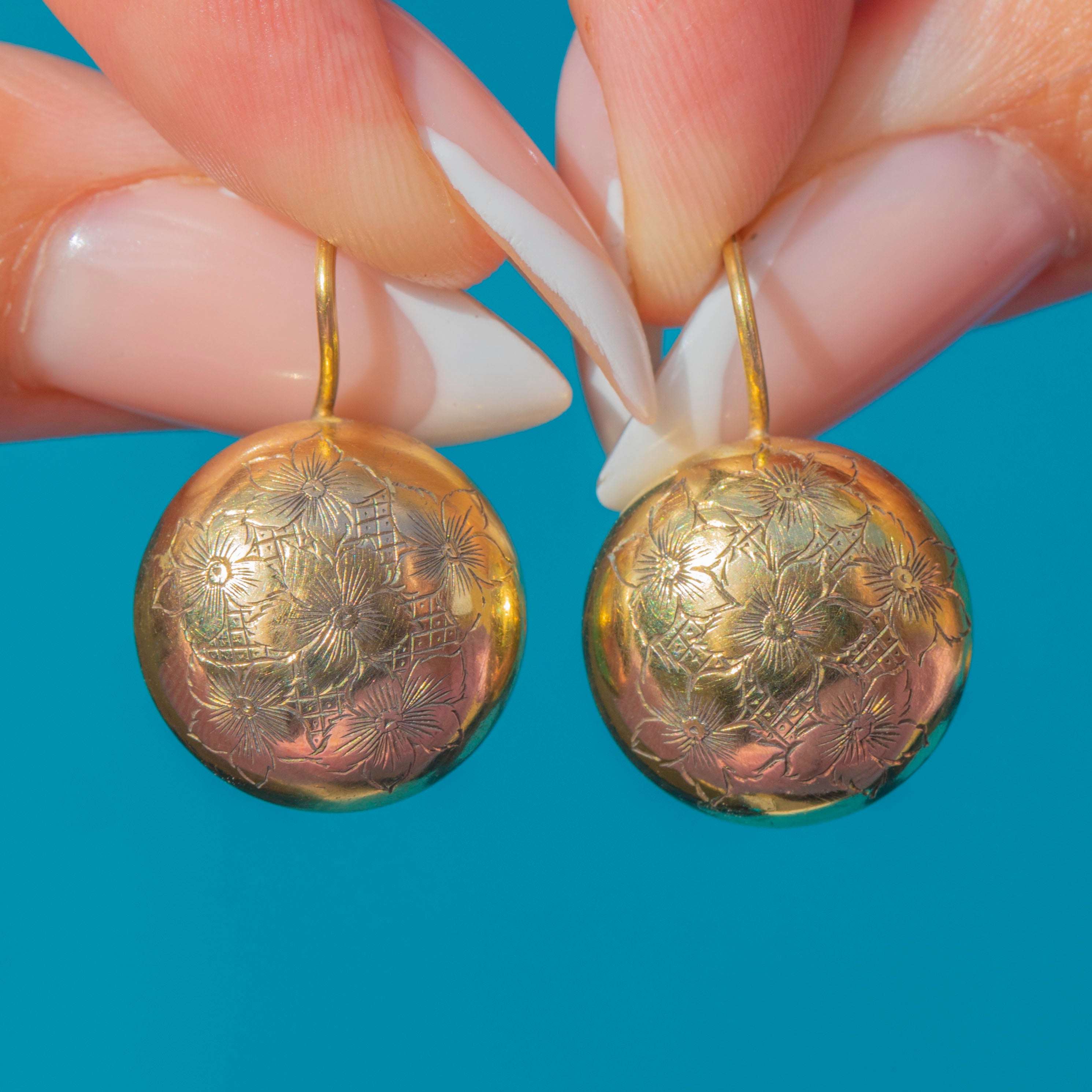 These charming Victorian earrings are crafted in 9ct Gold and designed in a lovely button shape. The fronts are decorated with delicate floral engravings, giving them a beautiful feminine touch that captures the light when worn. Their rounded form and subtle detailing make them an elegant everyday piece, while their history lends them a special antique appeal.